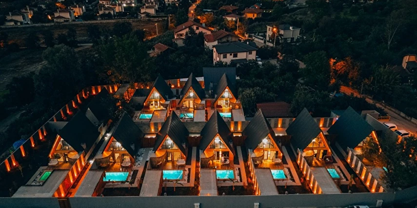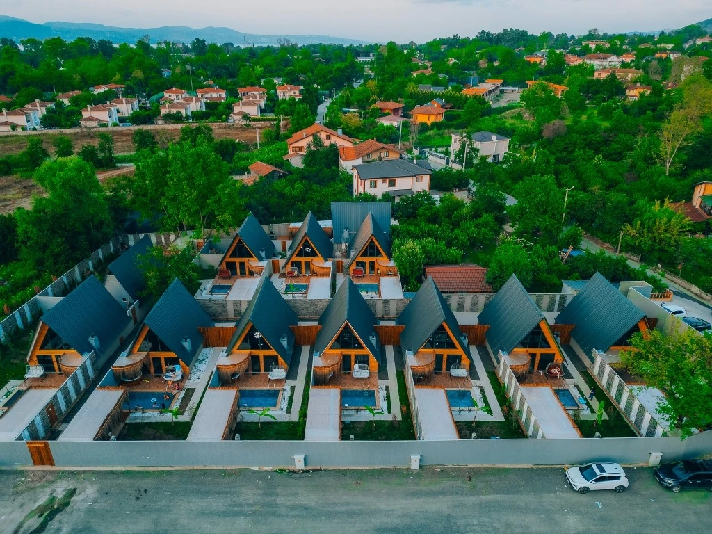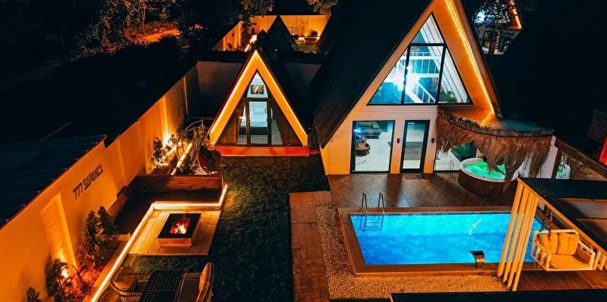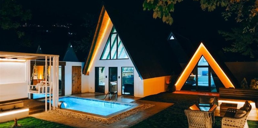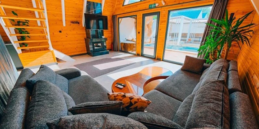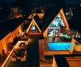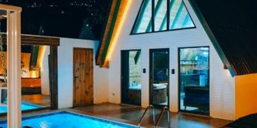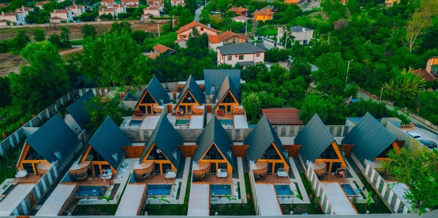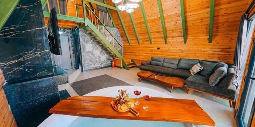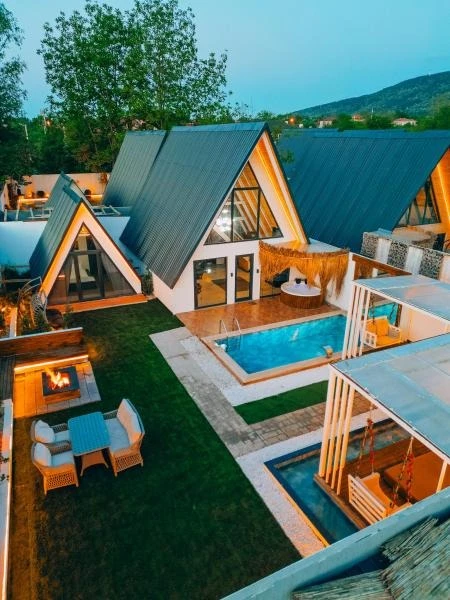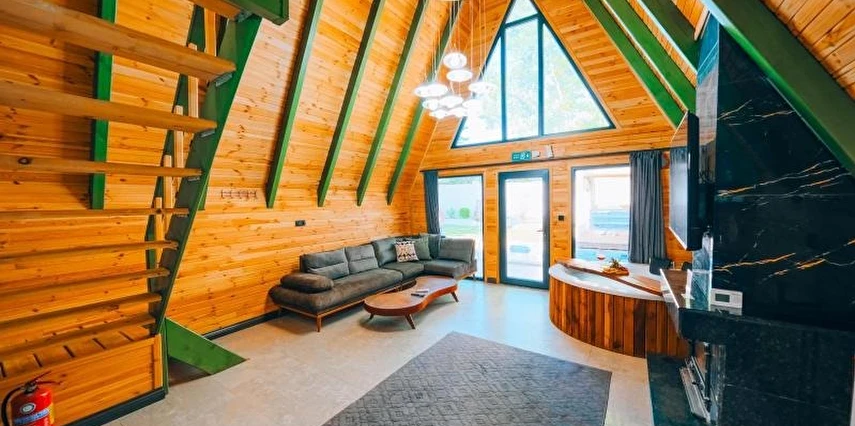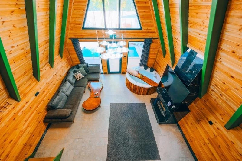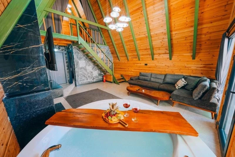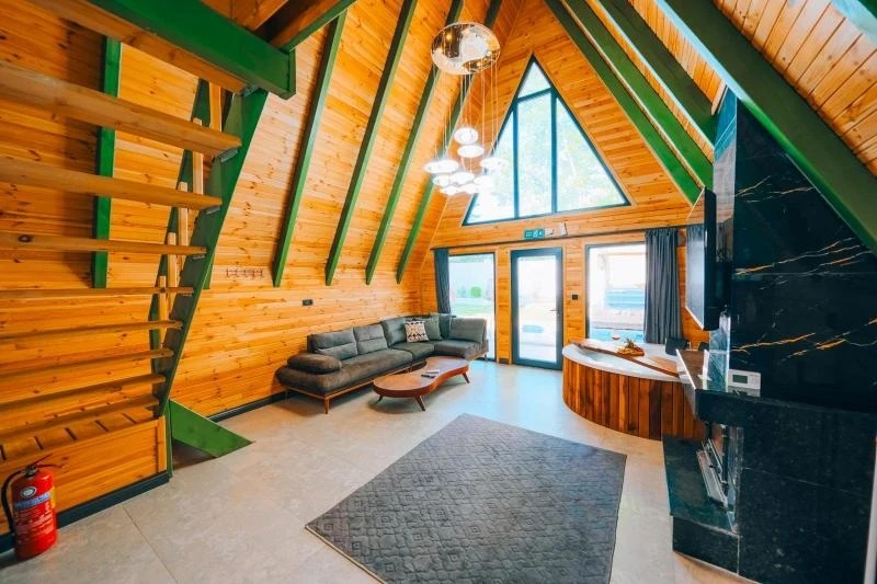 Ahşaptan yapılmış üçgen yapılı bungalovlarımız, modern yaşamın tüm olanaklarıyla donatılmış olup, sıcak ve soğuk havuz, jakuzi, internet ve sabah kahvaltısı gibi birçok hizmeti içermektedir.
