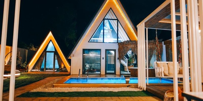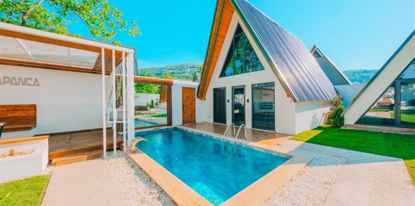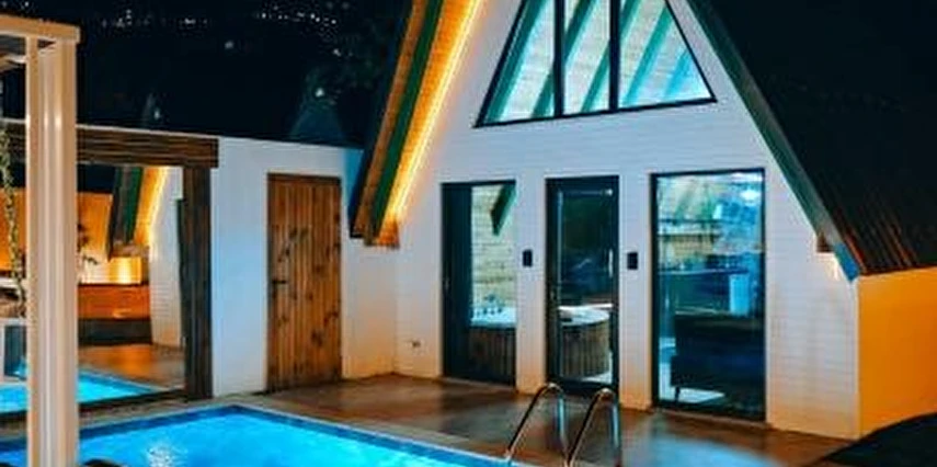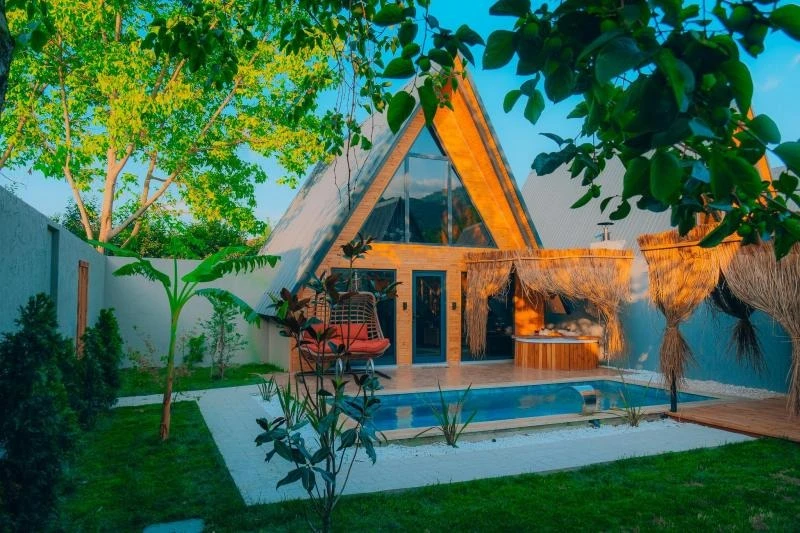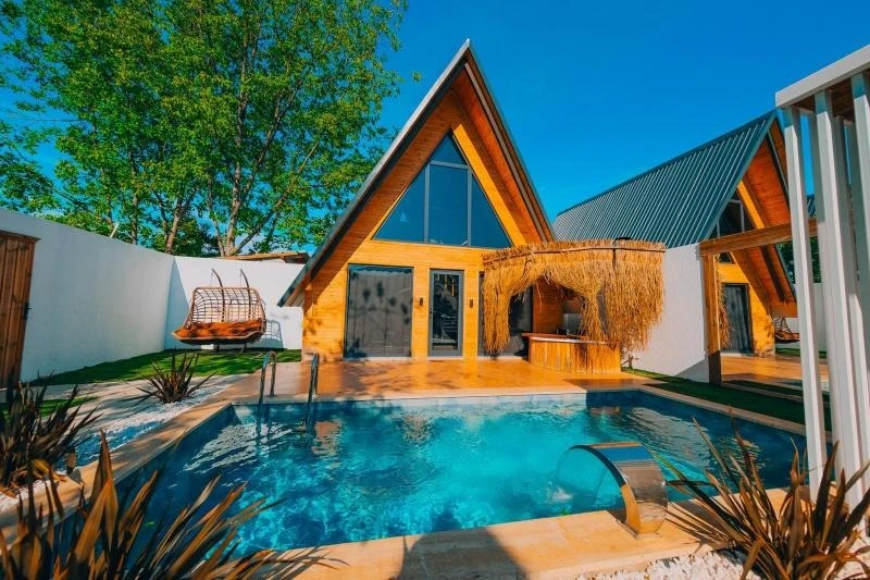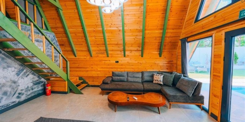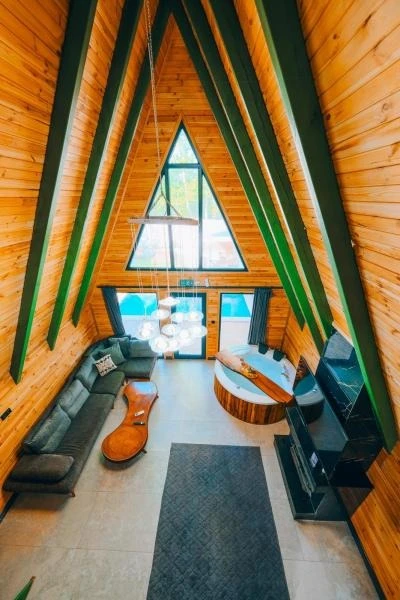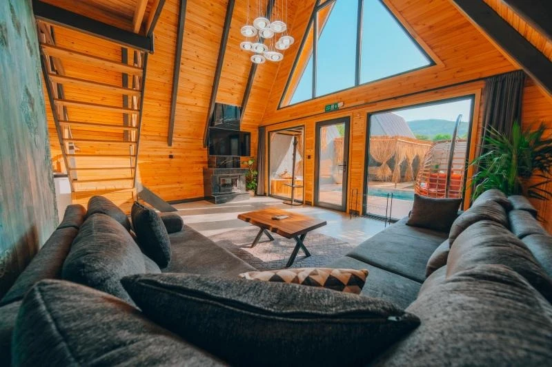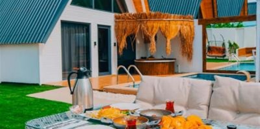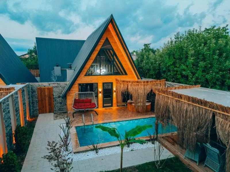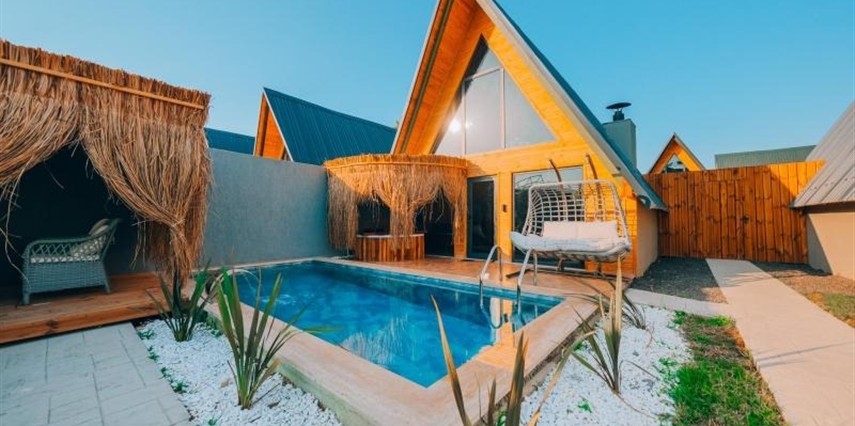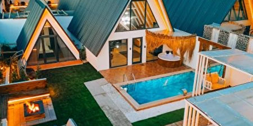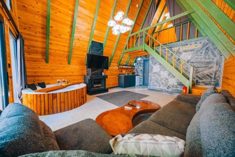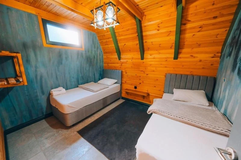 Ahşaptan yapılmış üçgen yapılı bungalovlarımız, modern yaşamın tüm olanaklarıyla donatılmış olup, sıcak ve soğuk havuz, jakuzi, internet ve sabah kahvaltısı gibi birçok hizmeti içermektedir.