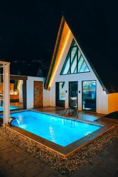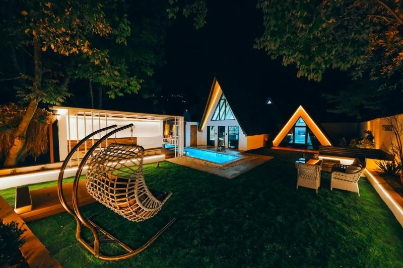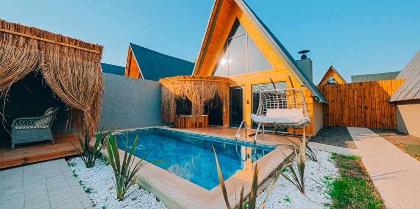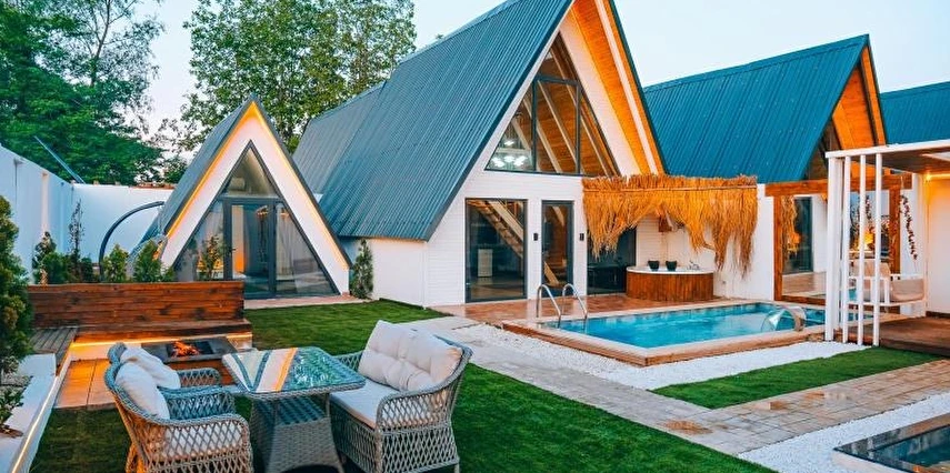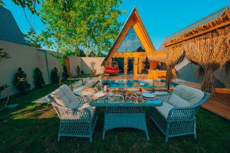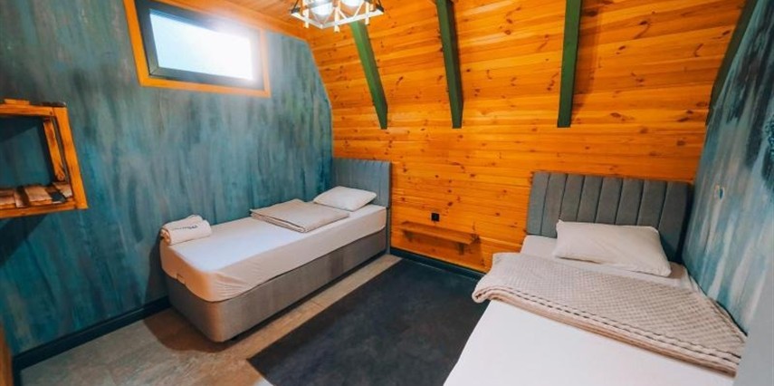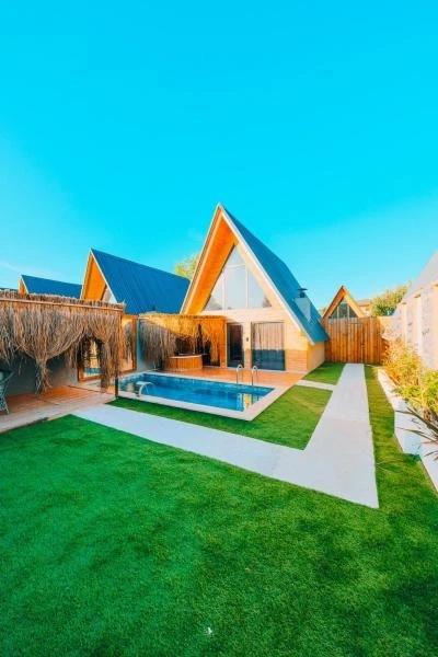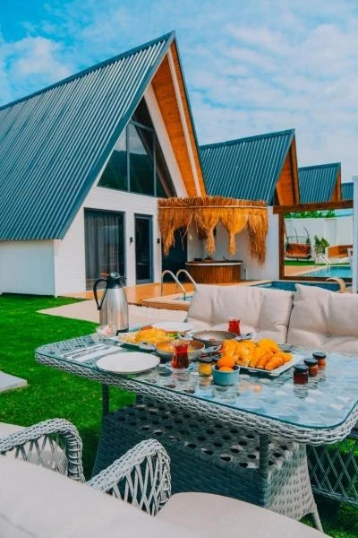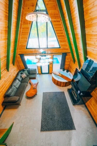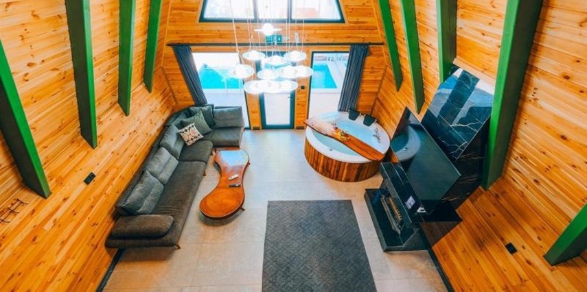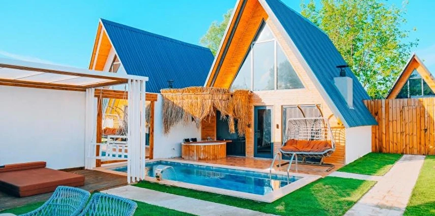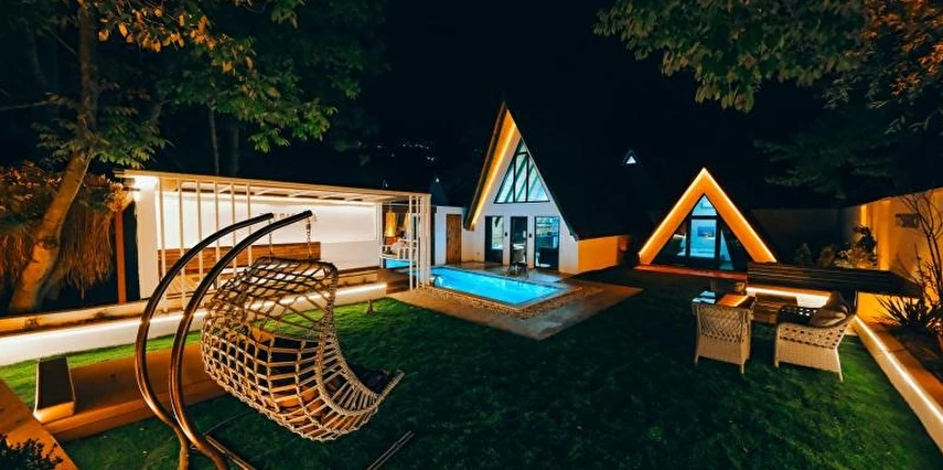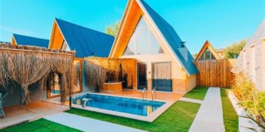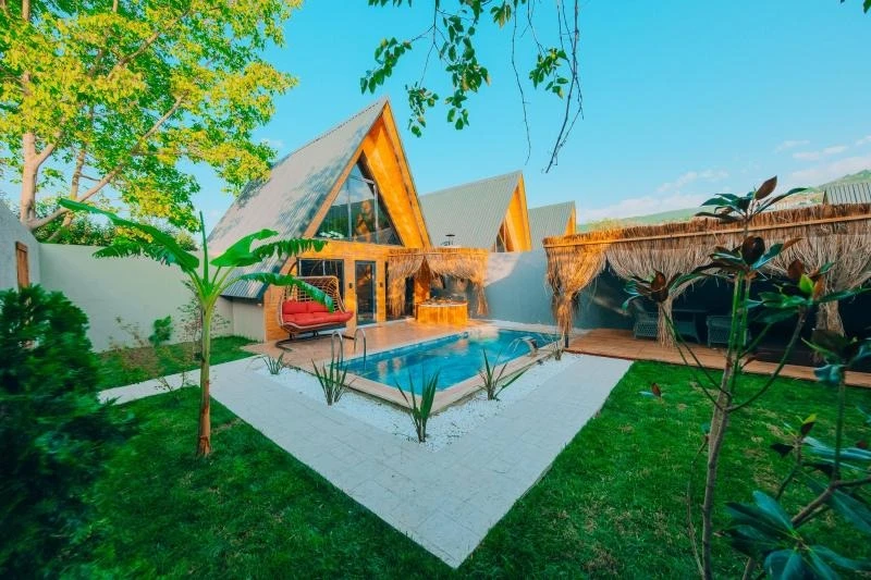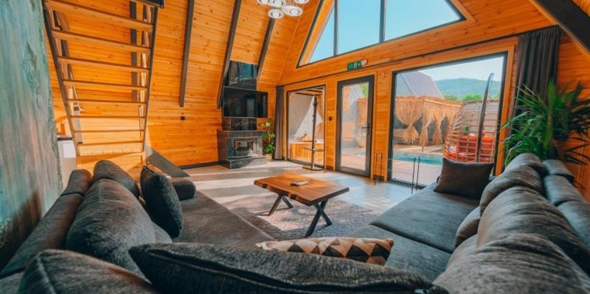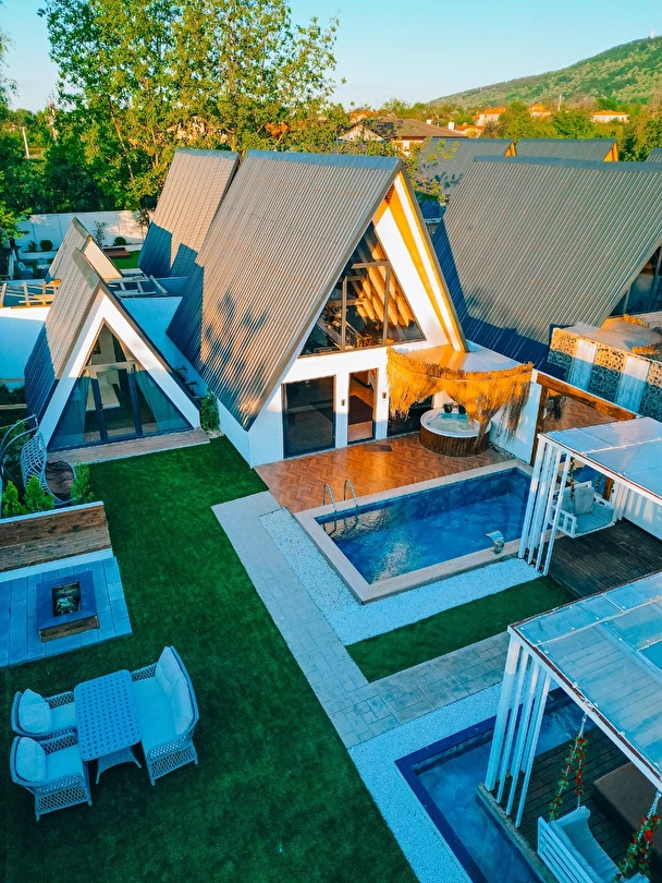 Ahşaptan yapılmış üçgen yapılı bungalovlarımız, modern yaşamın tüm olanaklarıyla donatılmış olup, sıcak ve soğuk havuz, jakuzi, internet ve sabah kahvaltısı gibi birçok hizmeti içermektedir.