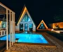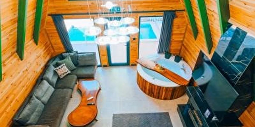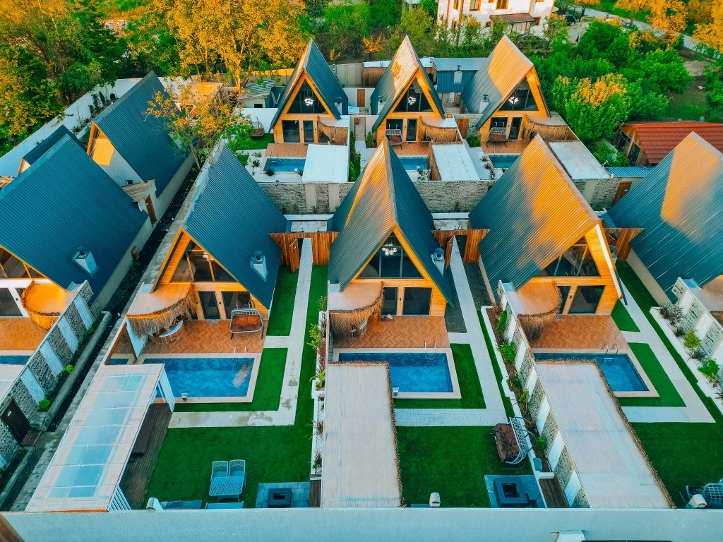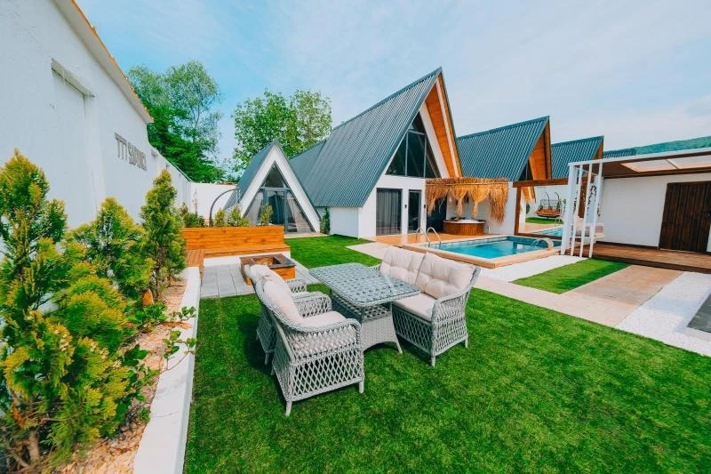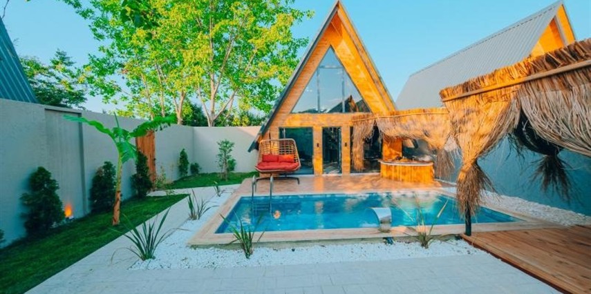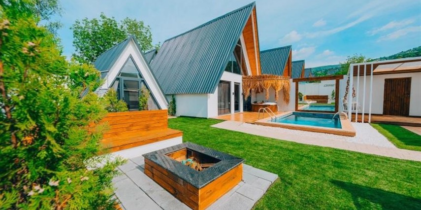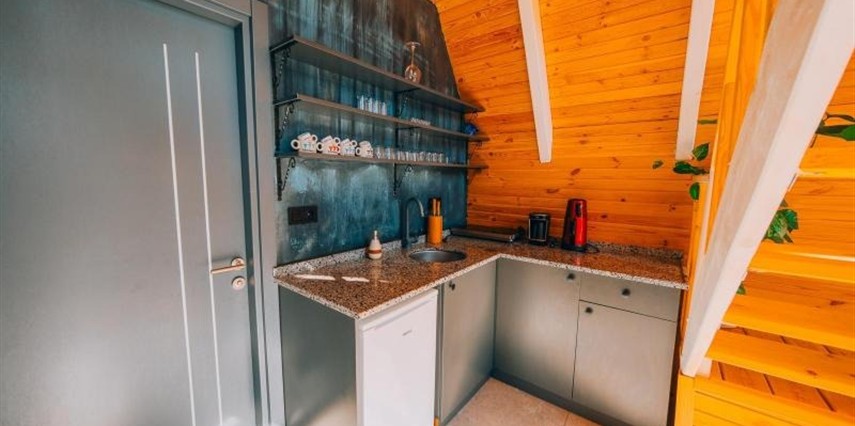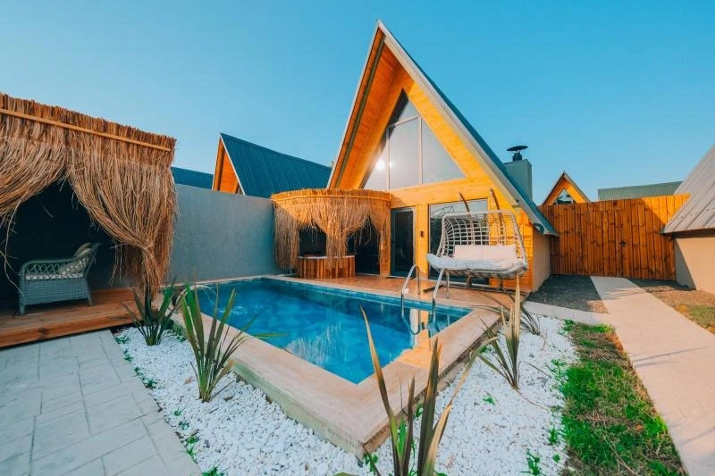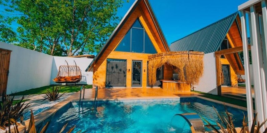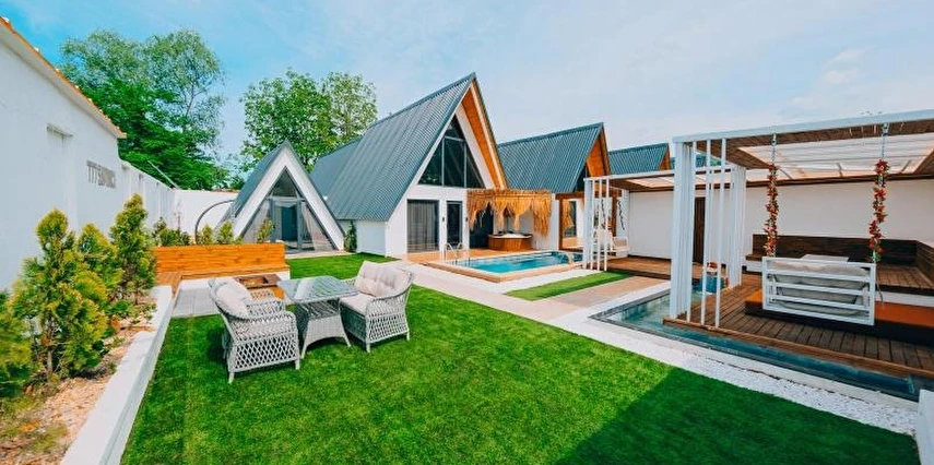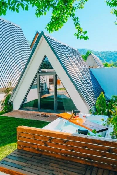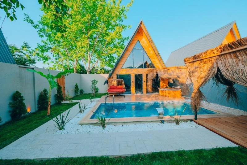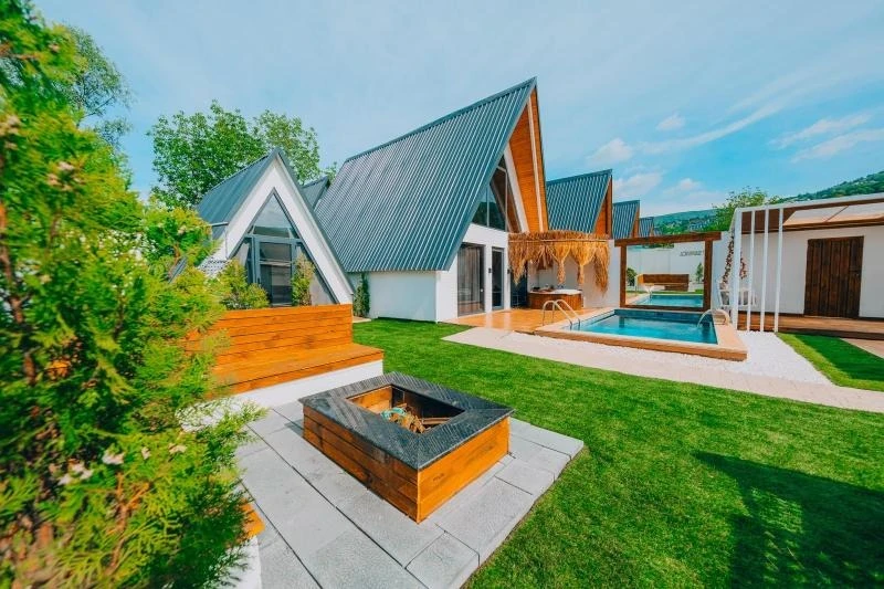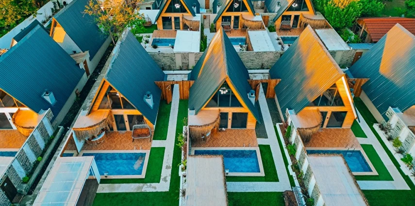 Ahşaptan yapılmış üçgen yapılı bungalovlarımız, modern yaşamın tüm olanaklarıyla donatılmış olup, sıcak ve soğuk havuz, jakuzi, internet ve sabah kahvaltısı gibi birçok hizmeti içermektedir.