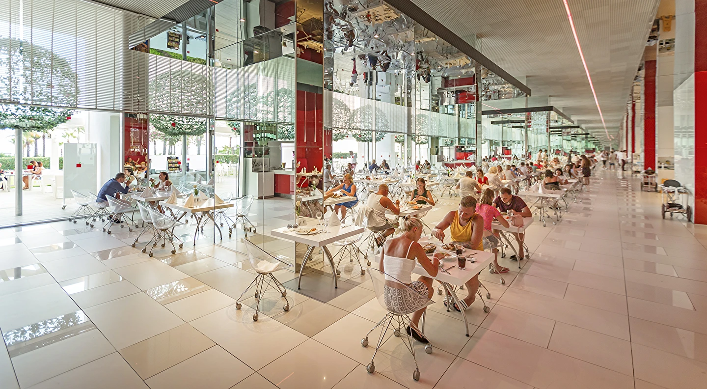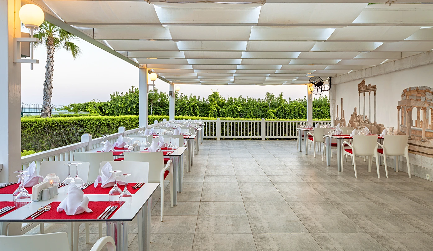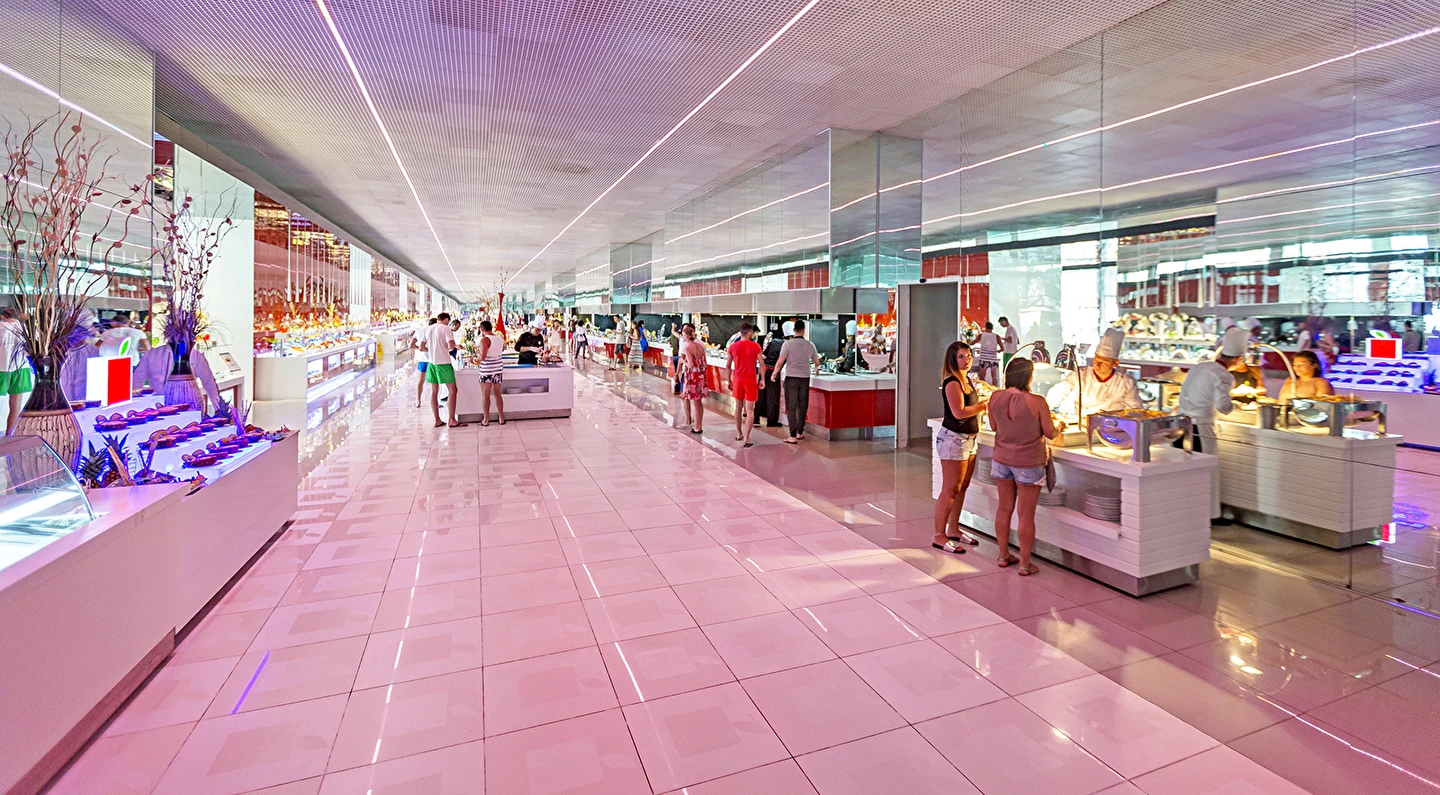 Sabah kahvaltısı öğle ve akşam yemekleri açık büfe olup tesisin belirlemiş olduğu markalar dahilinde 10:00 ile 02:30 saatleri arasında yerli alkollü ve alkolsüz içecek servisi olup ücretlidir. İthal lüks klasmandaki 12 yıllık içkiler. Viski, konyak, burbon VSOP/XO vs.), yerli ve yabanci şaraplar ücretlidir.