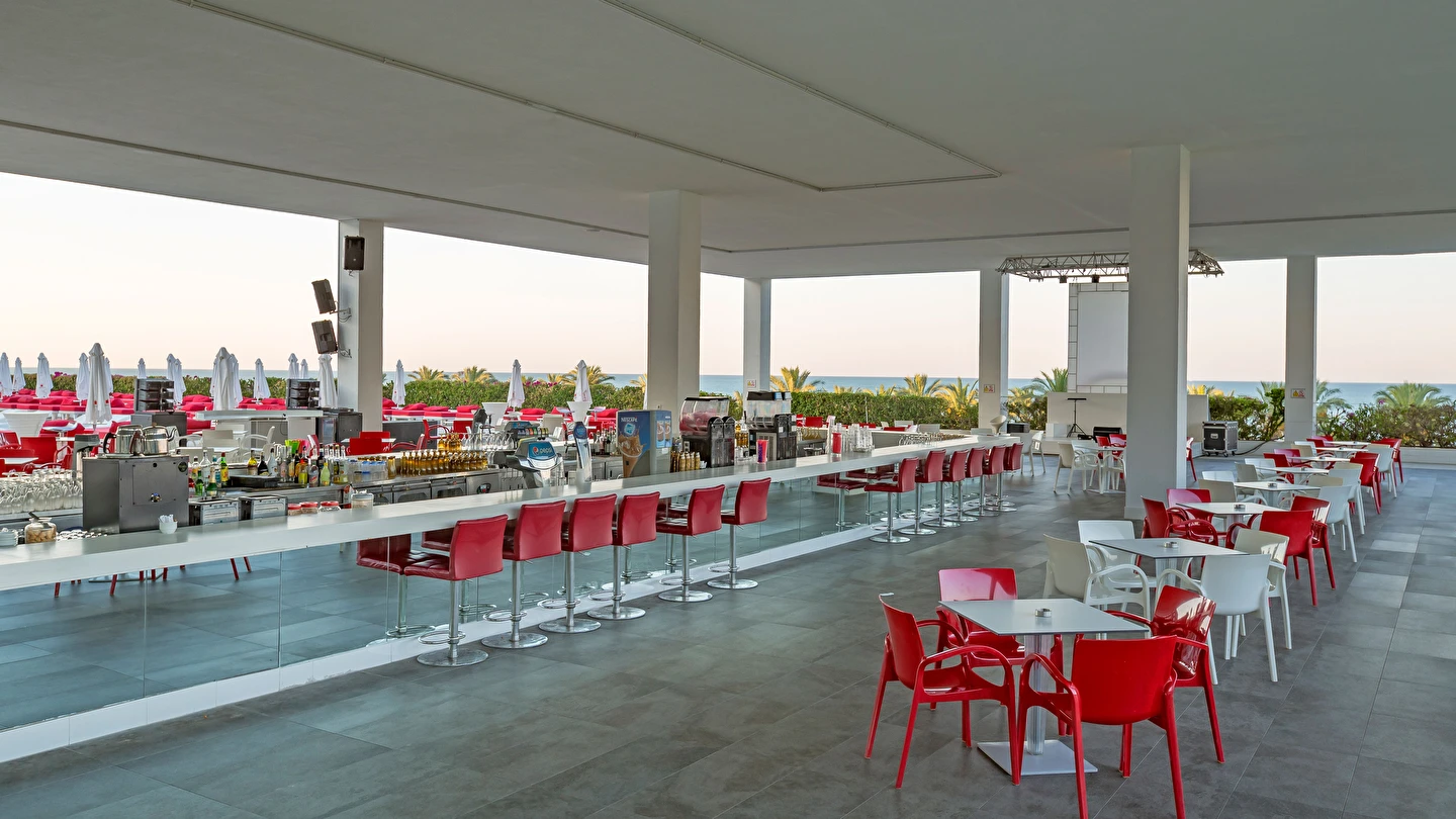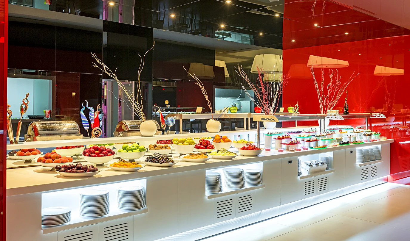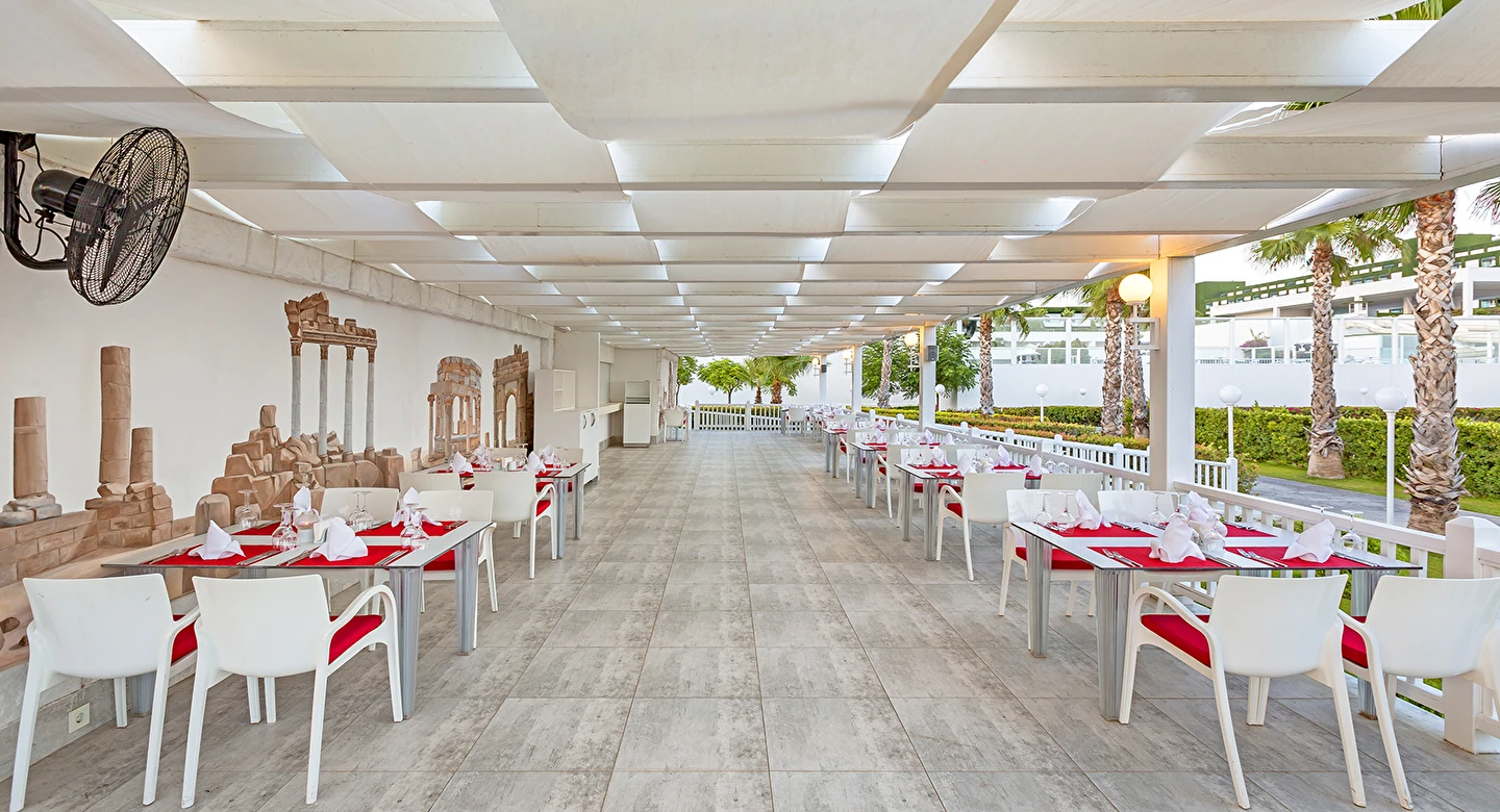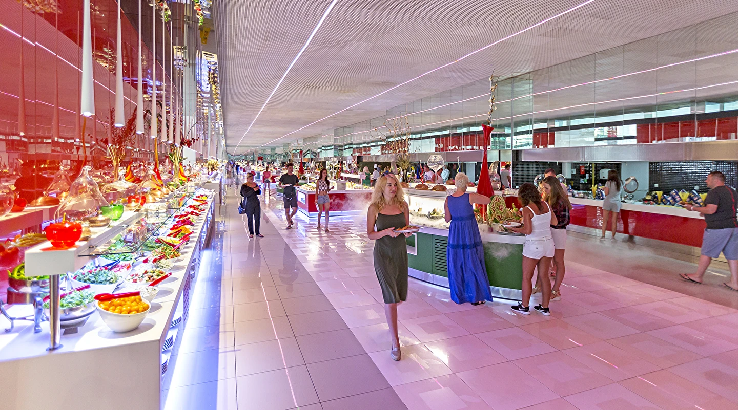 Sabah kahvaltısı öğle ve akşam yemekleri açık büfe olup tesisin belirlemiş olduğu markalar dahilinde 10:00 ile 02:30 saatleri arasında yerli alkollü ve alkolsüz içecek servisi olup ücretlidir. İthal lüks klasmandaki 12 yıllık içkiler. Viski, konyak, burbon VSOP/XO vs.), yerli ve yabanci şaraplar ücretlidir.