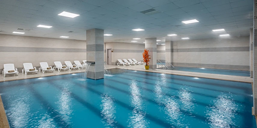 Erkek Bölümünde; 3 adet kapalı havuz, 1 sauna, 1 tuz odası, 1 buhar odası, 1 Türk hamamı, 1 kese odası, 2 masaj odası // Kadın Bölümünde; 3 adet kapalı havuz, 1 sauna, 1 tuz odası, 1 buhar odası, 1 Türk Hamamı, 1 Kese Odası, 2 Masaj Odası // Ortak kullanımda;2 adet Açık Karma (Yüzme Havuzu) mevcuttur.Açık havuz mevsimsel hizmet vermektedir.