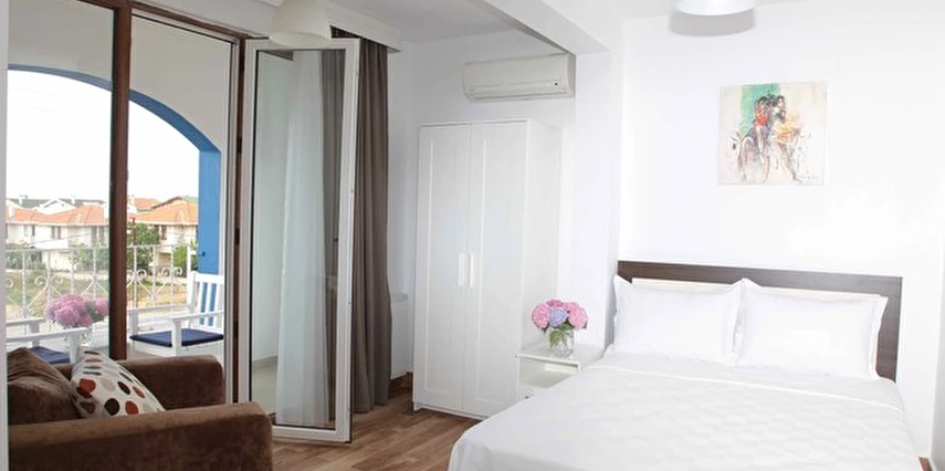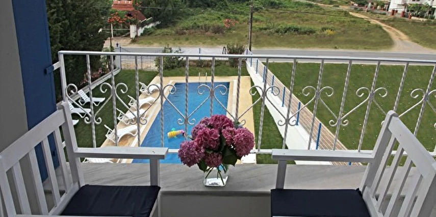 * Toplam 1650 m2 bahçe içerisindedir. 3 kat daki balkonlu odalarımız deniz görülmektedir .