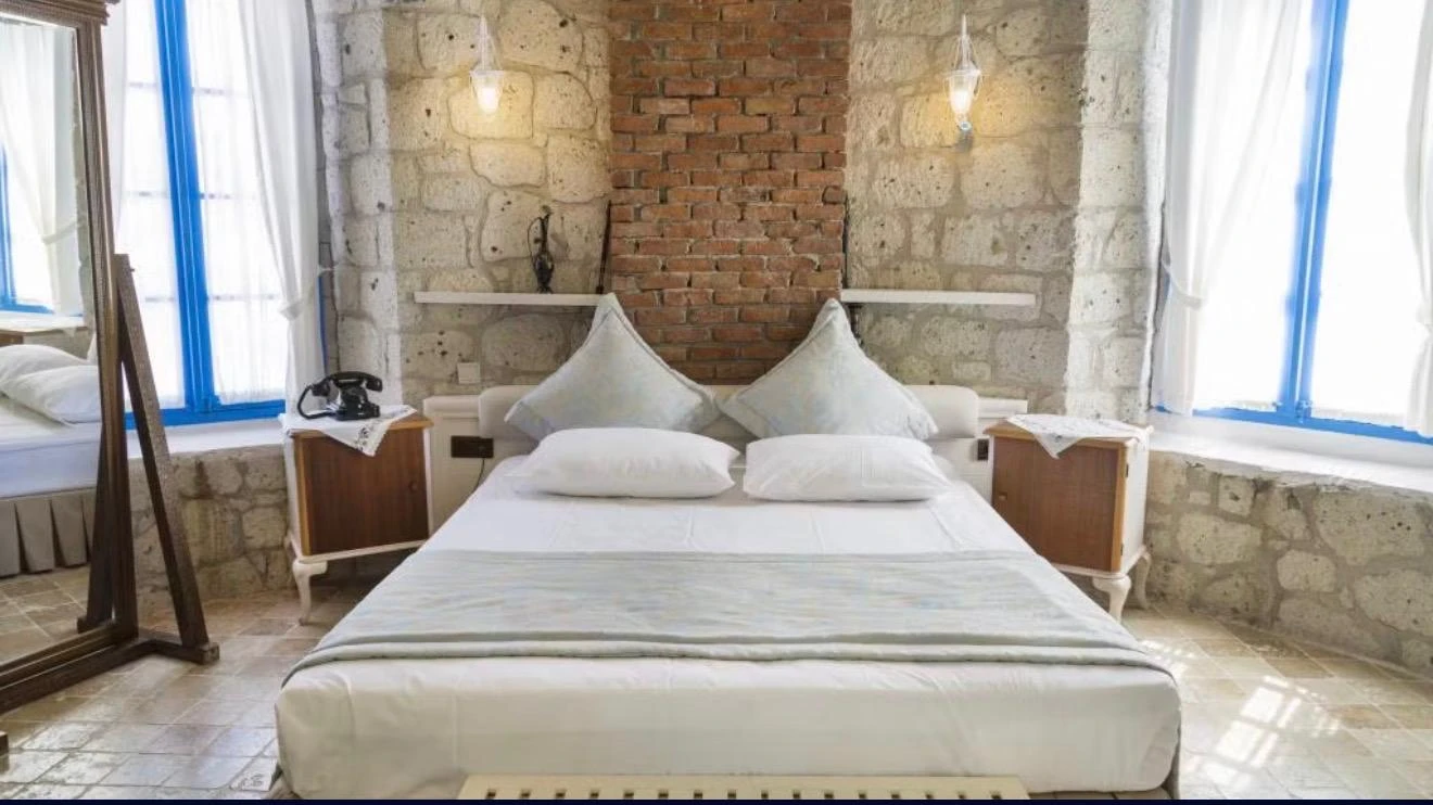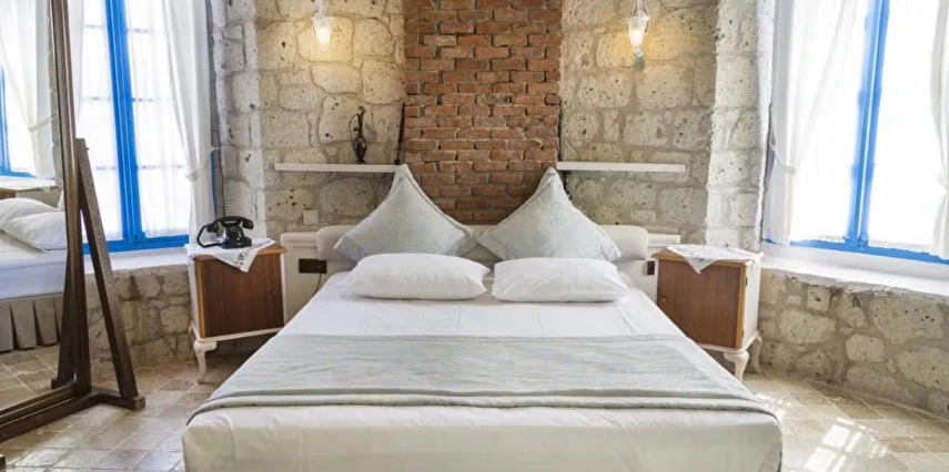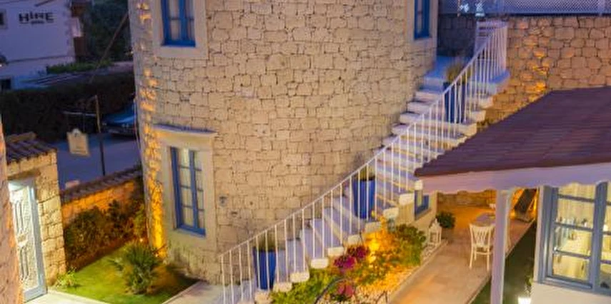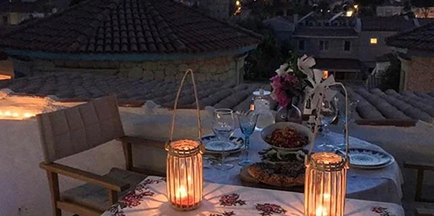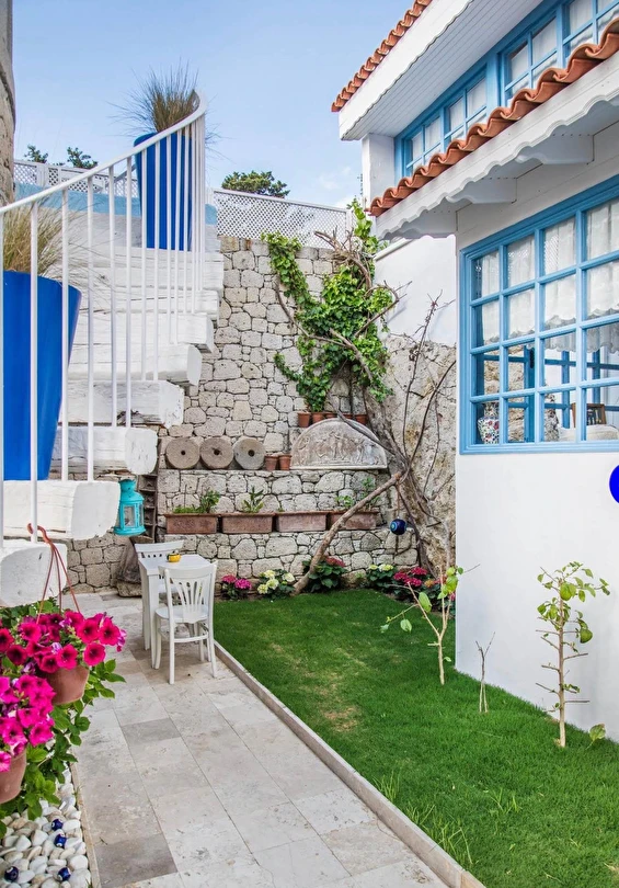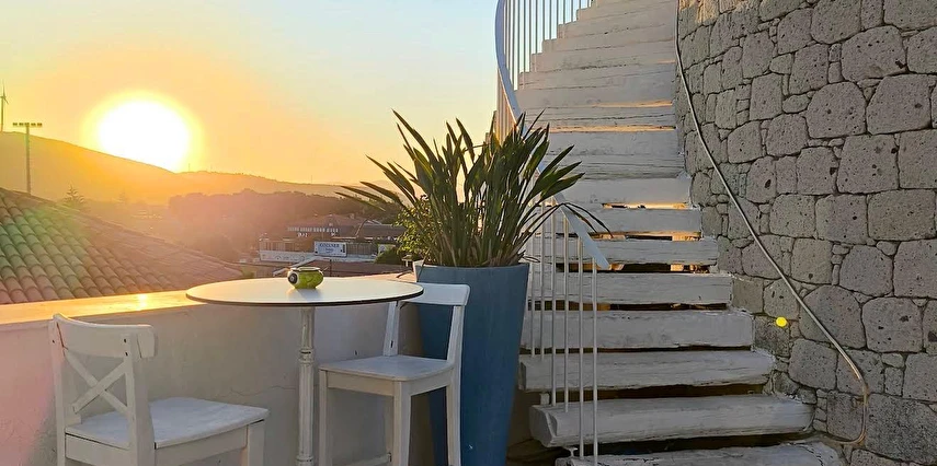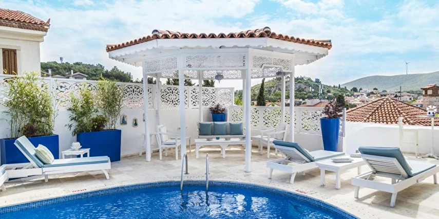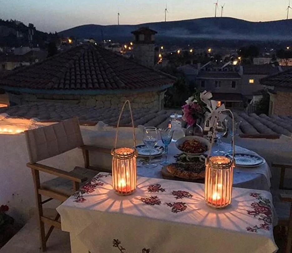 Rengarenk çiçekleri , taşlarla sarmaş dolaş olmuş begonvillerle bezenmiş bahçesinden geçip, Yunan adalarındaki mimariyi andıran merdivenlerinden çıktığınızda, asude ve ılık rüzgarların estiği, Alaçatı’yı yukarıdan seyredebileceğiniz terasını görünce sakın şaşırmayın. “Gemlik’ e doğru/Denizi göreceksin/Sakın şaşırma” diyen Orhan Veli ustanın dizelerini anımsatırcasına… Terasında güneşlenebilir, alkollü alkolsüz içkilerinizi gün boyu yudumlayabilir ve gündüzden vereceğiniz sipariş ile keyifli bir akşam yemeği yiyebilirisiniz. Her bir kulede bulunan altlı üstlü ikişer tane olmak üzere toplam sekiz deluxe odası ile hizmet veriyor otel.