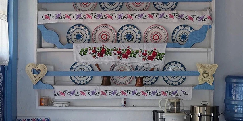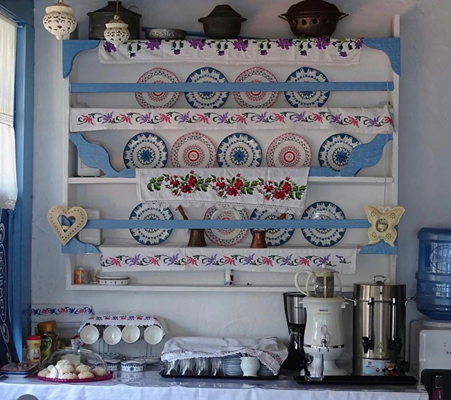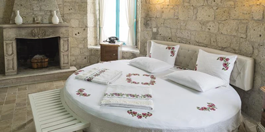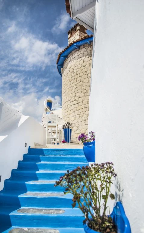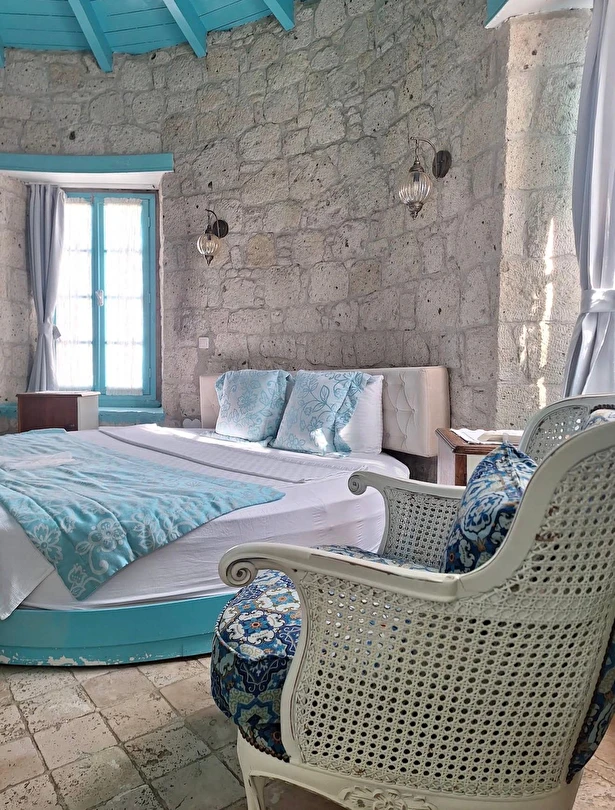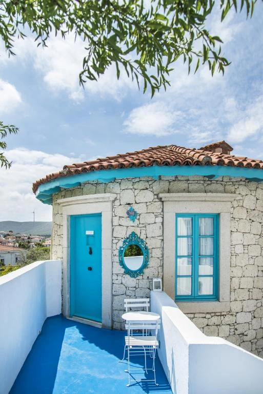 Kulelerin ahşap kısımlarında mavinin dört farklı tonu kullanılmış; odalarda bu renklere göre ve modern / antik karışımı mobilyalarla dekore edilmiş. Kahvaltıda Ege’nin çeşitli yörelerinden titizlikle seçtikleri doğal tarım ürünlerini kullanmaya özen gösteriyorlar. Pişileri, çökelekli çingene pilavları, börekleri, anne yapımı güneşte demlenmiş reçelleri ile şenlendirdikleri kahvaltı, damağınızda unutulmaz tatlar bırakıyor.