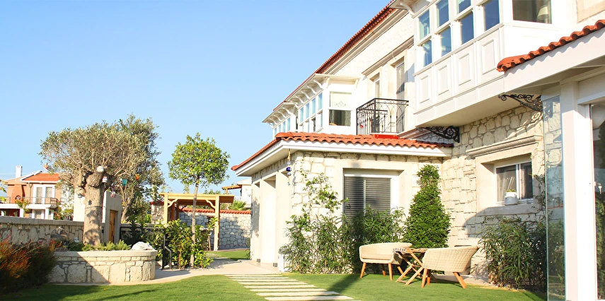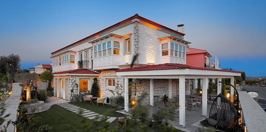 Alaçatının, koruma altındaki sakız ağaçlarıyla ünlü Sakızlar mevkiinde, tepede kurulu, sakız ağaçları ve deniz manzaralıdır.