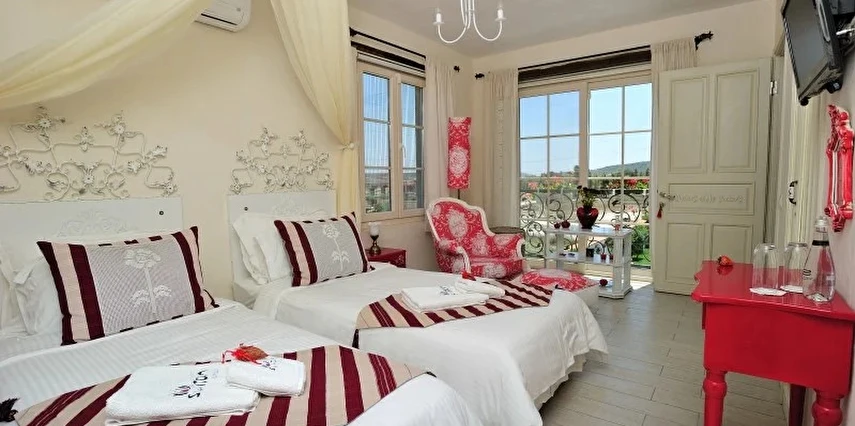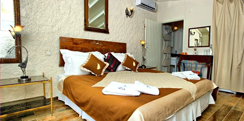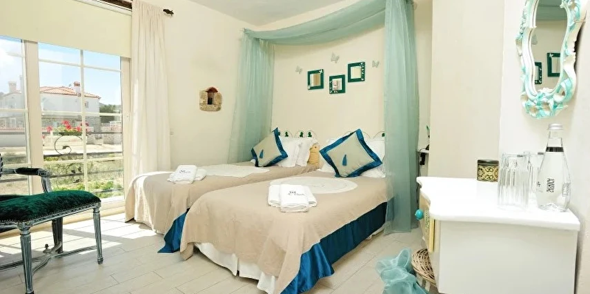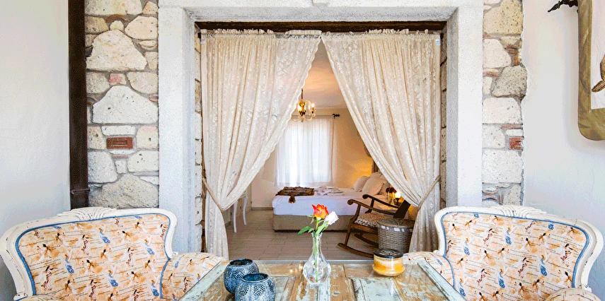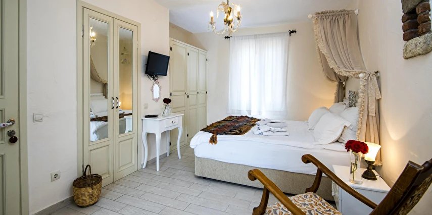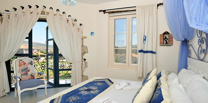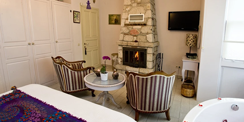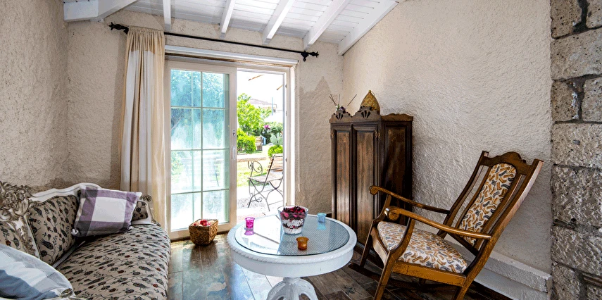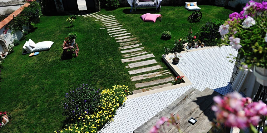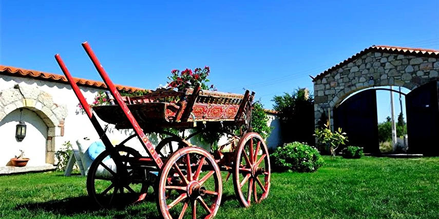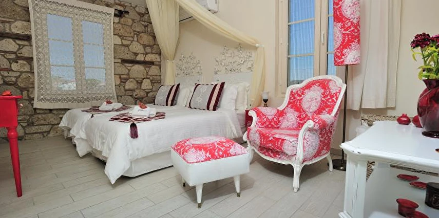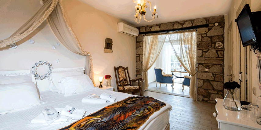 Yazın geniş ve ferah bahçesiyle; kışın yerden ısıtmalı, Jakuzili ve Şömineli romantik odalarıyla konforlu bir tatil vadeden tesis, 12 ay boyunca hizmet veriyor. Tesis, her biri farklı ve özel dekorasyonlu odaları ile balayı tatilleri için de çeşitli sürprizler sunuyor. Konsept dahilinde sunulan serpme kahvaltıda geniş kapsamlı ve organik ürünler sunuluyor. Tesis bünyesinde isteğe göre akşam yemeği; Ege mezeleri ve barbekü menüsü olarak da servis ediliyor. Köy içine yürüyüş mesafesinde olan tesis, geniş bir cadde üzerinde konumlanıyor. Misafirler ücretsiz olarak araçlarını park edebilir. Gözde tatil beldesi Alaçatı'da hizmet veren tesis, misafirlerini taş bir binada ağırlıyor. Aynı zamanda misafirler, Alaçatı köy merkezinin gürültüsünden uzak, kuş cıvıltıları içerisinde, geniş ve ferah bahçede sakin ve huzurlu zaman geçirebilir.
