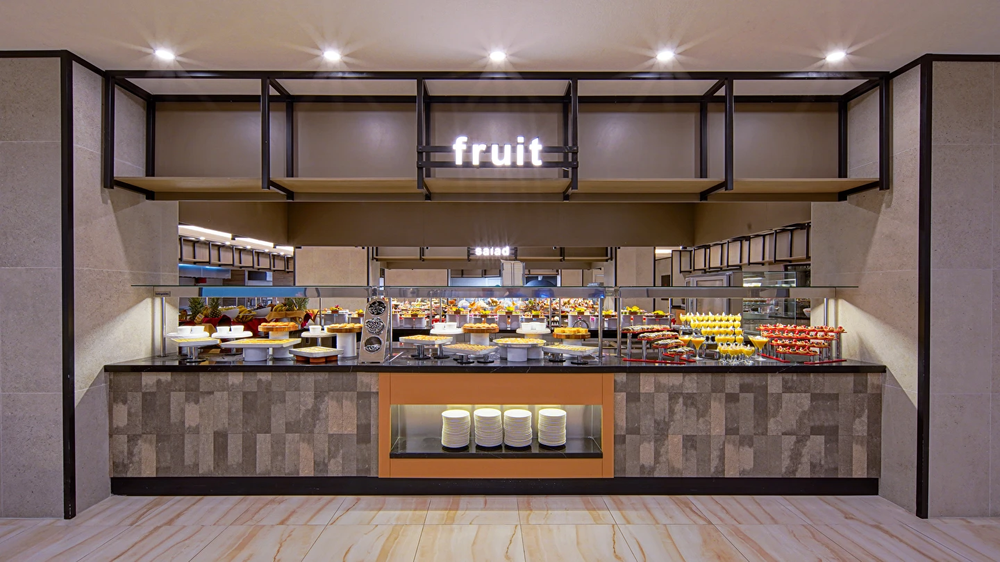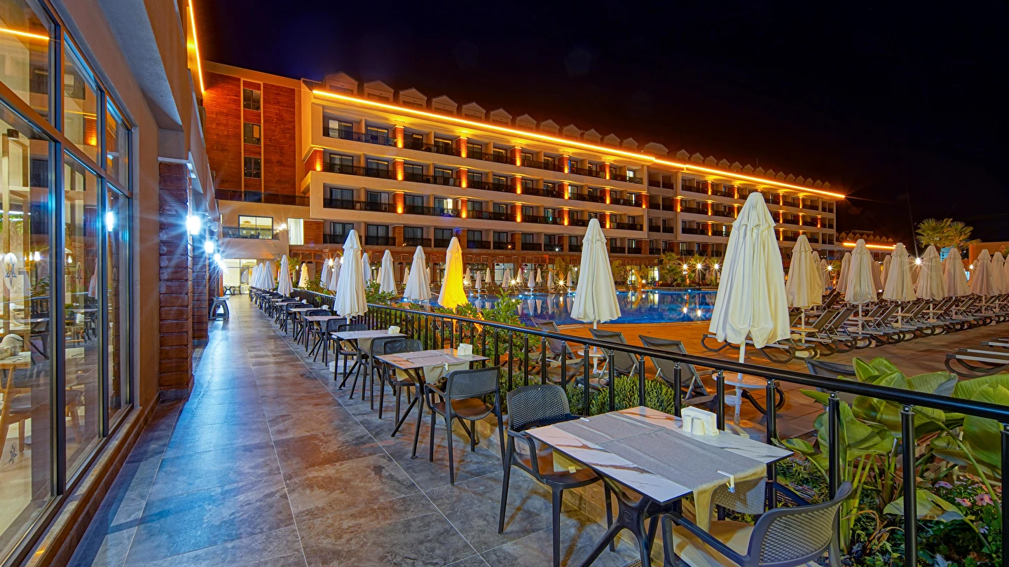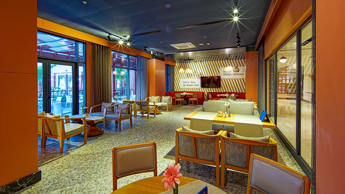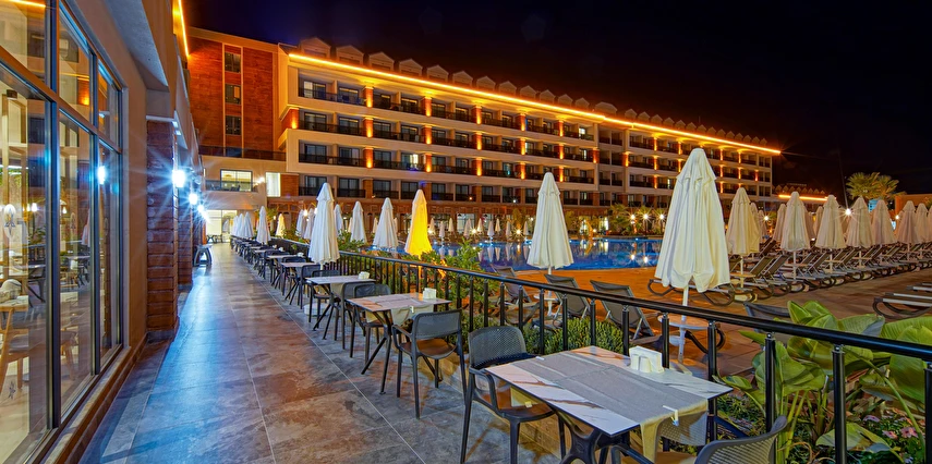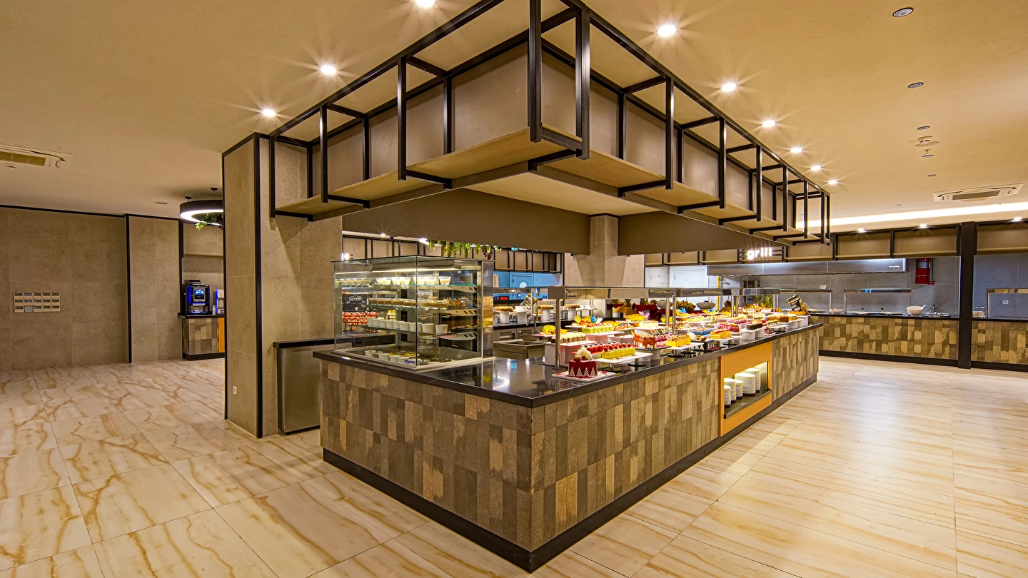 Sabah kahvaltısı, öğle ve akşam yemekleri açık büfe olup tesisin belirlemiş olduğu markalar dahilince 24 saat ücretsizdir. Yabancı içecekler,taze sıkılmış meyve suları ve şişe servisi ücretlidir. Disco haftanın belirli günleri açıktır. Biberon ısıtıcısı ve sterilizatörü 24 saat açık olan Lobby Barda ihtiyaç durumunda hizmete sunulmaktadır.
