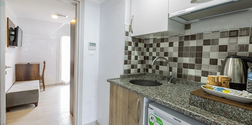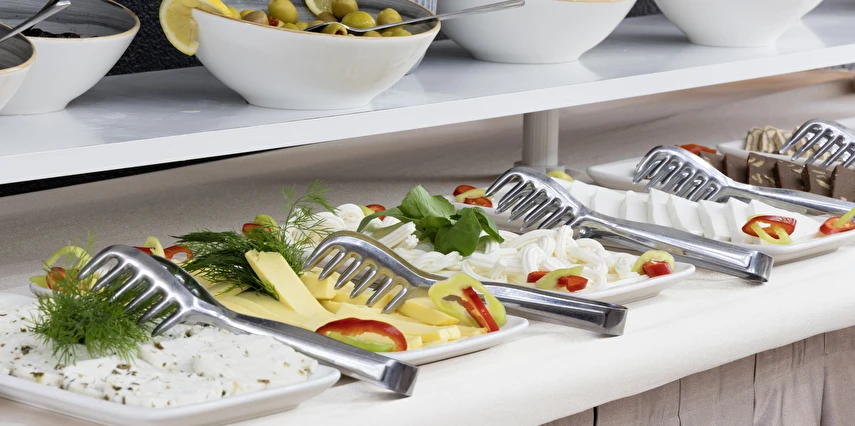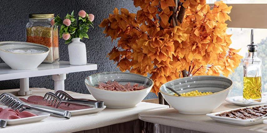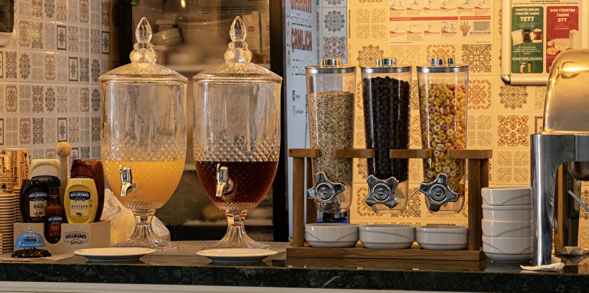 Her oda için çay ve kahve seti sunulmaktadır. Günlük kahvaltı yöresel lezzetlerle açık büfe olarak servis edilmektedir. Otelde ayrıca geleneksel ve dünya mutfaklarından yemekler sunan bir A la Carte restoran bulunmaktadır. Tesiste 7/24 açık resepsiyon mevcuttur.