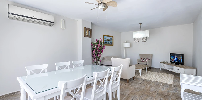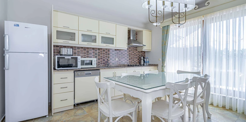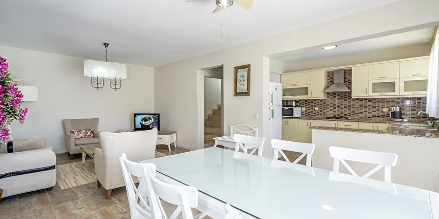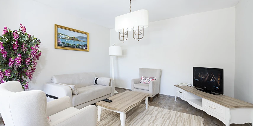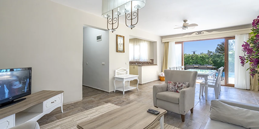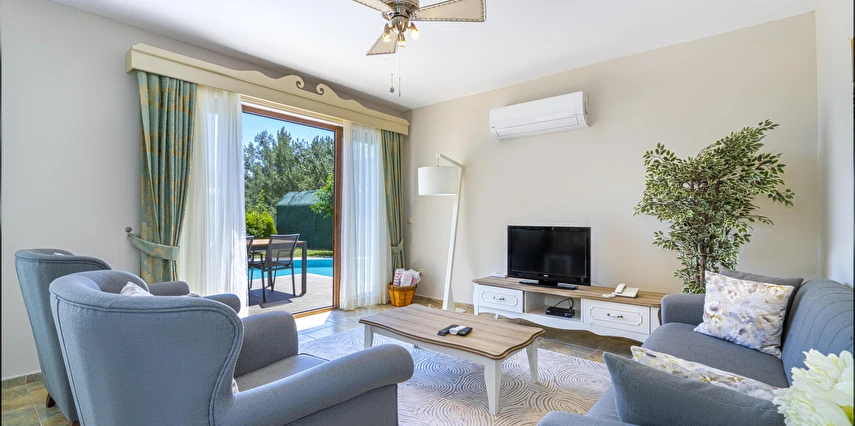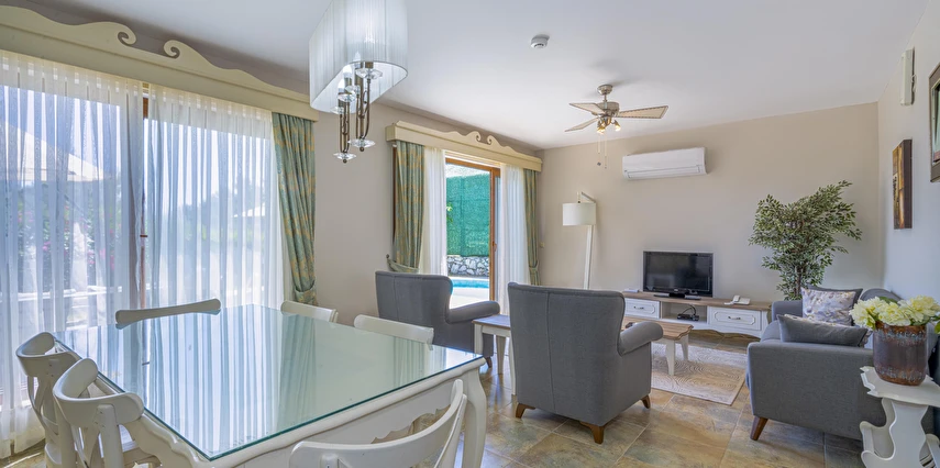 Salon:Oturma grubu, yemek masası, uydu alıcı, TV, klima, ütü, ütü masası, süs, dekor, çamaşır makinası, havuz kenarına çıkış bulunmaktadır.