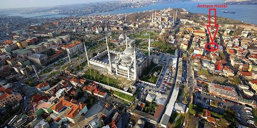 Tarihi Sultanahmet semtinin kalbinde yer alan Antique Hostel; Sultanahmet Camii, Ayasofya ve Topkapı Sarayı'na sadece birkaç adim uzaklıktadır. Aya Sofya Müzesi (150m) Yerebatan Sarnıcı (200m İstanbul Arkeoloji Müzeleri (300m) Mozaik Müzesi (100m) Türk ve Islam Eserleri Müzesi (200m) Topkapı Saray (250m) Kapalı Çarsı (800m) Mısır Çarsısı (600m) Galata Köprüsü (900m) Sultan Ahmet Camii (100m) Galata Kulesi (1.5km) Bizans Surları (100m) Postane (300m) Sirkeci Tren İstasyonu (600m) Eminönü İskelesi (800m
