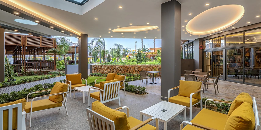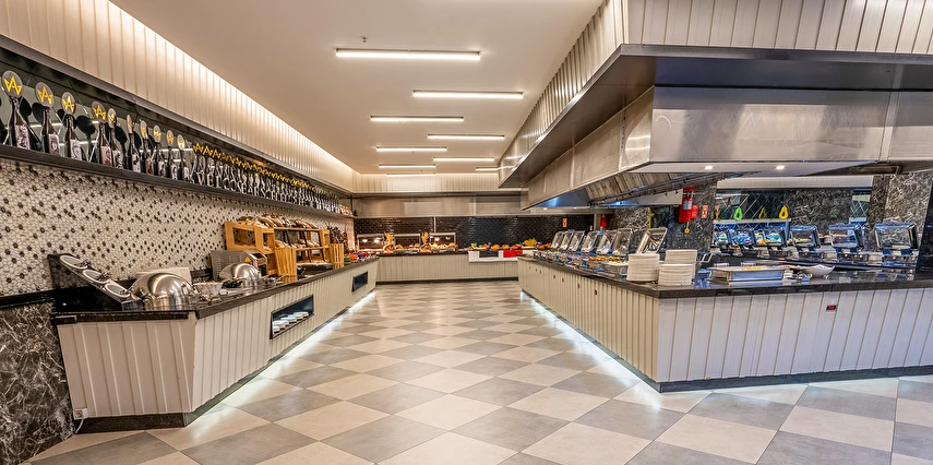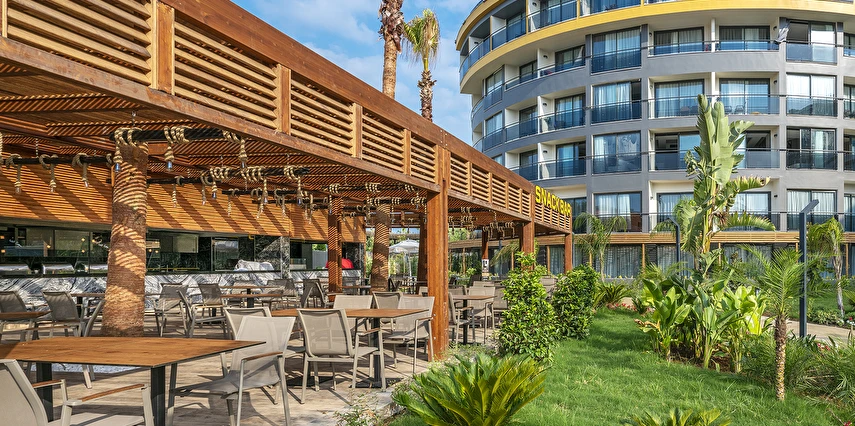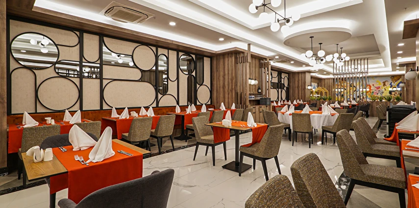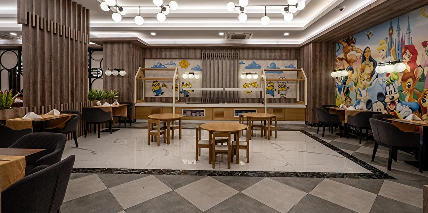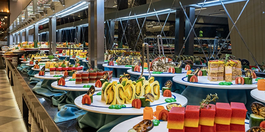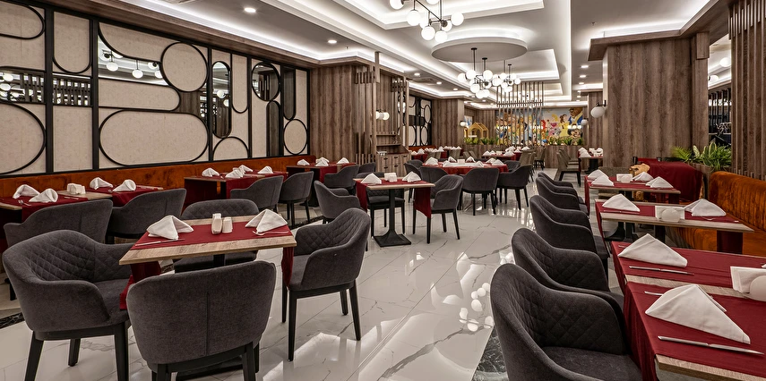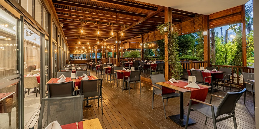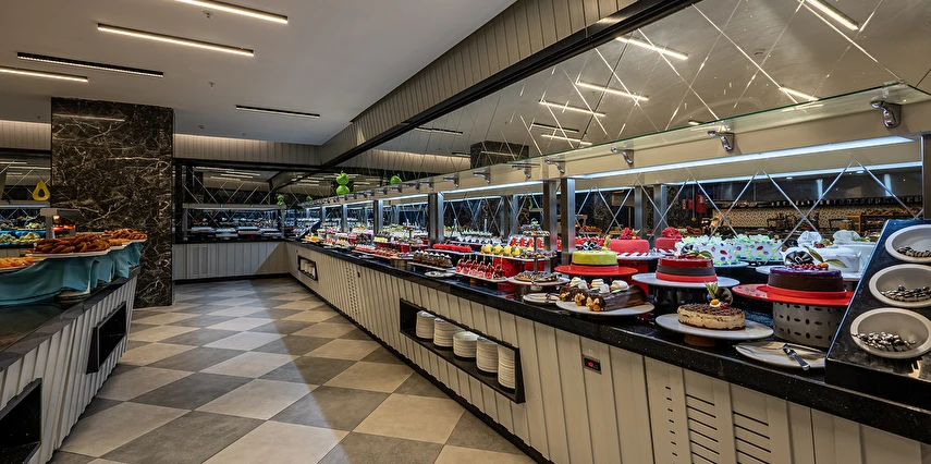 Tüm içecekler masaya servis edilir. Ana restoranda Çocuk Büfesi, Diyet Büfesi, Canlı Pişirme Şov Üniteleri vardır. Sabah kahvaltısı, öğle ve akşam yemekleri açık büfe olarak ana restoranda servis edilir. Tesisin belirlemiş olduğu markalar dahilinde alkolsüz içecekler 24 saat - alkollü içecekler ise 23:00 a kadar ücretsizdir, 23.00 sonrası alkollü içecekler ücretlidir. Sabah kahvaltısında Portakal suyu ücretsiz olarak sunulmaktadır.