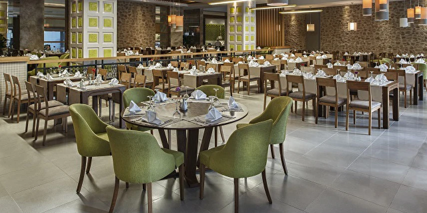 Sabah kahvaltısı, öğle ve akşam yemeği açık büfe olup tesisin belirlediği markalar dahilinde (yerli bira, şarap, vodka, cin, rakı, bazı viski) içkiler ücretsizdir.