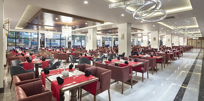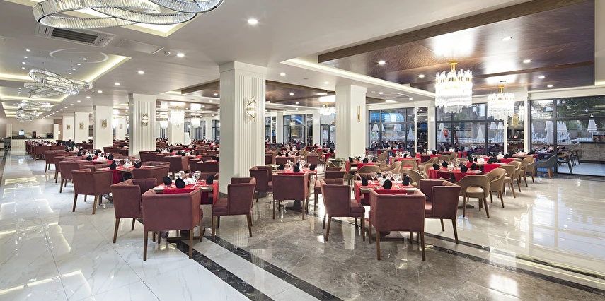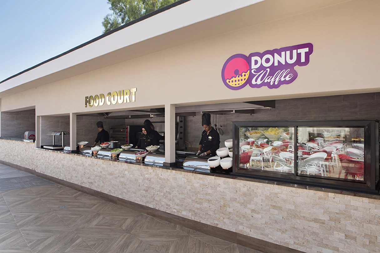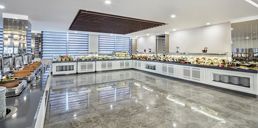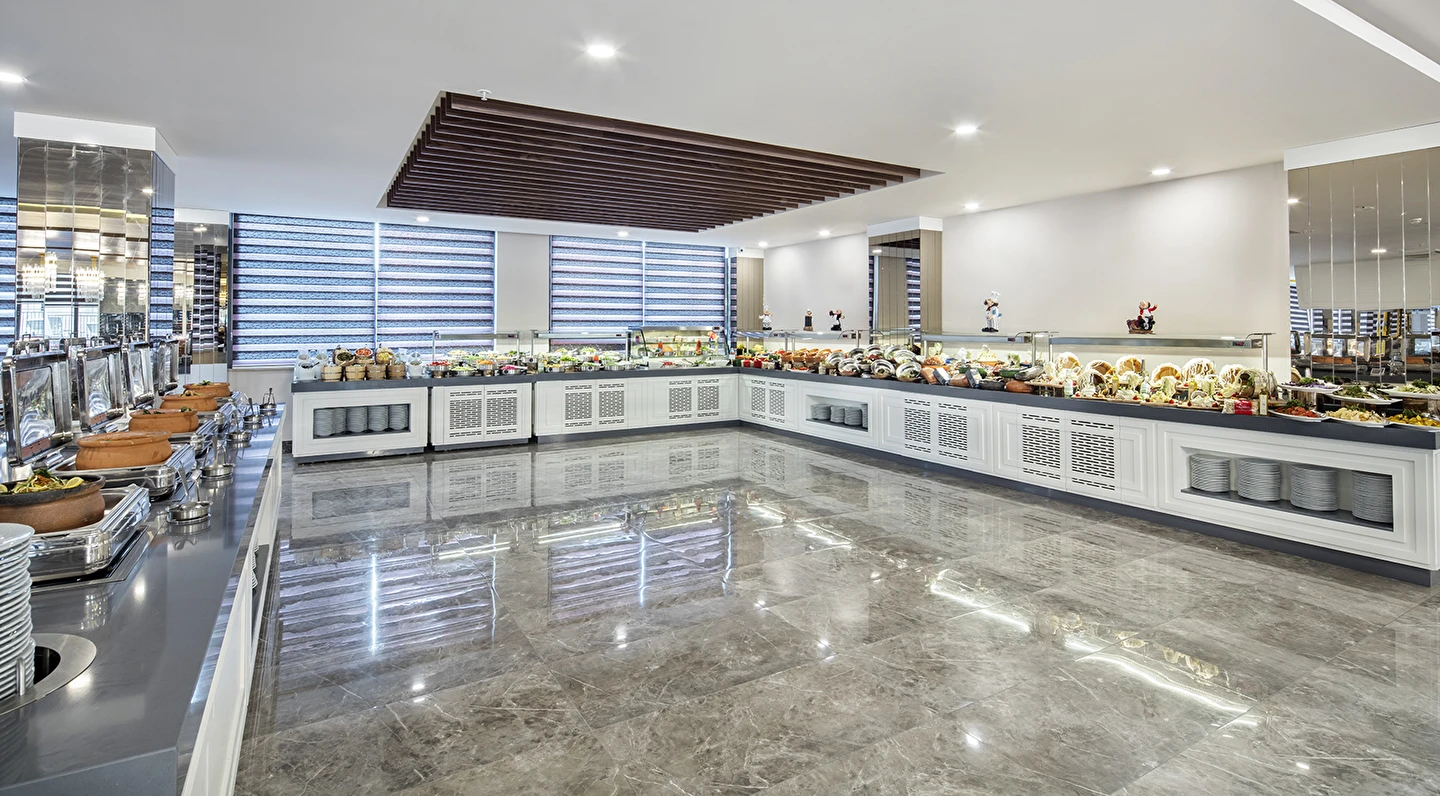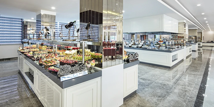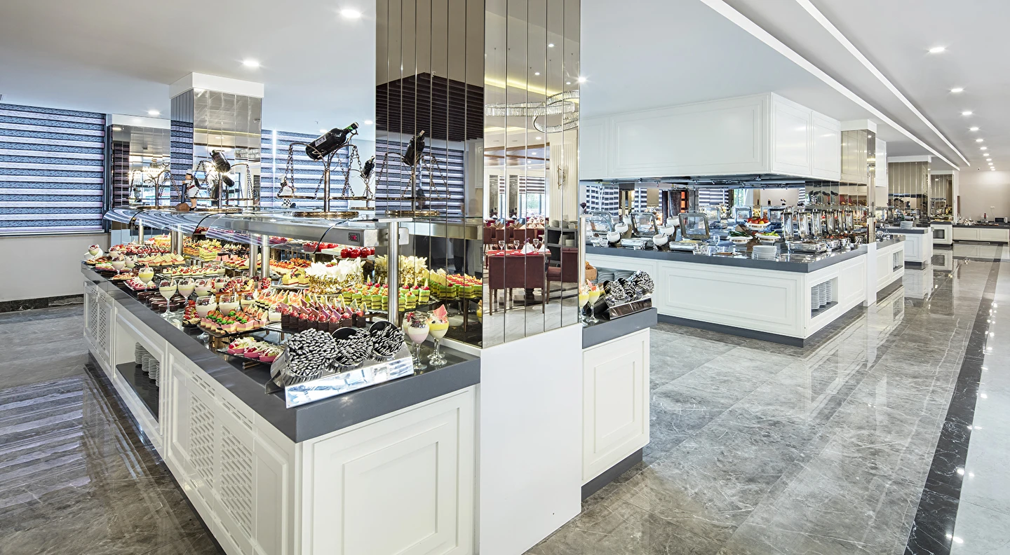 Sabah kahvaltısı, öğle ve akşam yemekleri açık büfe olup tesisin belirlediği markalar dahilinde lokal alkollü & alkolsüz içecekler ve bazı ithal alkollü & alkolsüz içecekler 24 saat ücretsizdir. Taze sıkılmış meyve suları, enerji içecekleri, şişeli içecekler ve konsept dışında kalan delüks içecekler ücretlidir. Alkollü içecekler kahvaltıda servis edilmez. Tüm Restaurant ve barlarda alkol ve içecek servisi kadeh ile yapılmaktadır. Türk kahvesi ücretsizdir.