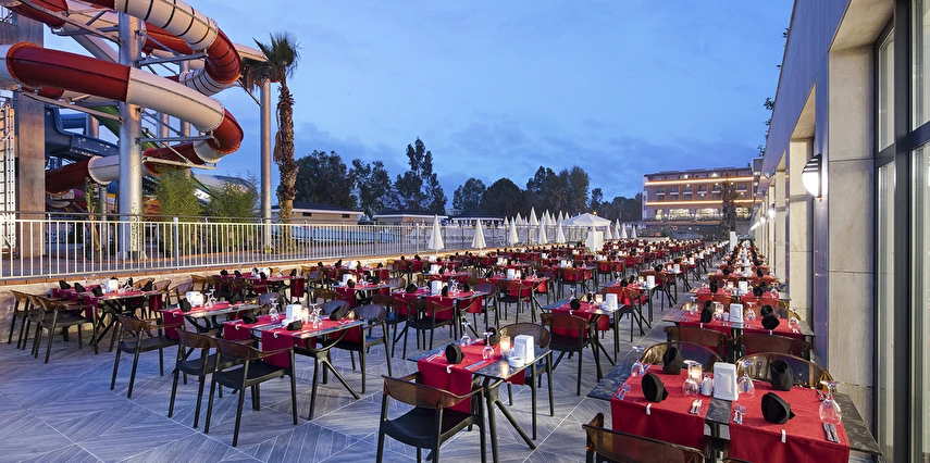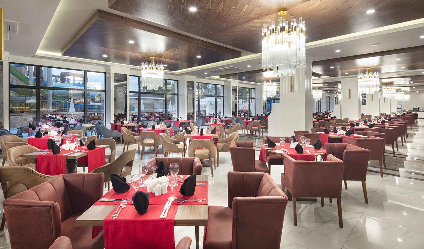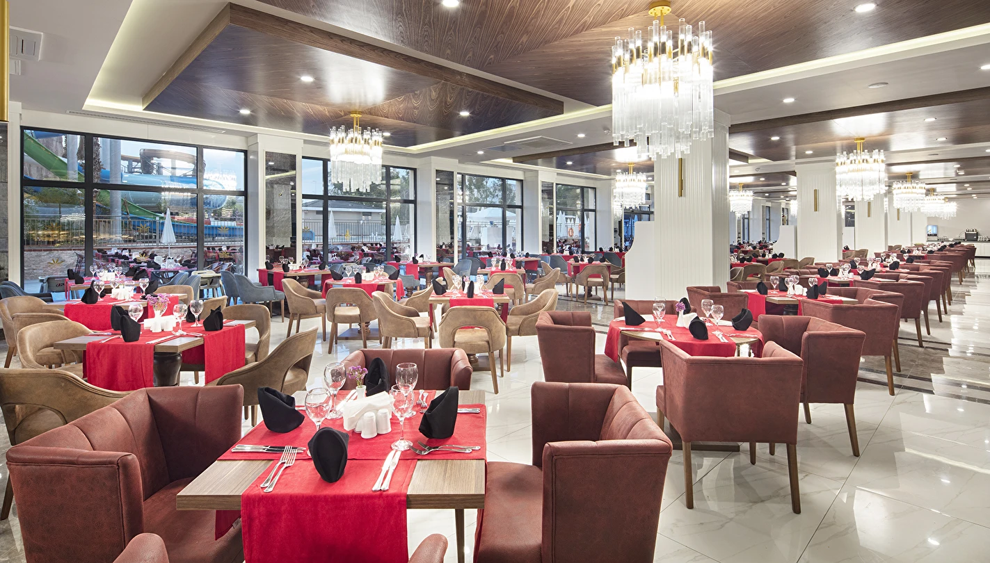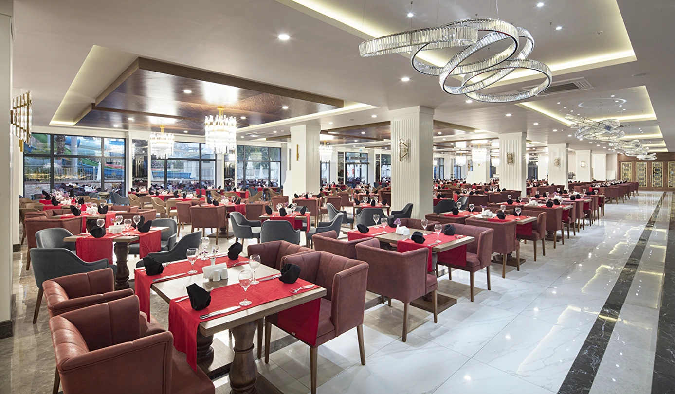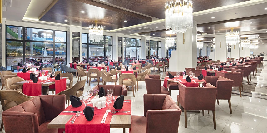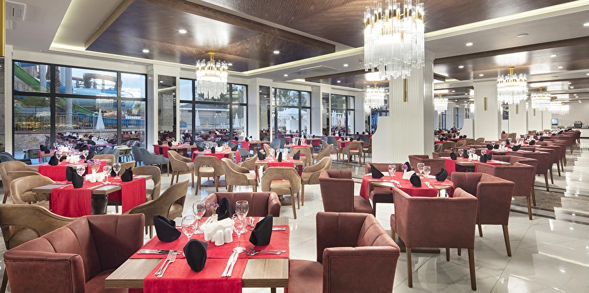 Sabah kahvaltısı, öğle ve akşam yemekleri açık büfe olup tesisin belirlediği markalar dahilinde lokal alkollü & alkolsüz içecekler ve bazı ithal alkollü & alkolsüz içecekler 24 saat ücretsizdir. Taze sıkılmış meyve suları, enerji içecekleri, şişeli içecekler ve konsept dışında kalan delüks içecekler ücretlidir. Alkollü içecekler kahvaltıda servis edilmez. Tüm Restaurant ve barlarda alkol ve içecek servisi kadeh ile yapılmaktadır. Türk kahvesi ücretsizdir.