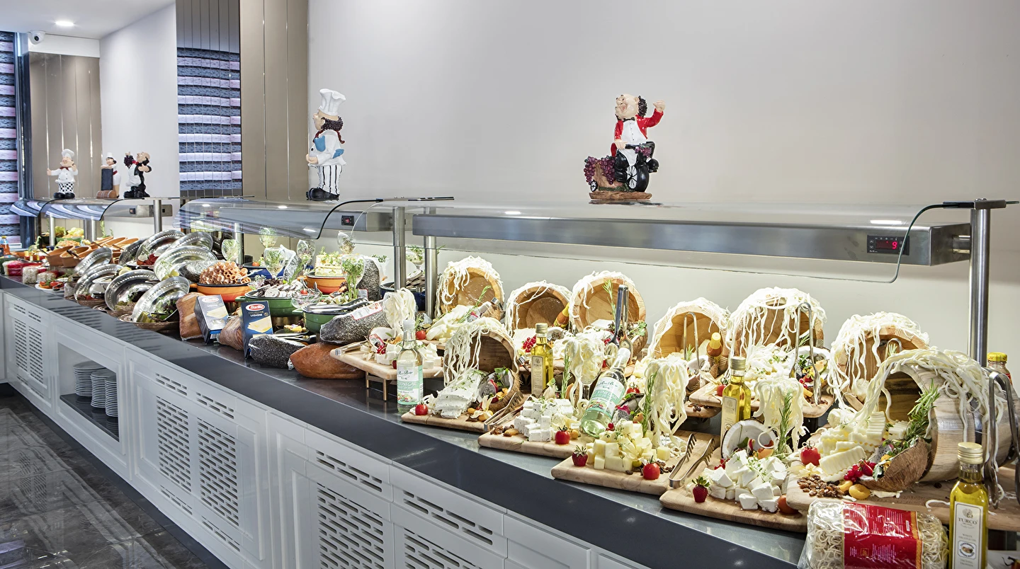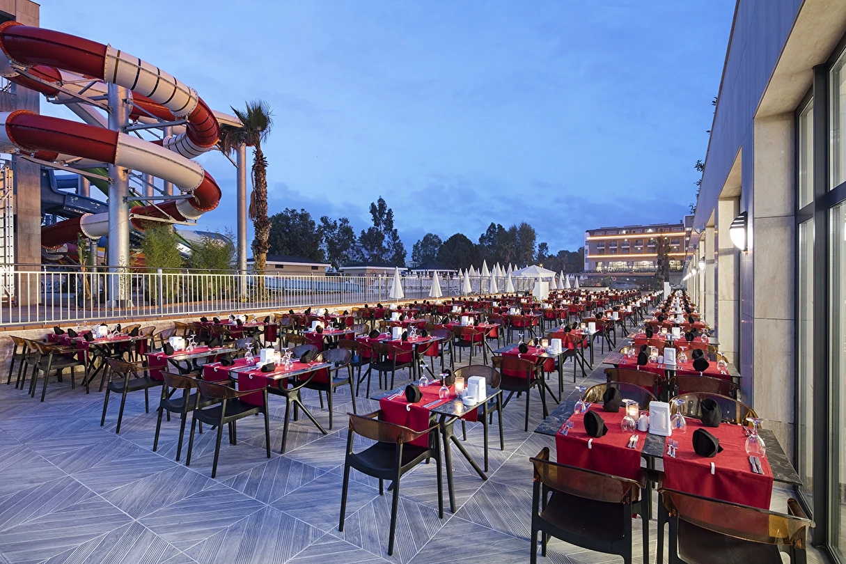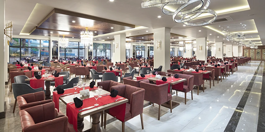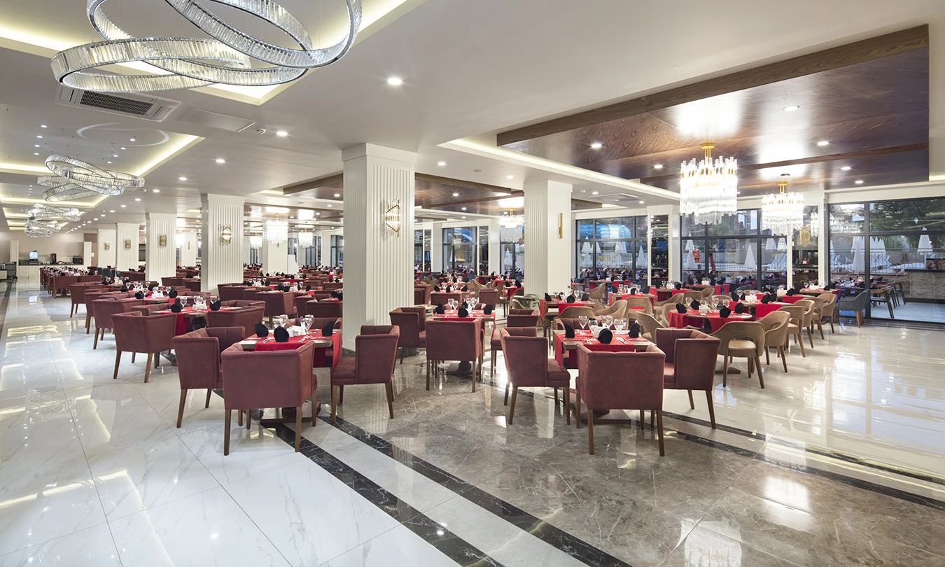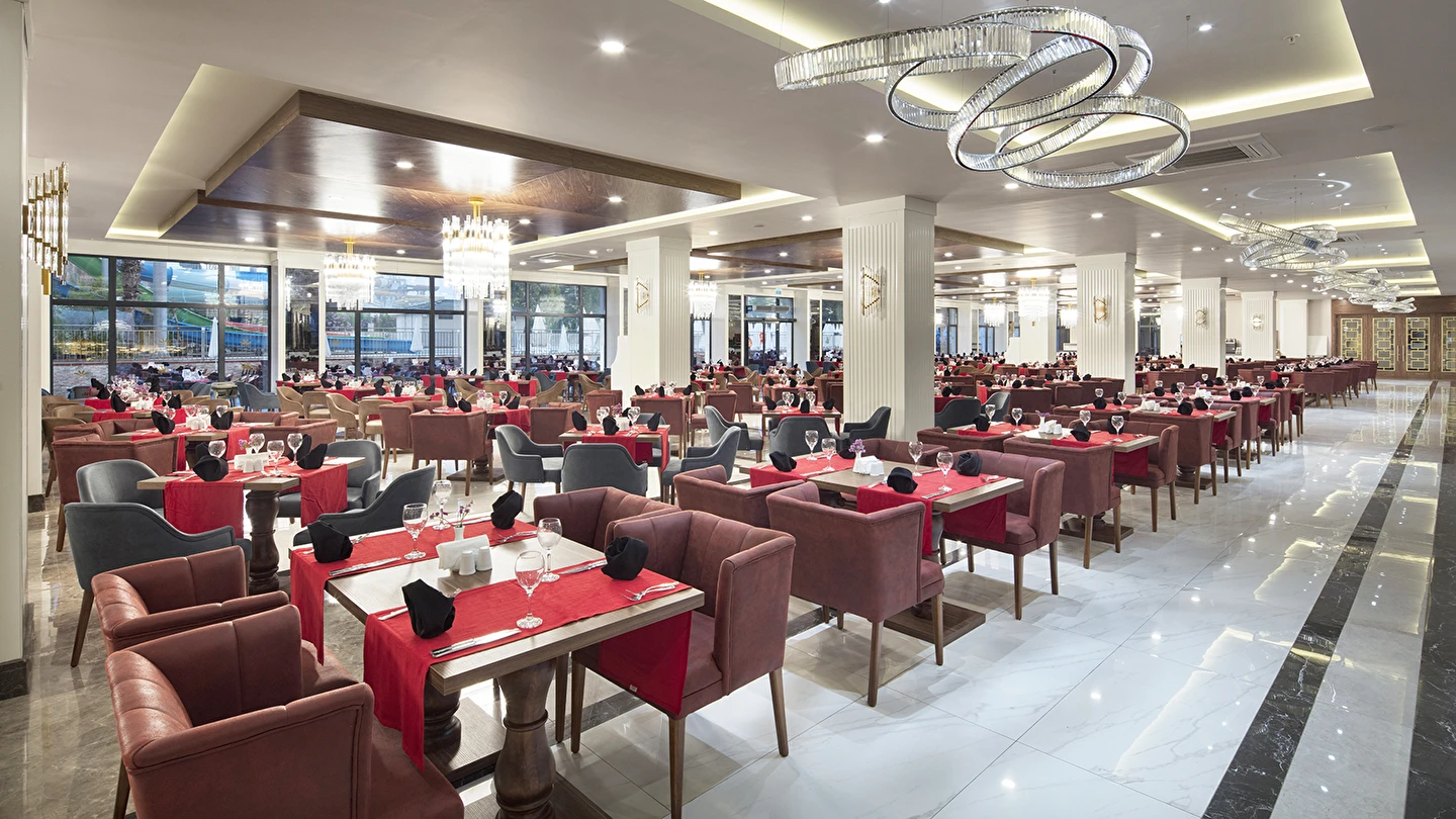 Sabah kahvaltısı, öğle ve akşam yemekleri açık büfe olup tesisin belirlediği markalar dahilinde lokal alkollü & alkolsüz içecekler ve bazı ithal alkollü & alkolsüz içecekler 24 saat ücretsizdir. Taze sıkılmış meyve suları, enerji içecekleri, şişeli içecekler ve konsept dışında kalan delüks içecekler ücretlidir. Alkollü içecekler kahvaltıda servis edilmez. Tüm Restaurant ve barlarda alkol ve içecek servisi kadeh ile yapılmaktadır. Türk kahvesi ücretsizdir.