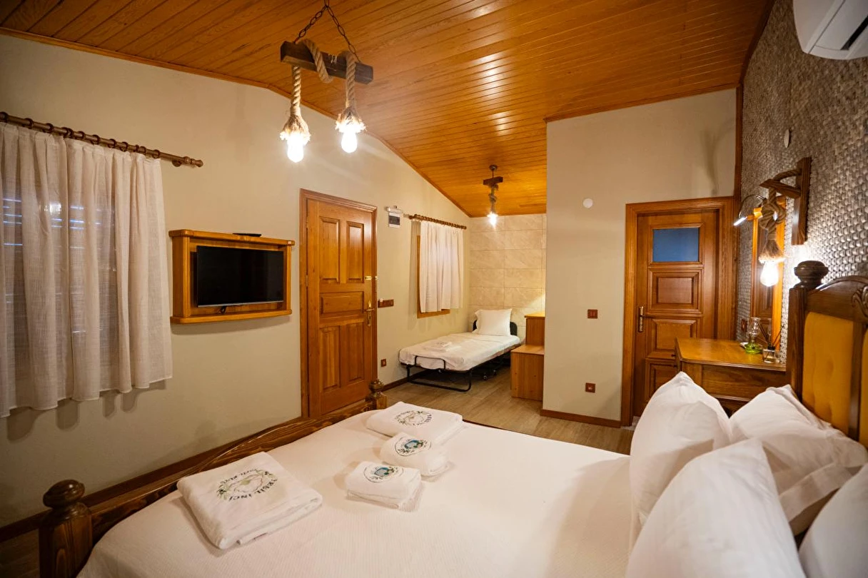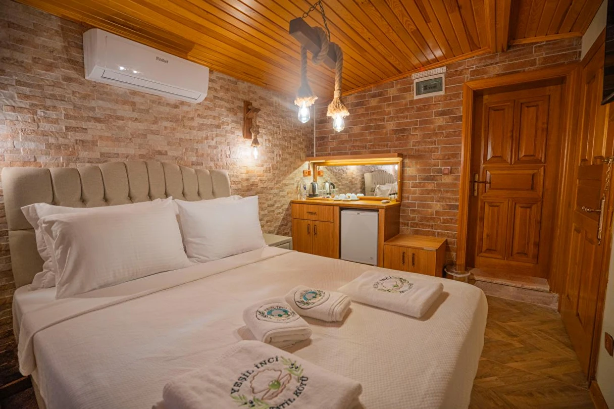 Yeşil İnci; alışılagelmiş oteller yerine örnek bir tatil köyü projesi olarak inşa edilmiştir. Doğa içinde huzurlu ve sakin bir tatili tercih eden, misafirlere hizmet vermekte olup, 12 yaş altı çocuk misafir kabul etmemektedir. Odalarımızda bir double yatak mevcut olup, 3. Kişi konaklamalar için ek yatak veya açılır kanepe kullanılmaktadır.