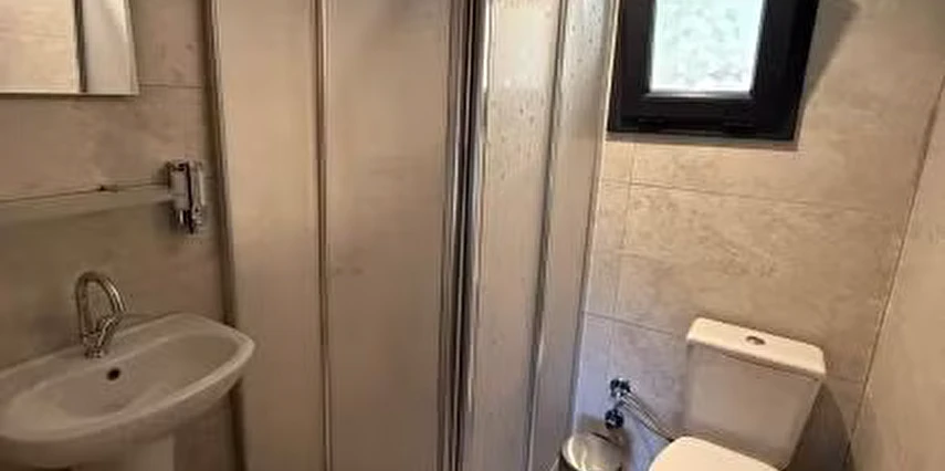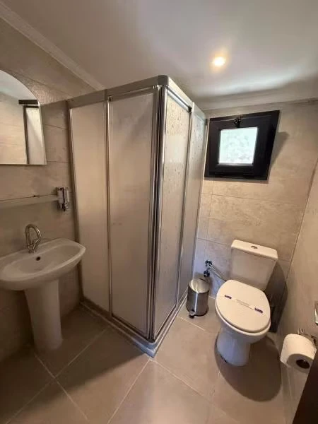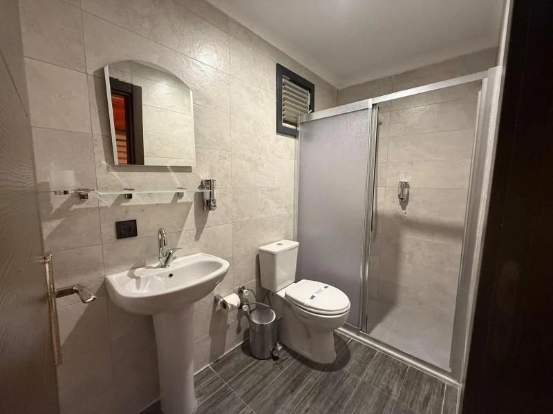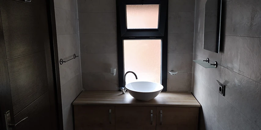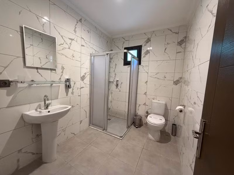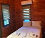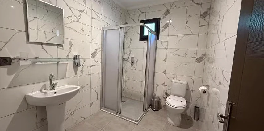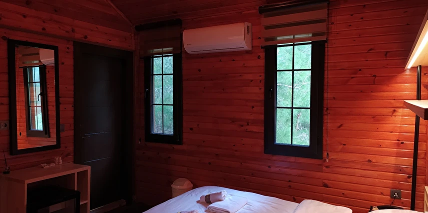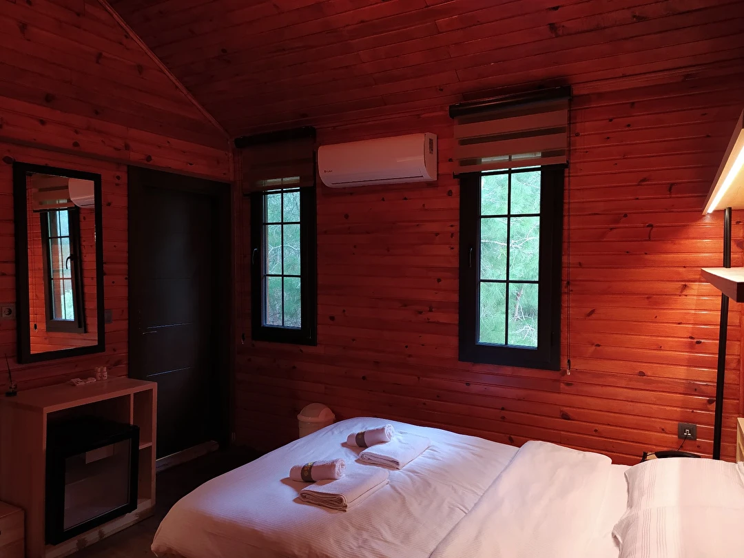 Minimalist Lüks: Konforlu yataklar, klima, özel banyo ve doğal tekstil ürünleriyle donatılmış iç mekanlar.