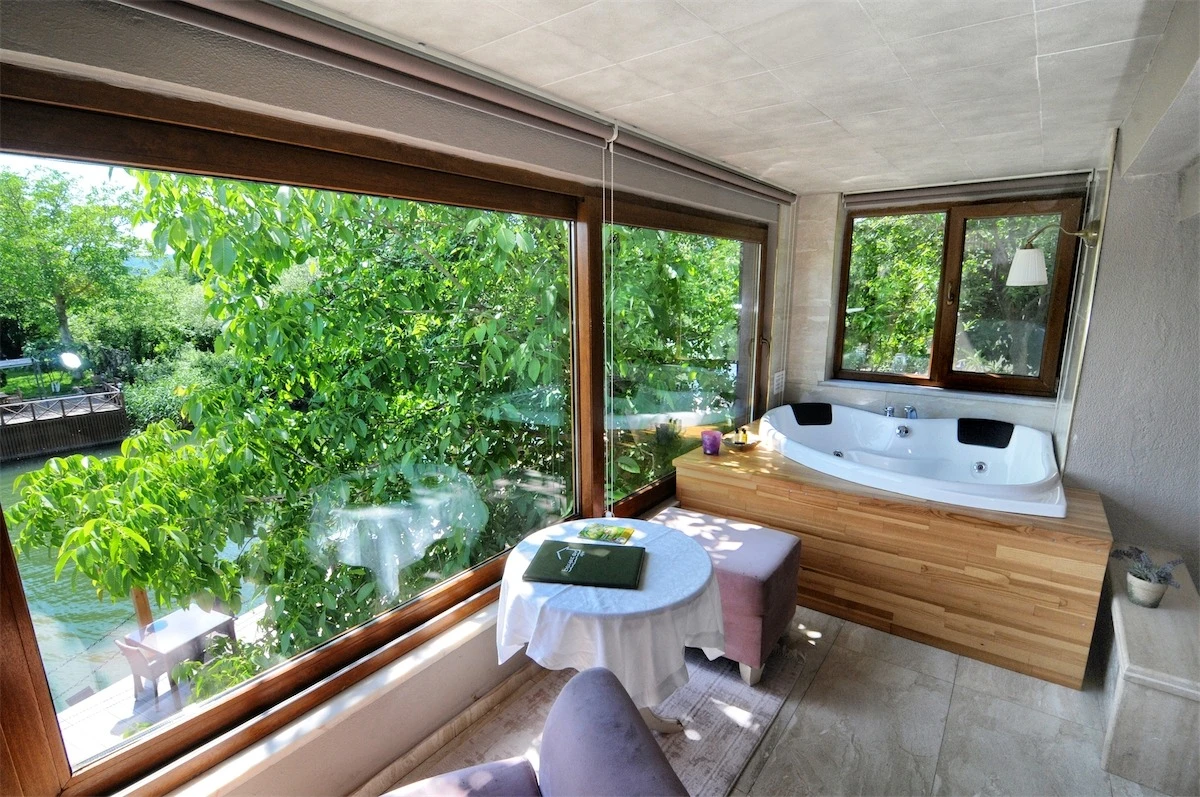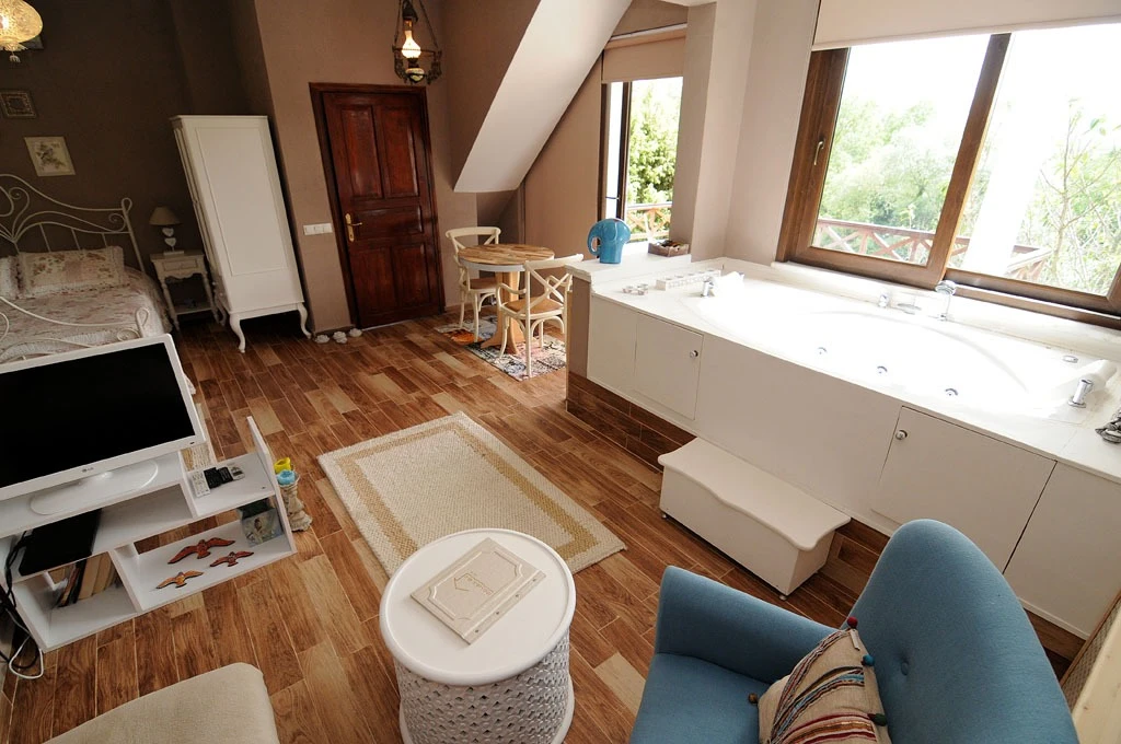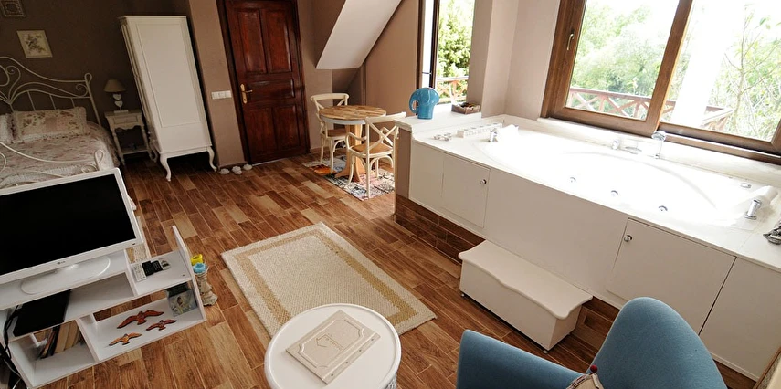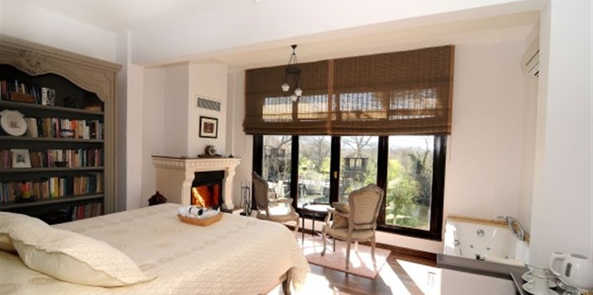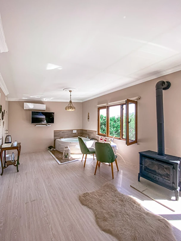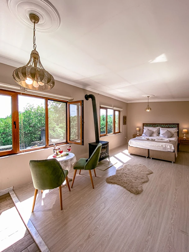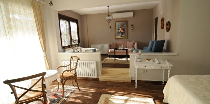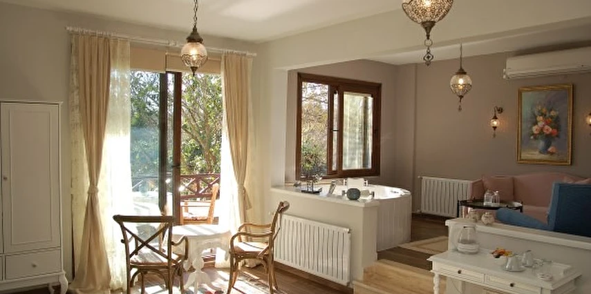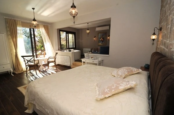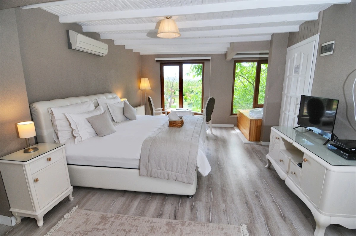Daha Fazla GösterGöksu Nehri’nin tam kıyısında, doğa ile iç içe dinlendirici bahçe ve ahşap iskelesi, şömineli özel restoranı ve birbirinden farklı ve özenle döşenmiş, nehir manzaralı, konforlu odalarıyla hizmet veren Beyaz Ev Ağva Otel, sessiz, sakin ve huzurlu bir atmosfer sunuyor. 3 adet jakuzili ve şömineli süit oda, 4 adet jakuzili süit oda ve 2 adet standart oda mevcut. Tesisin tüm odaları nehir manzaralı olup, zengin bir serpme kahvaltı ile misafirlerine unutulmaz bir konaklama deneyimi yaşatıyor. Ayrıca Yetişkin Oteli konsepti ile hizmet veren tesiste, akşam yemeği ve gün boyu servis alabileceğin nehir manzaralı ve şömineli a la carte restoran mevcut. Göksu Nehri kıyısında geniş bahçesi ve nehir manzaralı odalarıyla hizmet veren tesis; sessiz, sakin ve huzurlu bir atmosferde misafirlerini ağırlıyor. Şehrin karmaşasından biraz uzaklaşmak ve doğa ile iç içe olup huzurlu birkaç gün geçirmek isteyen misafirler tarafından sıklıkla tercih edilen Beyaz Ev Ağva, Ağva’nın en güzel yerlerinden birinde misafirlerini ağırlıyor. Göksu Nehri kıyısında yer alan tesis, huzur dolu ve dinlendirici bir ahşap iskele ve bahçeye sahip. Sessiz ve sakin atmosferinin yanı sıra güler yüzlü personelleri ve kaliteli hizmet anlayışıyla da öne çıkan tesis,nehir manzaralı odalarında konforlu bir konaklama deneyimi vadediyor. Yetişkin oteli olarak hizmet veren Beyaz Ev Ağva, 16 yaş üstü misafirleri ağırlıyor. Modern şekilde dekore edilmiş odalarında şık bir ortam sunan tesiste 7 süit ve 2 standart oda yer alıyor. Misafirler tesisin jakuzili odalarında konaklamayı tercih ederek tatiline renk katabilir. Tesiste konaklayan misafirler lezzetli bir kahvaltı ile güne başlayabilir. Romantik bir tatil için Beyaz Ev Ağva’ya gelen misafirler, nehir kıyısındaki dinlenme alanlarında keyifle zaman geçirebilir. Misafirler, nehirde tekne turu yapabilir ya da Ağva Plajı’na gidebilir. Göksu Nehri kıyısında geniş bahçesi ve nehir manzaralı odalarıyla hizmet veren tesis; sessiz, sakin ve huzurlu bir atmosferde misafirlerini ağırlıyor.