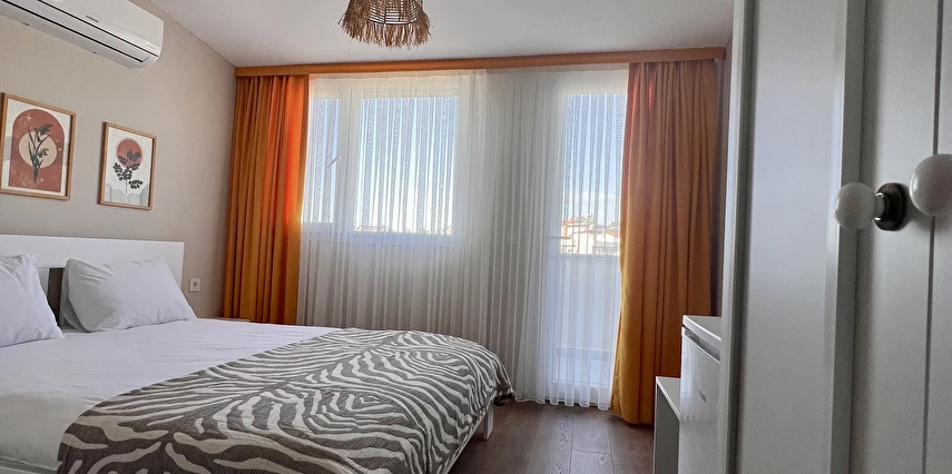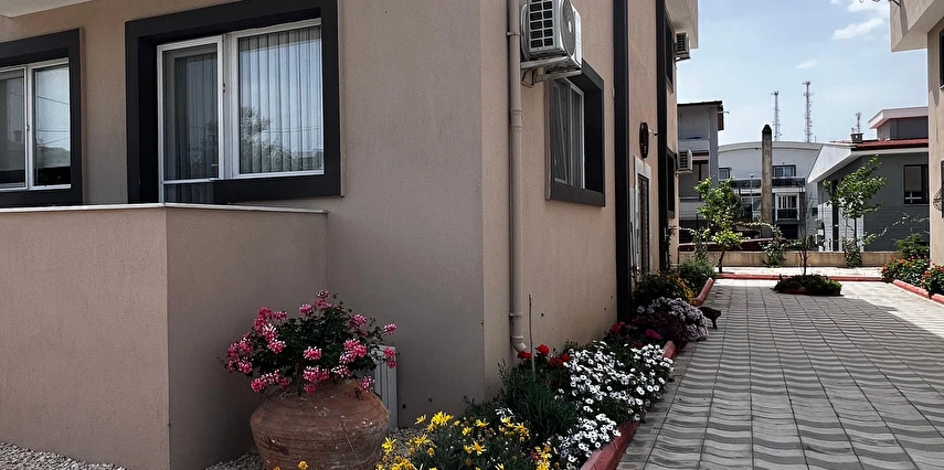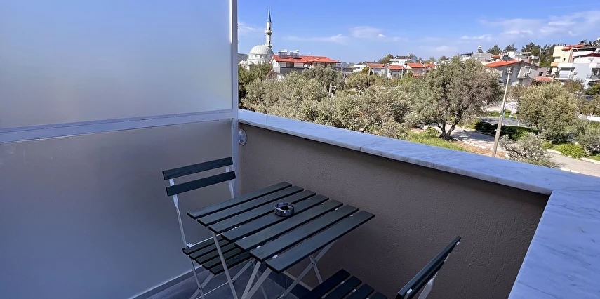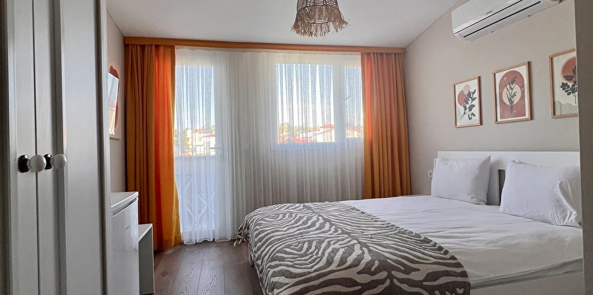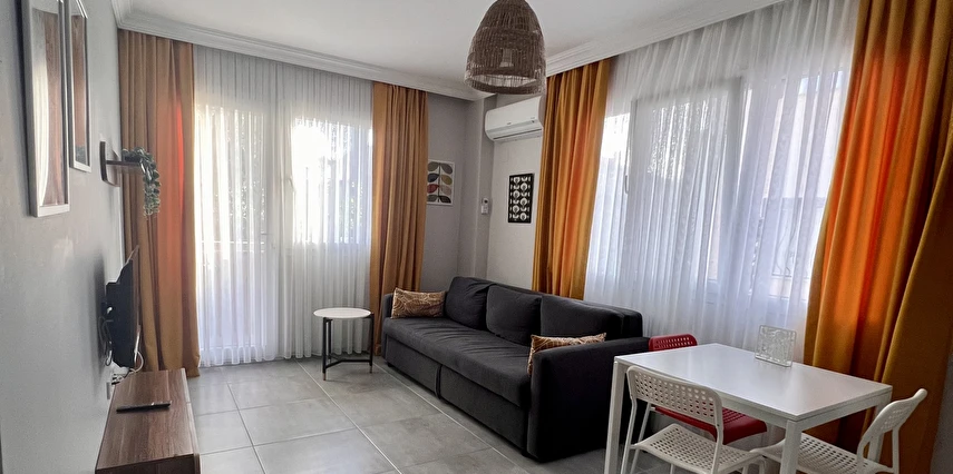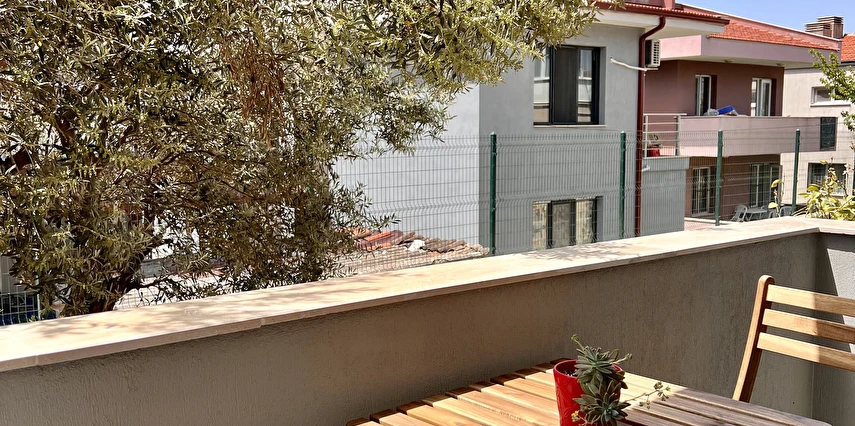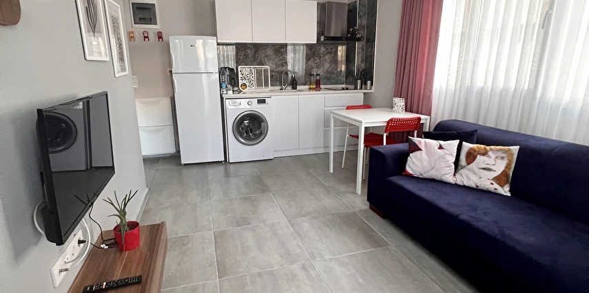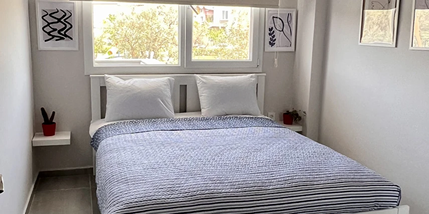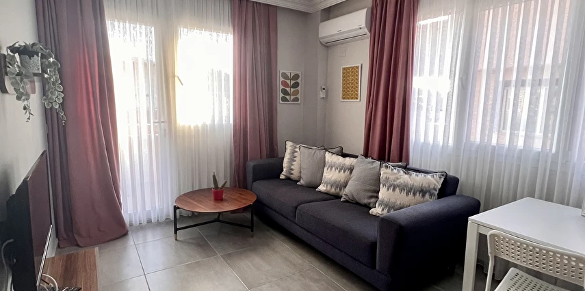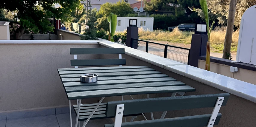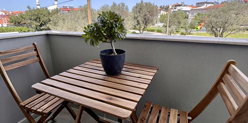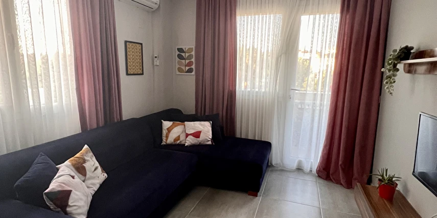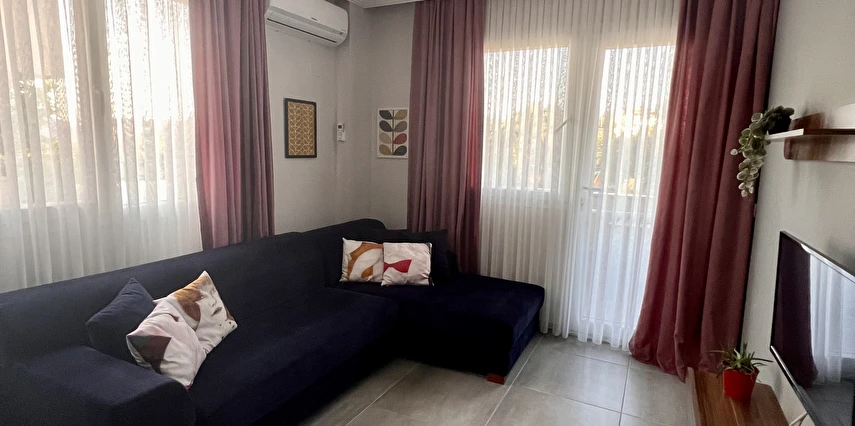 Dairemiz, tam bir ev konforu sunar. Binamızda her biri dört kişilik balkonlu dört adet 1+1 daire ve ikişer kişilik balkonlu dört adet otel tarzı oda bulunmaktadır. Yeni binada her şey özenle seçilmiş ve yenidir. Her dairede çift kişilik yatak ve dolap bulunan bir yatak odası, yatak olabilen koltuklu bir salon, açık mutfak ve balkon vardır. Salondaki klima tüm daireyi ısıtıp soğutabilir. İki katlı binanın üst katında, ön bahçeye bakan dairemiz bulunmaktadır. TV, Ethernet bağlantılı bir smart TV’dir. Bina kameralarla izlenmekte ve yangın güvenliği için duman dedektörleri bulunmaktadır.