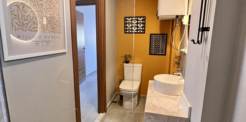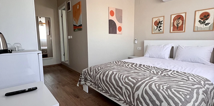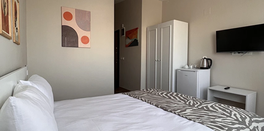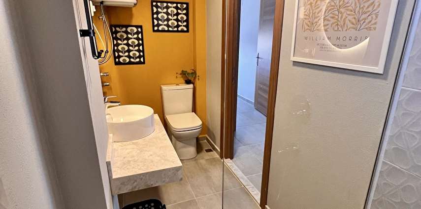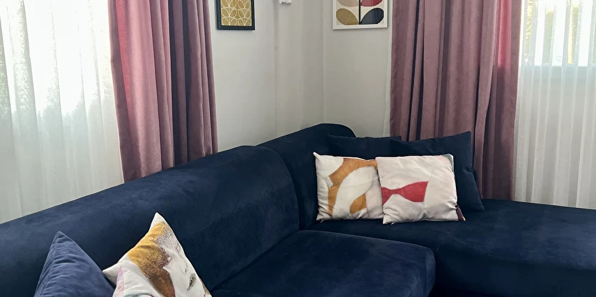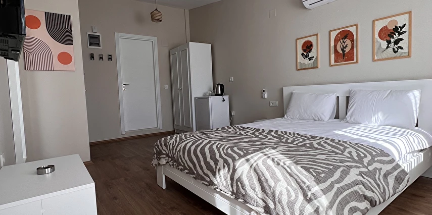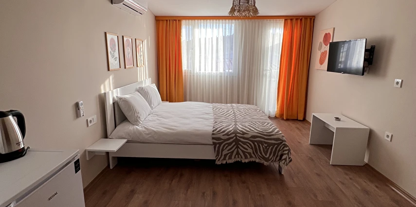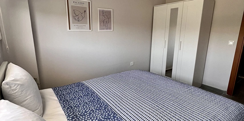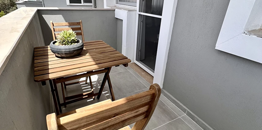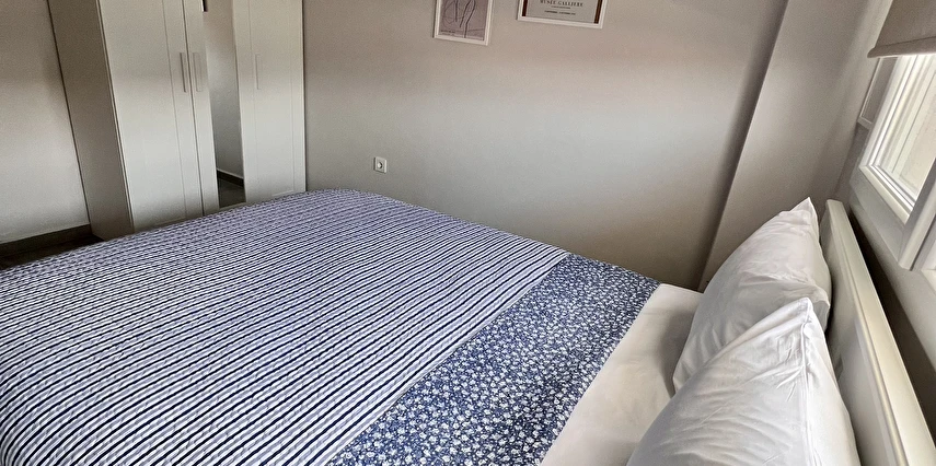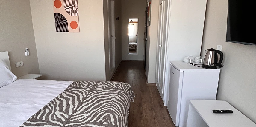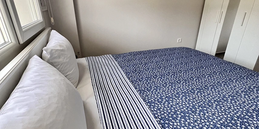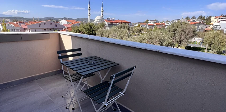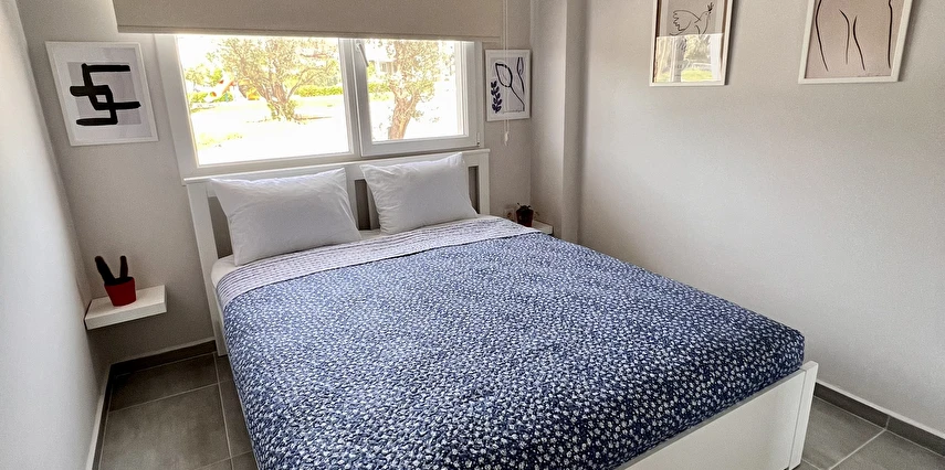 Dairemiz, tam bir ev konforu sunar. Binamızda her biri dört kişilik balkonlu dört adet 1+1 daire ve ikişer kişilik balkonlu dört adet otel tarzı oda bulunmaktadır. Yeni binada her şey özenle seçilmiş ve yenidir. Her dairede çift kişilik yatak ve dolap bulunan bir yatak odası, yatak olabilen koltuklu bir salon, açık mutfak ve balkon vardır. Salondaki klima tüm daireyi ısıtıp soğutabilir. İki katlı binanın üst katında, ön bahçeye bakan dairemiz bulunmaktadır. TV, Ethernet bağlantılı bir smart TV’dir. Bina kameralarla izlenmekte ve yangın güvenliği için duman dedektörleri bulunmaktadır.
