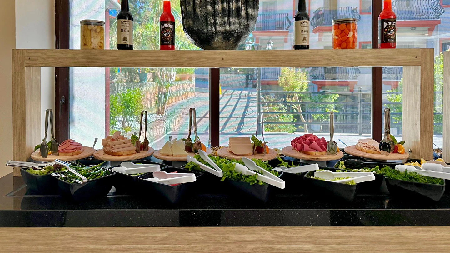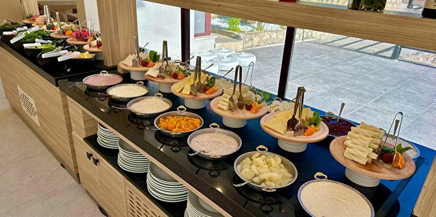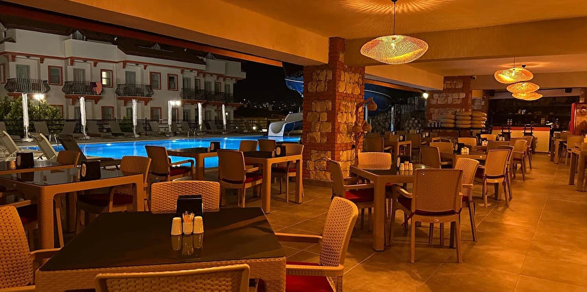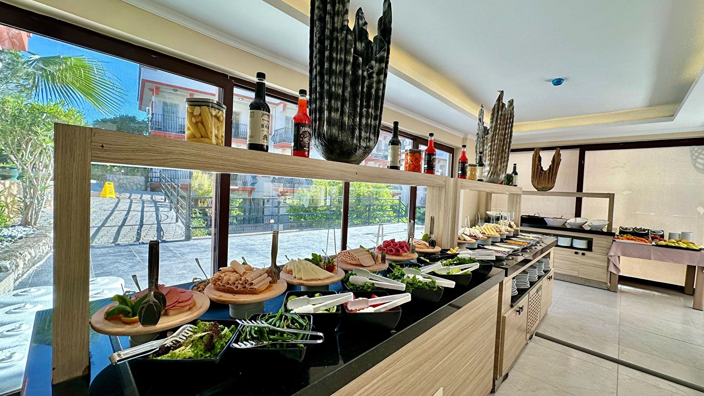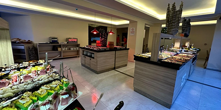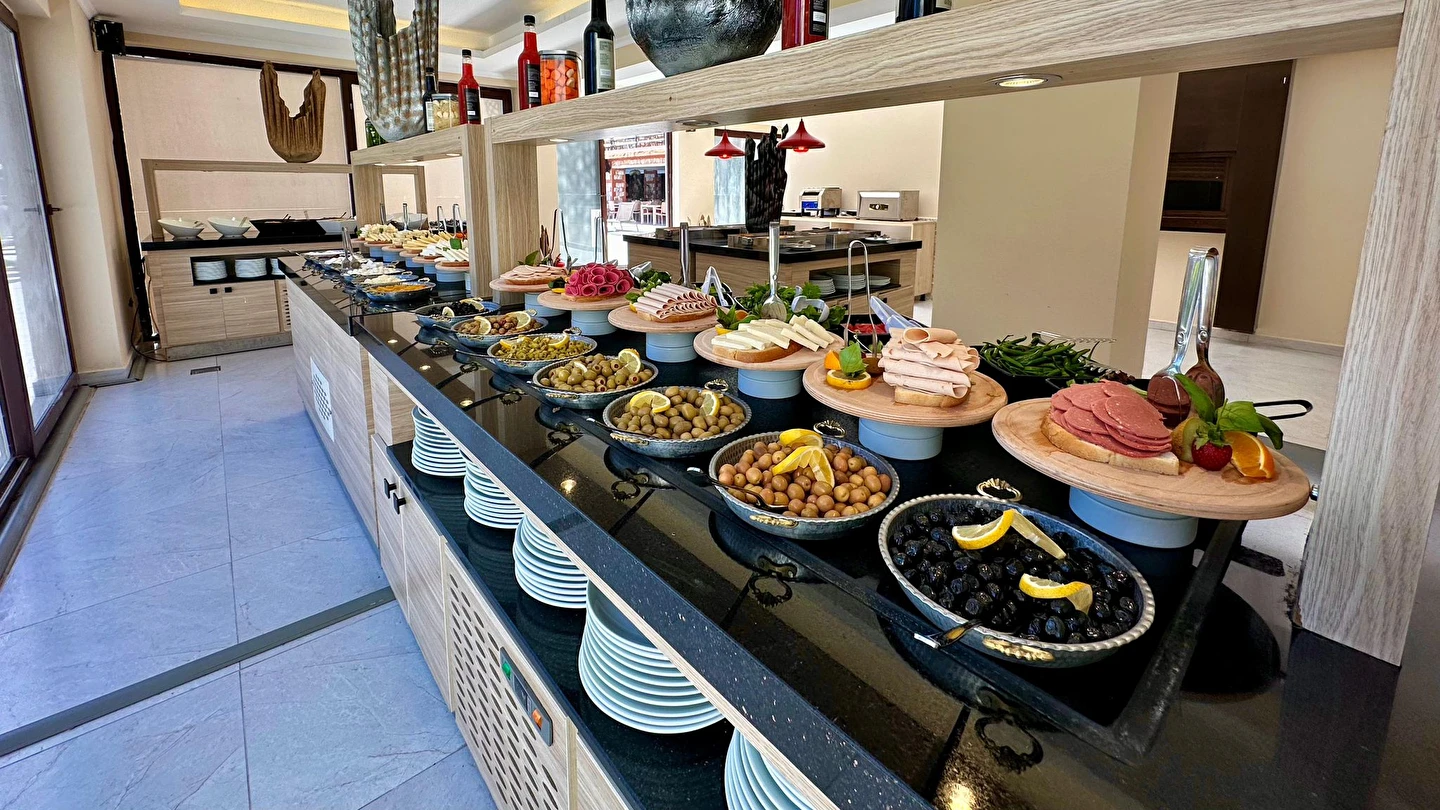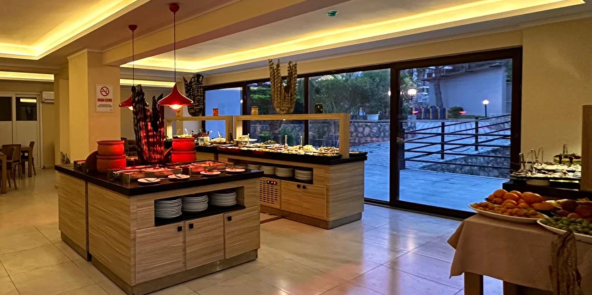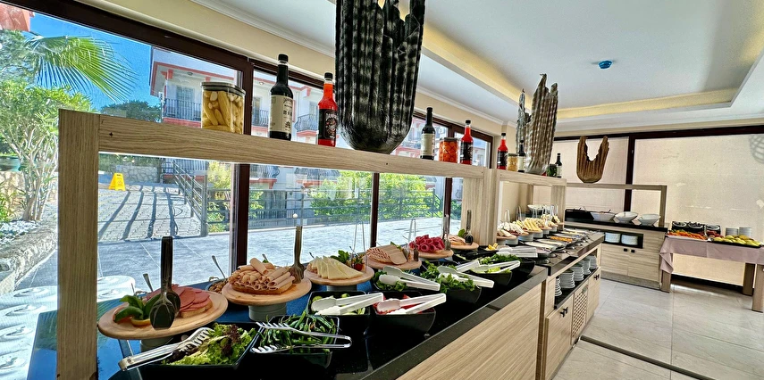Sabah-öğle ve akşam yemekleri açık büfe olup, tesisin belirlemiş olmuş olduğu markalar dahilinde yerli alkollü ve alkolsüz içecekler 10:00 ile 23:00 saatleri arasında ücretsizdir. 23:00 dan itibaren kullanımlar extra ücretlendirmeye tabiidir . Tesiste yerli alkollü içecek olarak rakı-vodka-gin-bira ve şarap sunulmaktadır. Alkolsüz yerli içecekler olarak cola-fanta-sprıte-soda-tonıc-çay-kahve-süt ve konsantre meyve suları sunulmaktadır. Yabancı alkollü içecekler - kapalı kutu ve şişe alkollü alkolsüz içecekler -Türk kahvesi ve taze sıkılmış meyve suları extra ücretlendirmeye tabiidir.