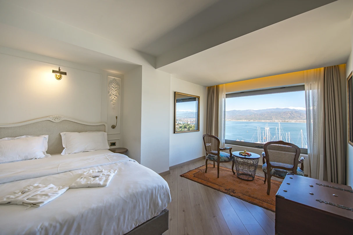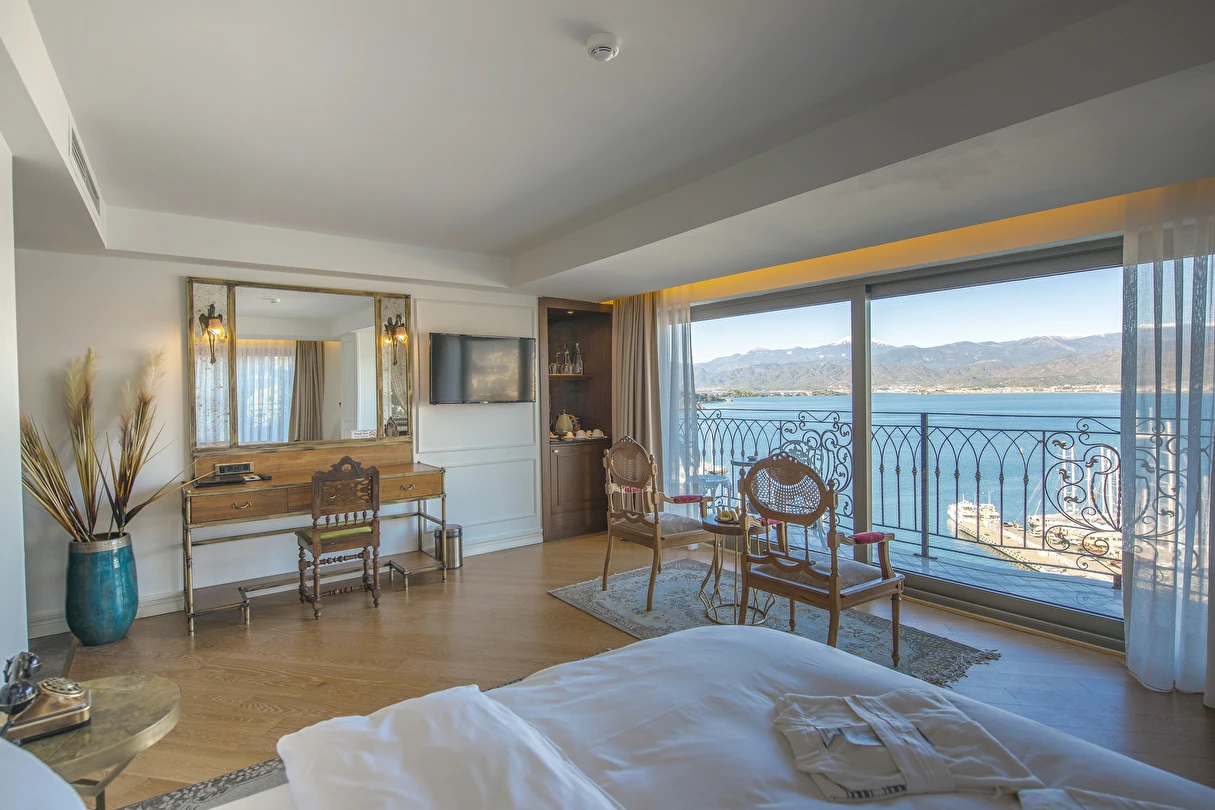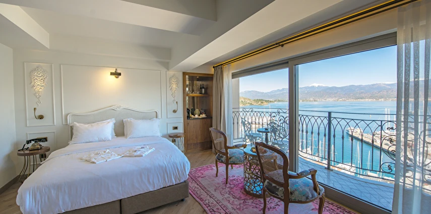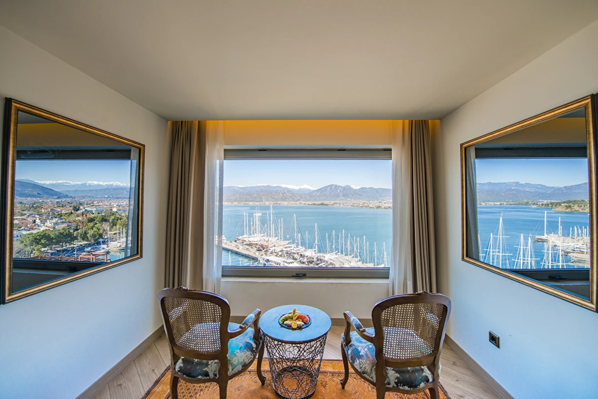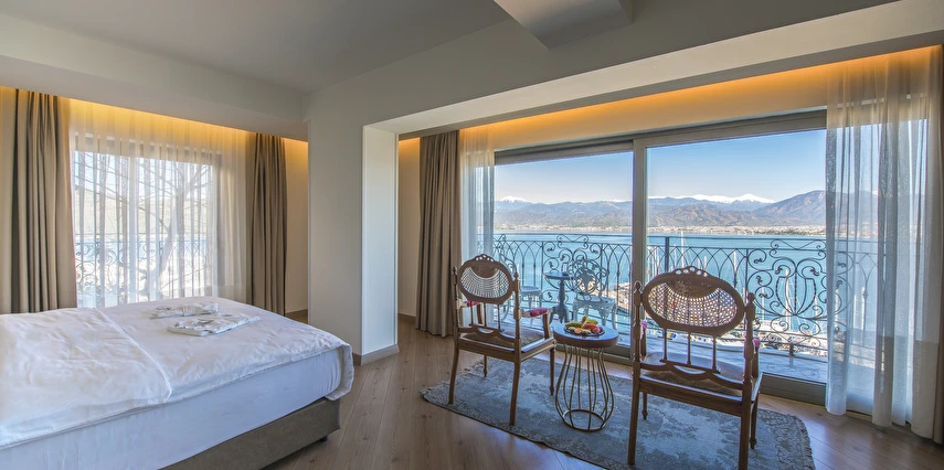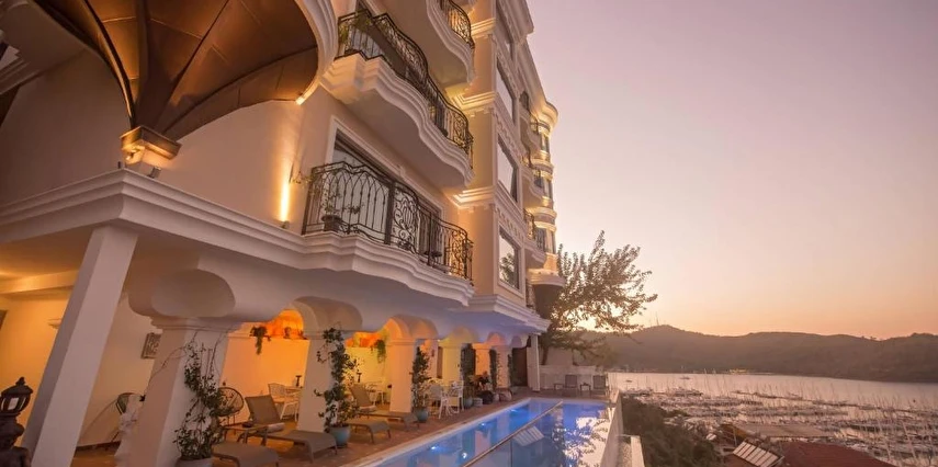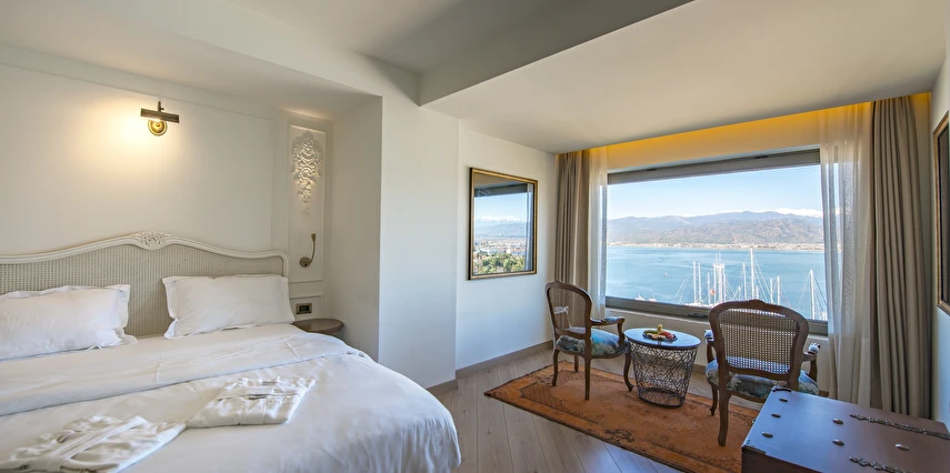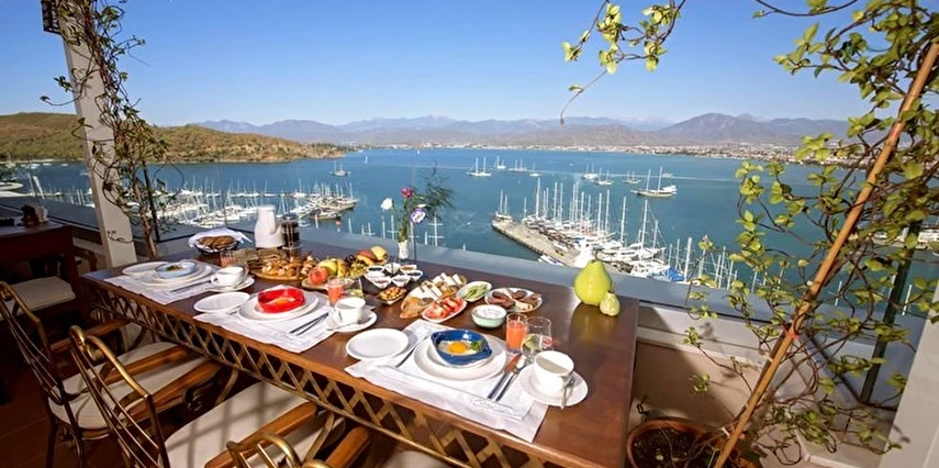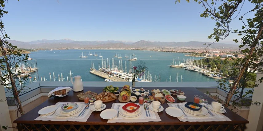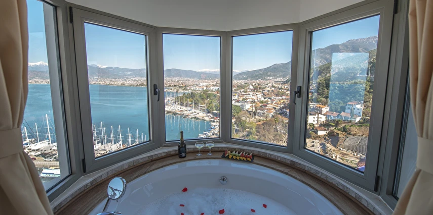 Casa Margot Hotel offers an unlimited view of nature and the sea with its bird's-eye view location to Fethiye Bay in every season. You will experience exclusivity during your vacation, from Deluxe rooms with private hot tubes, where every detail is carefully prepared for you, to the 75m² King Suite with a private Turkish Bath, which combines elegance, sophistication, and nobility with marble bathrooms. You can imagine our open buffet breakfast like a feast in our simple yet stylish restaurant, where Fethiye's breathtaking view meets the dizzying blue of the Mediterranean. With its comfortable and peaceful atmosphere in all seasons, far from the noise of the beach and the city but located in the heart of the city, Casa Margot Hotel will be happy to host you.