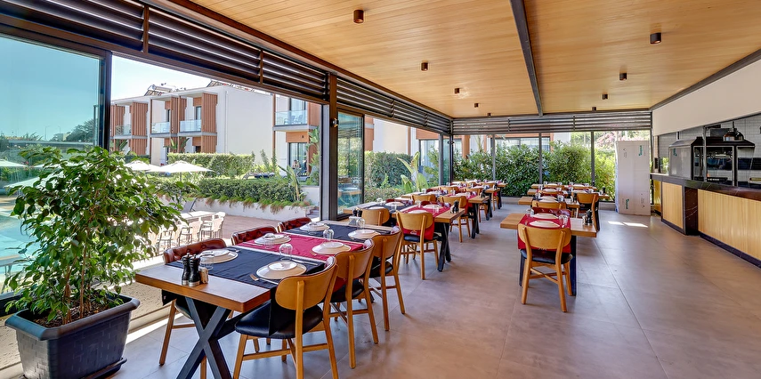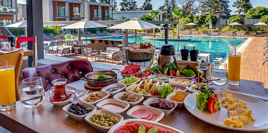 Sabah kahvaltısı serpme kahvaltı şeklinde masaya servis olarak sunulmaktadır. Açık büfe servisi mevcut değildir. Kahvaltı esnasında alınan demleme çay, bitkisel çaylar, omlet çeşitleri ücretsizdir. Taze sıkılmış portakal suyu ve Türk Kahvesi ücretlidir. Diğer yiyecek ve içecekler extra ücrete tabidir. Restoranda çocuk menüsü bulunmaktadır.