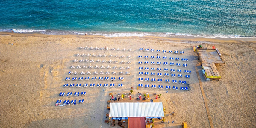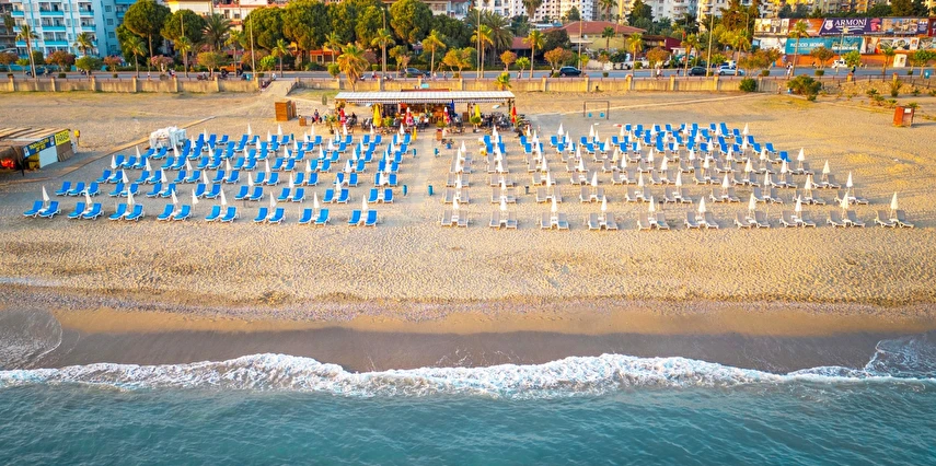 - Tesisin kendine ait, alt geçidi olan, özel plajı bulunmaktadır, Plaja mesafesi, yürüyerek 400 mt dir. Plajda şezlong+şemsiye ücretsiz diğer sunulan tüm hizmetler ücretlidir.