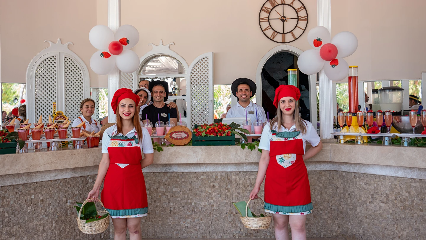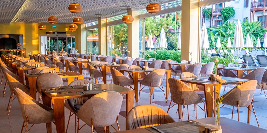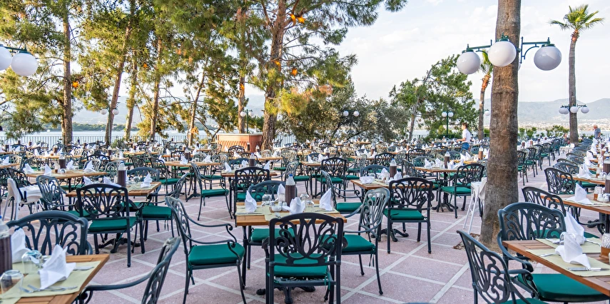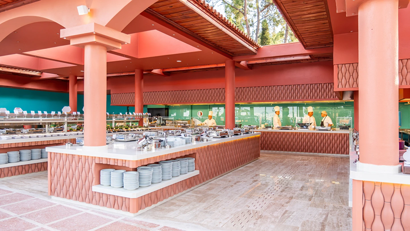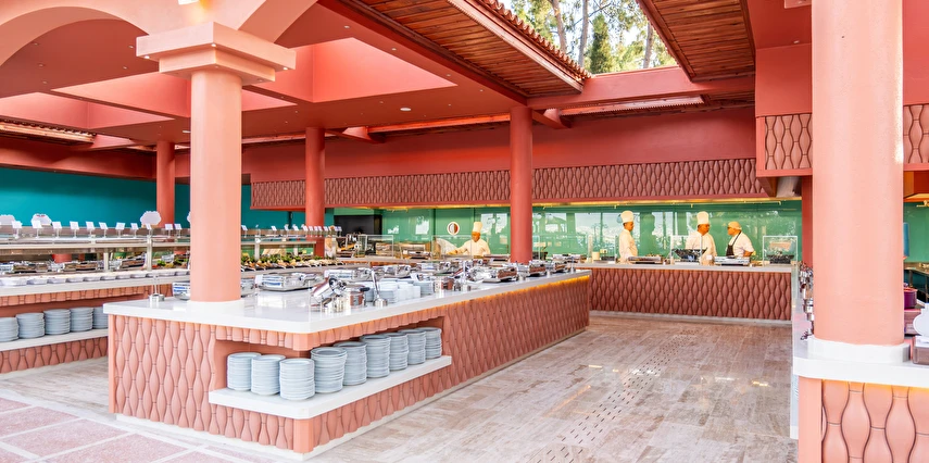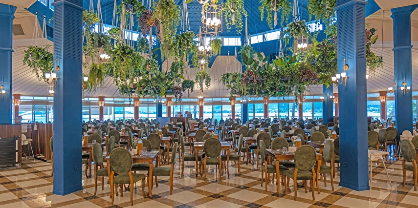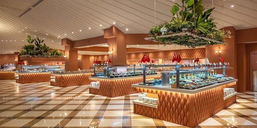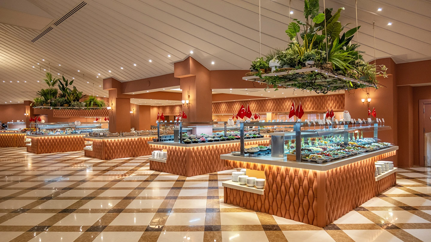 Sabah kahvaltısı, öğle ve akşam yemekleri açık büfe olup tesisin belirlemiş olduğu markalar dahilinde yerli ve bazı yabancı yüksek alkollü ve alkolsüz içecekler 24 saat ücretsizdir. Yerli ve yabancı içeceklerin şişe ile servisi, konsepte dahil olmayan yabancı içecekler ücretlidir.