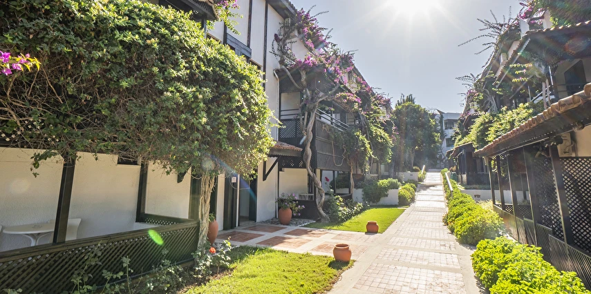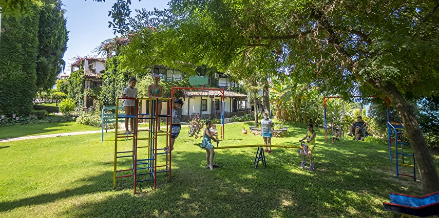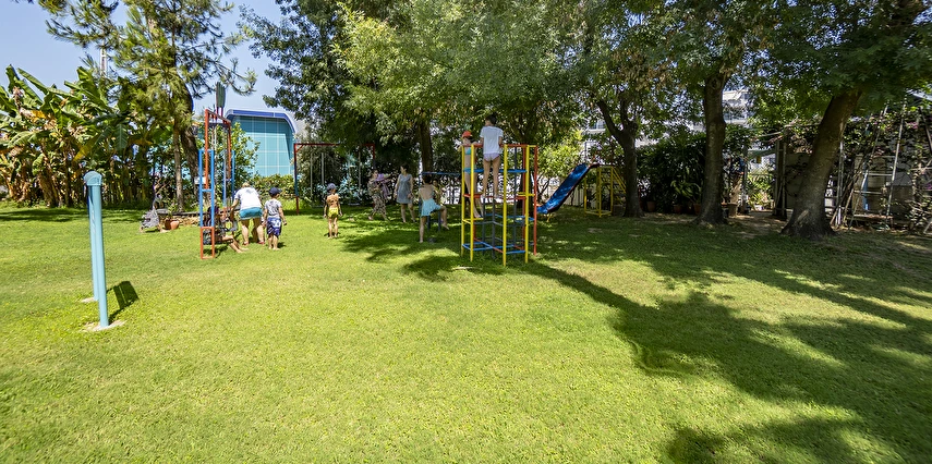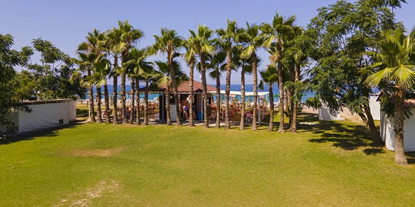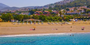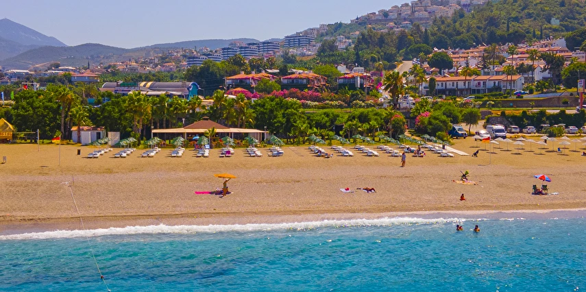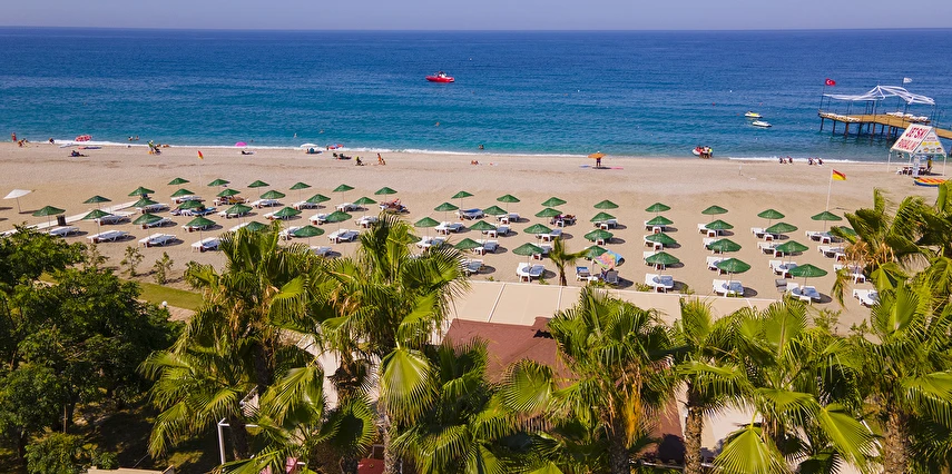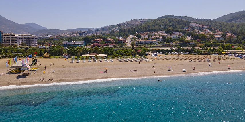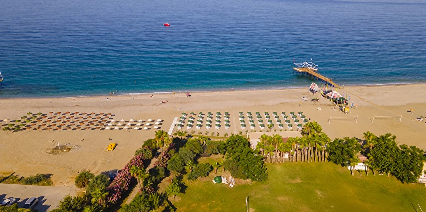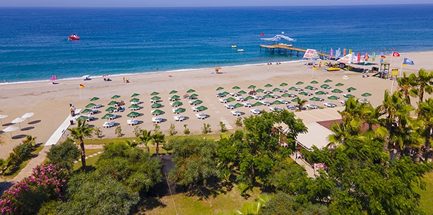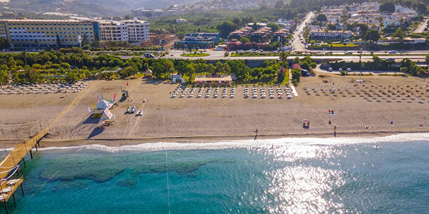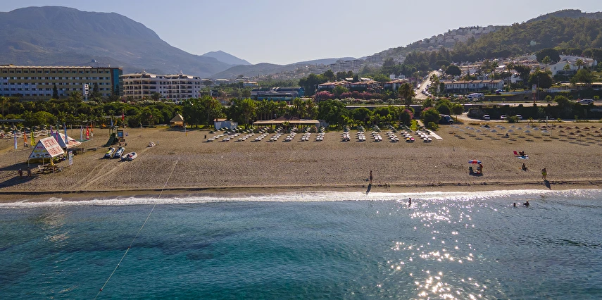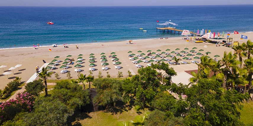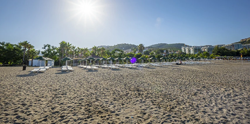 Plaja tünel ile ulaşılmaktadır. “Mavi Bayraklı” plaj, resmi cankurtaran gözetiminde yaklaşık 100 m genişliğinde ve 100 m uzunluğundadır. Şezlong, şemsiye, plaj havlusu (Wellness Center havlu kartı ile), tuvaletler, 1 engelli tuvaleti, soyunma kabini ve Beach Bar mevcuttur. Plaj küçük çakıl taşlı ve kumludur. Plajdaki su sporları hizmeti özel işletme tarafından yapılmaktadır.