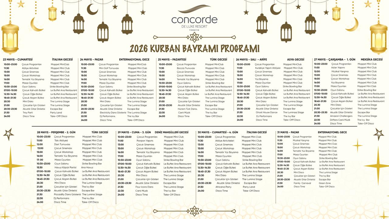 Gündüz ve Akşam Animasyon, Spor, Müzik ve Şov Programları mevcuttur.