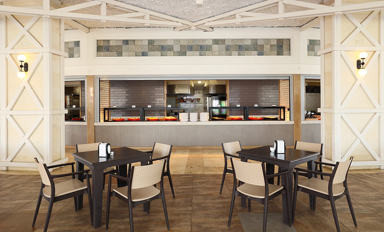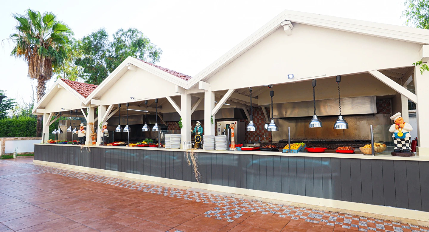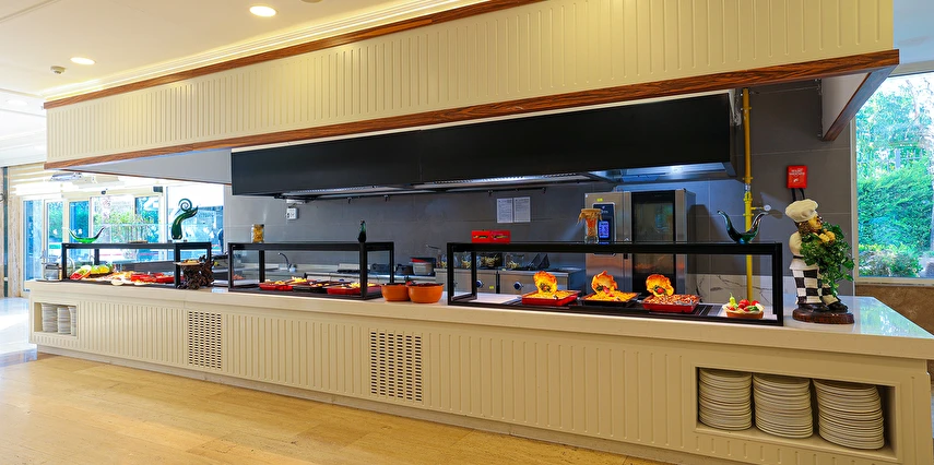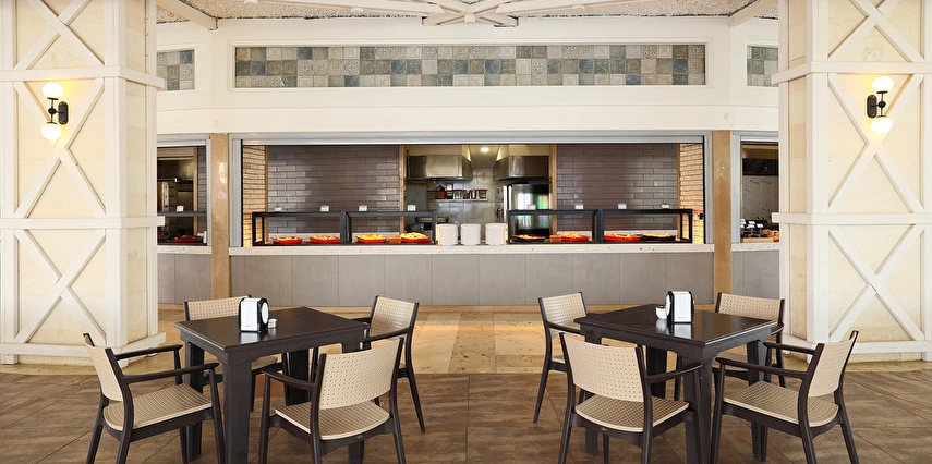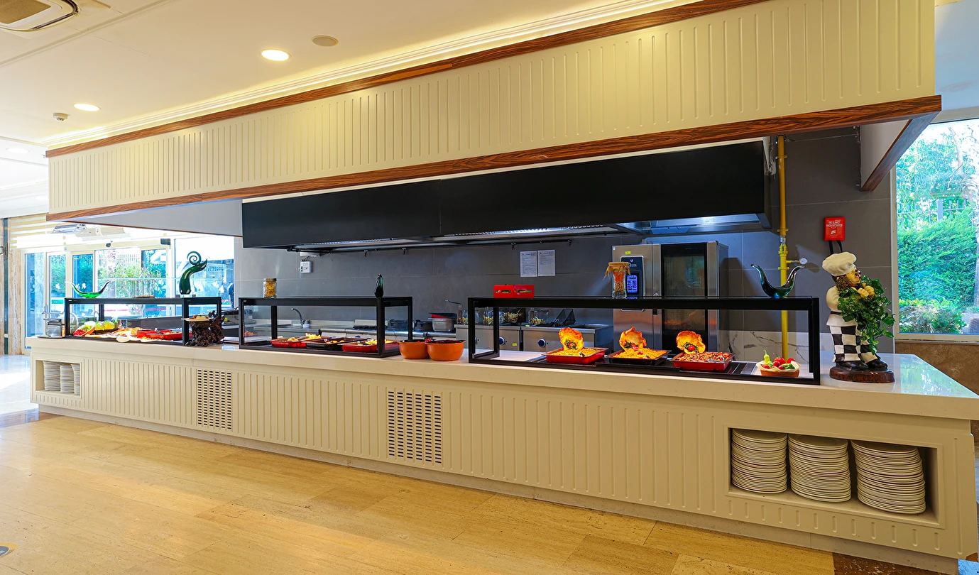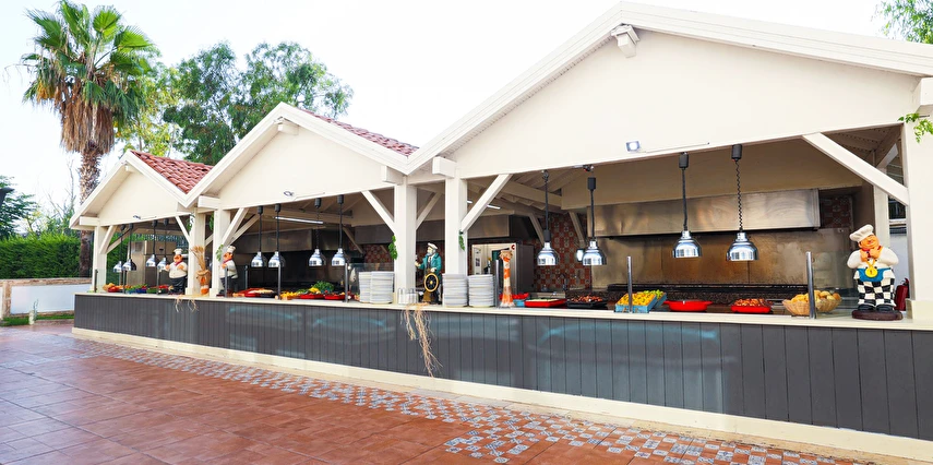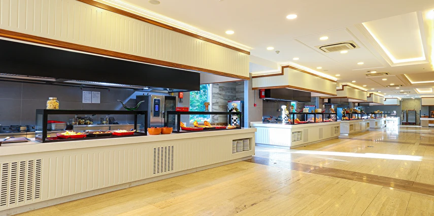 Sabah kahvaltısı, öğle ve akşam yemekleri açık büfe olup tesisin belirlediği markalar dahilinde yerli alkollü ve alkolsüz içecekler 24 saat arasında ücretsizdir. Uluslararası yöresel kahveler ücretsizdir. Taze sıkılmış sebze, meyve suları ve enerji içecekleri ücretlidir.