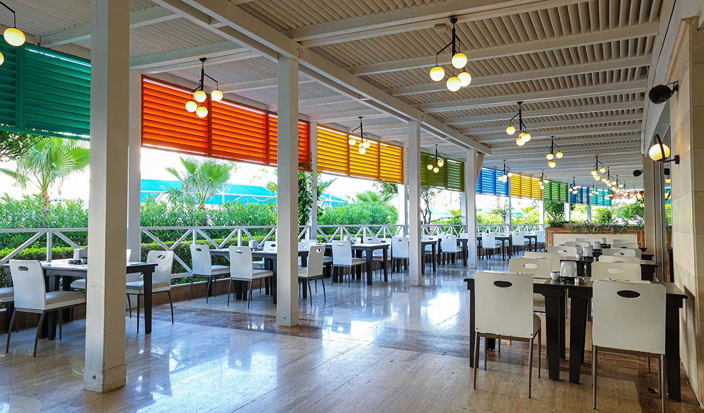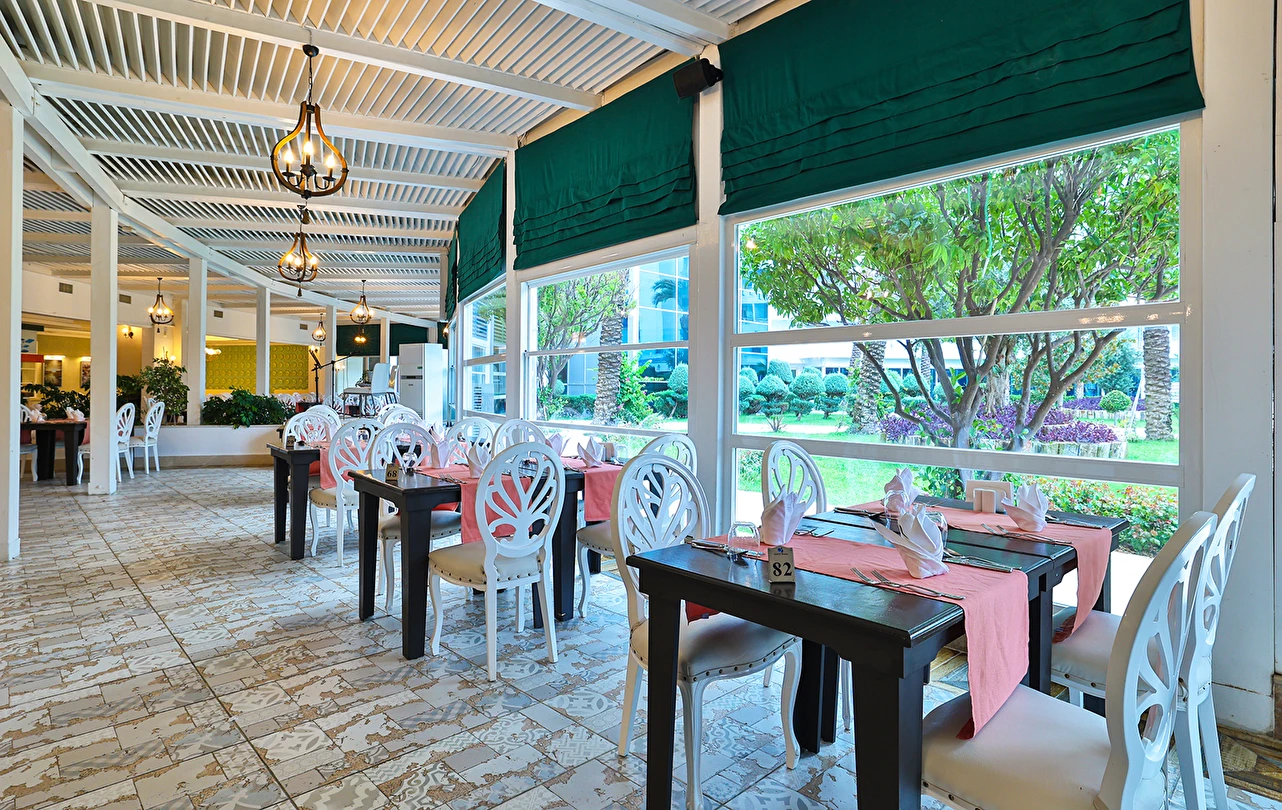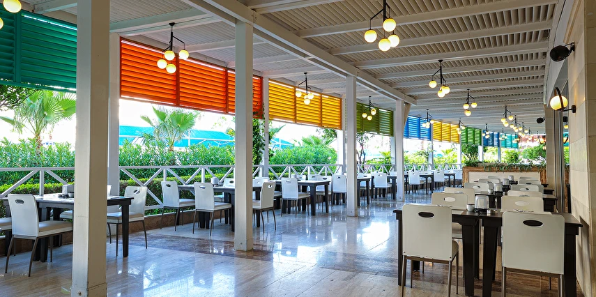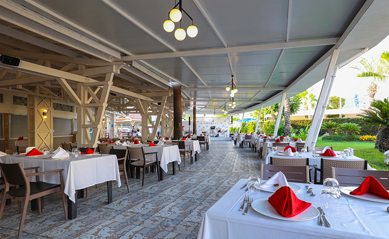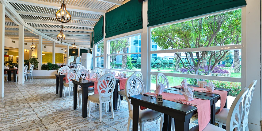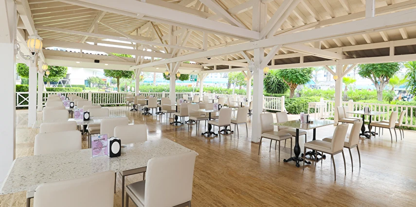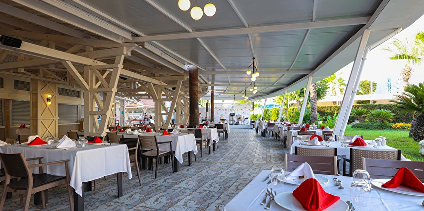 Sabah kahvaltısı, öğle ve akşam yemekleri açık büfe olup tesisin belirlediği markalar dahilinde yerli alkollü ve alkolsüz içecekler 24 saat arasında ücretsizdir. Uluslararası yöresel kahveler ücretsizdir. Taze sıkılmış sebze, meyve suları ve enerji içecekleri ücretlidir.