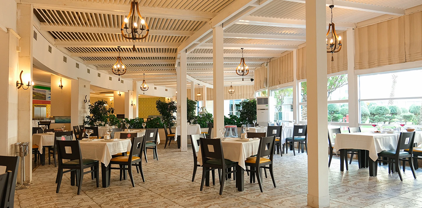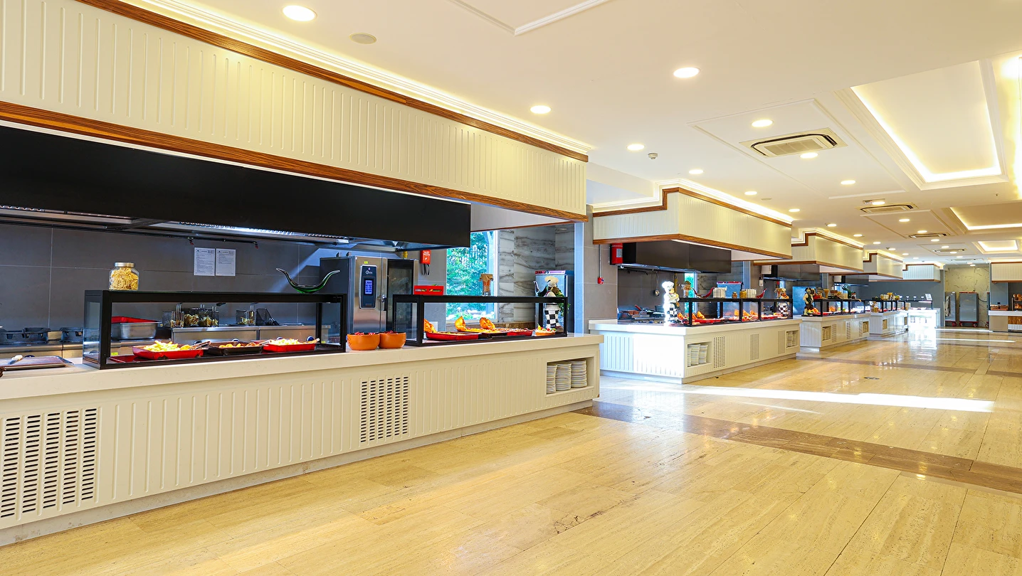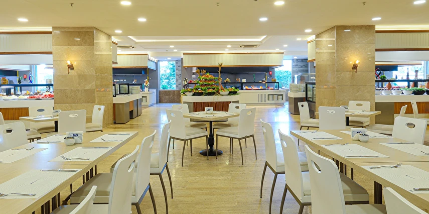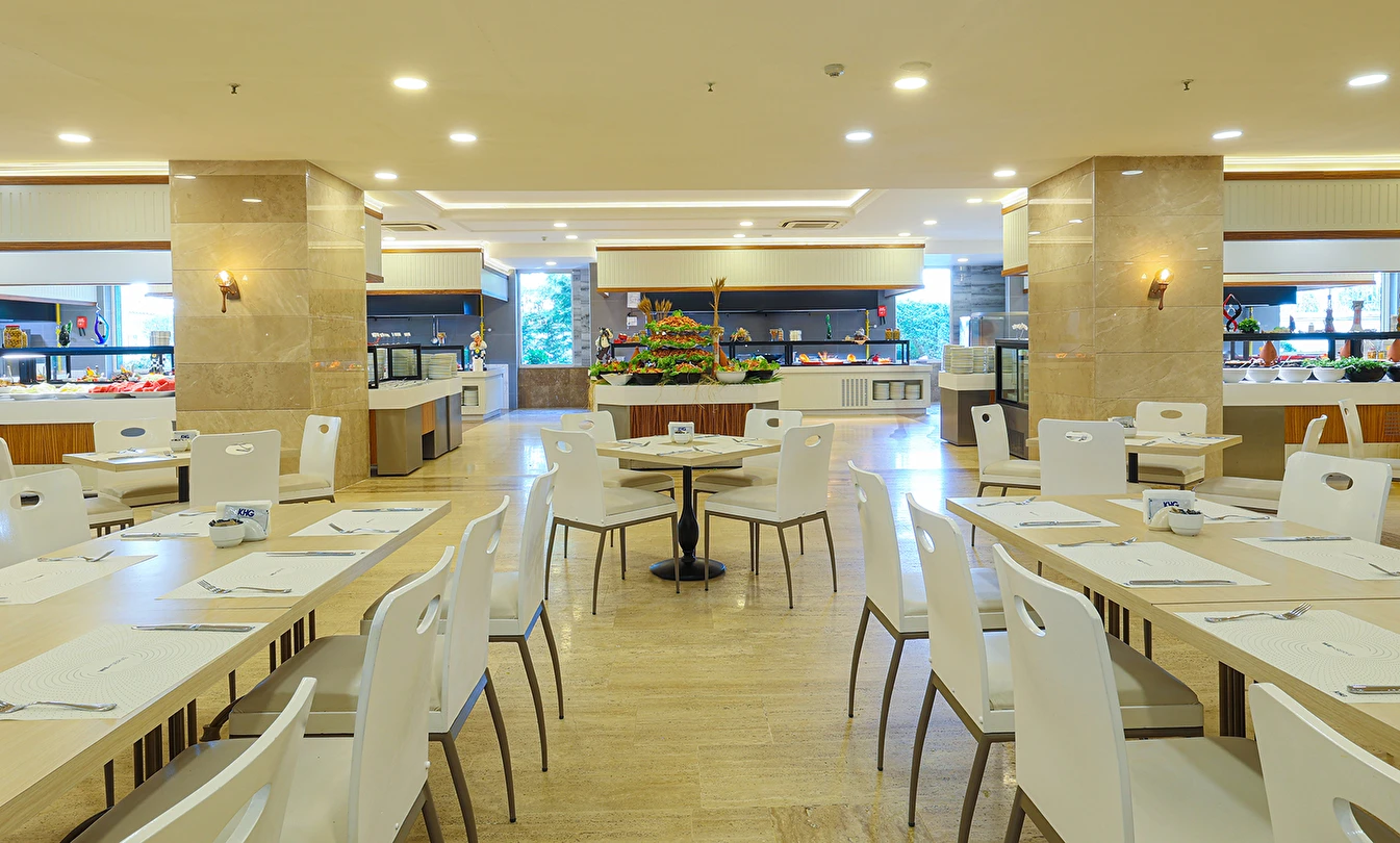 Ana Restoranda diyet menüsü, vejeteryan menüsü, çocuk büfesi ve yöresel temalı yiyecekler bulunmaktadır.