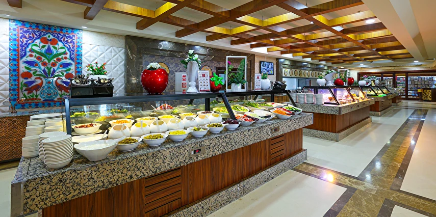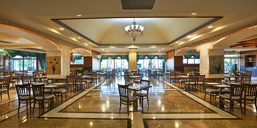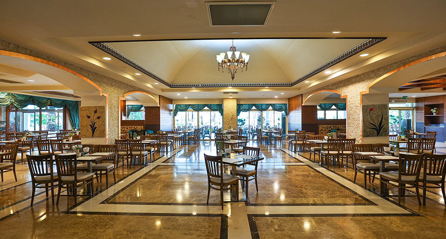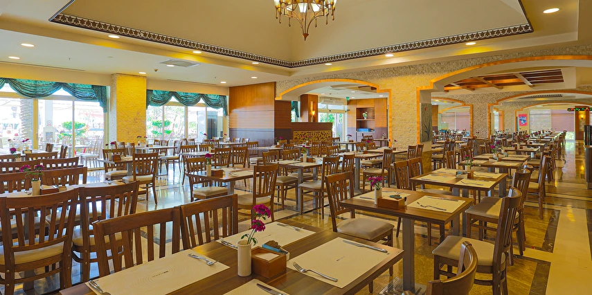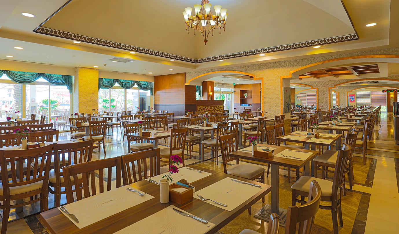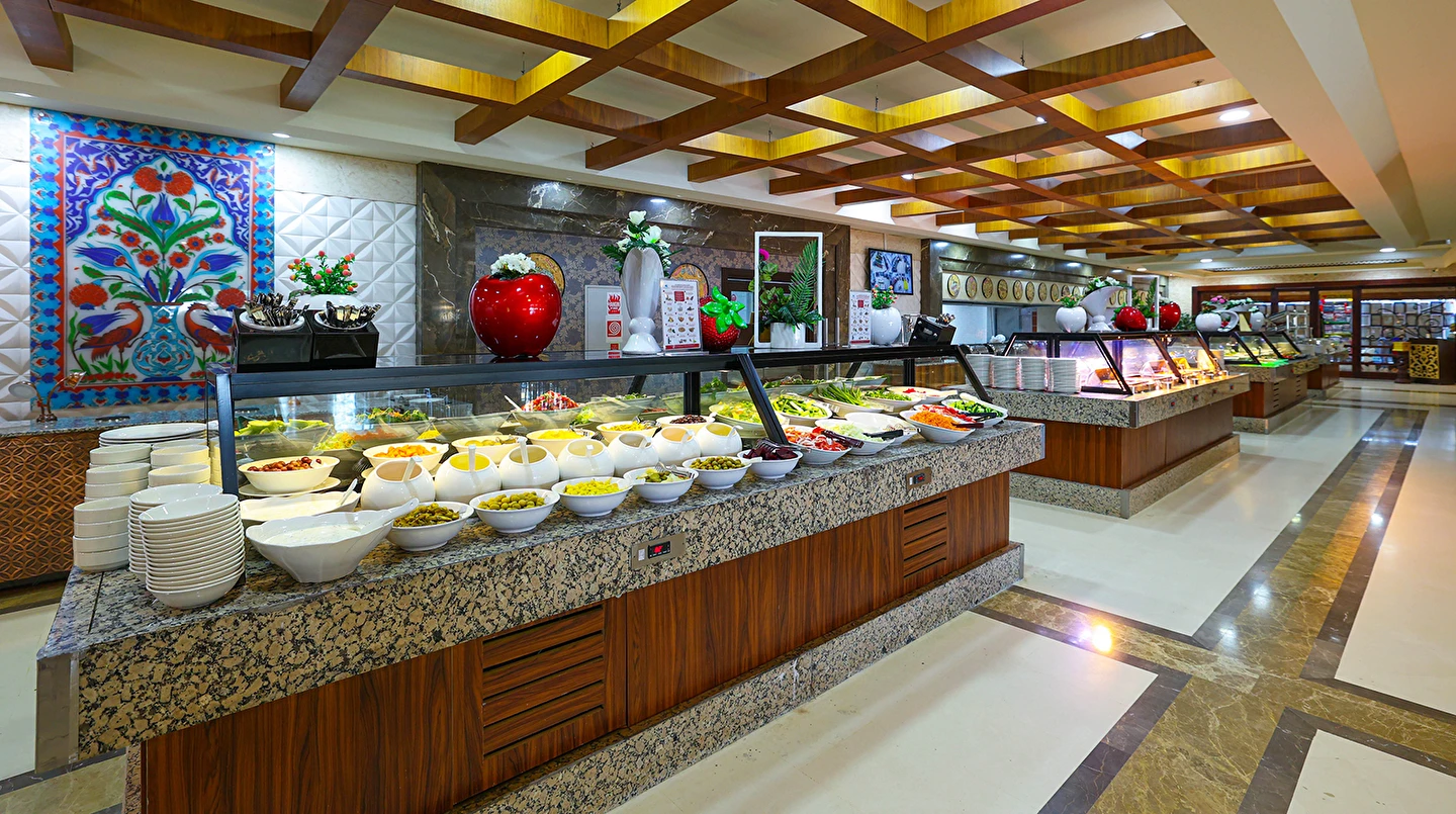 Sabah kahvaltısı, öğle ve akşam yemekleri açık büfe olup tesisin belirlediği markalar dahilinde yerli alkollü ve alkolsüz içecekler 24 saat ücretsizdir. Uluslararası yöresel kahveler ücretsizdir. Taze sıkılmış Sebze, Meyve Suları ve Enerji içecekleri, Tüm şişeli alkollü ürünler, tüm özel yerli-yabancı şaraplar ve şampanyalar, alkollü Premium içkiler (10 ve 12 yıllık ve üstü VSOP, XO Konyaklar), Alakart Restoranlarda tüm şarap, şampanya ve özel yemek siparişleri ekstra ücret ile servis edilmektedir. (Sofra Şarabı Hariç)