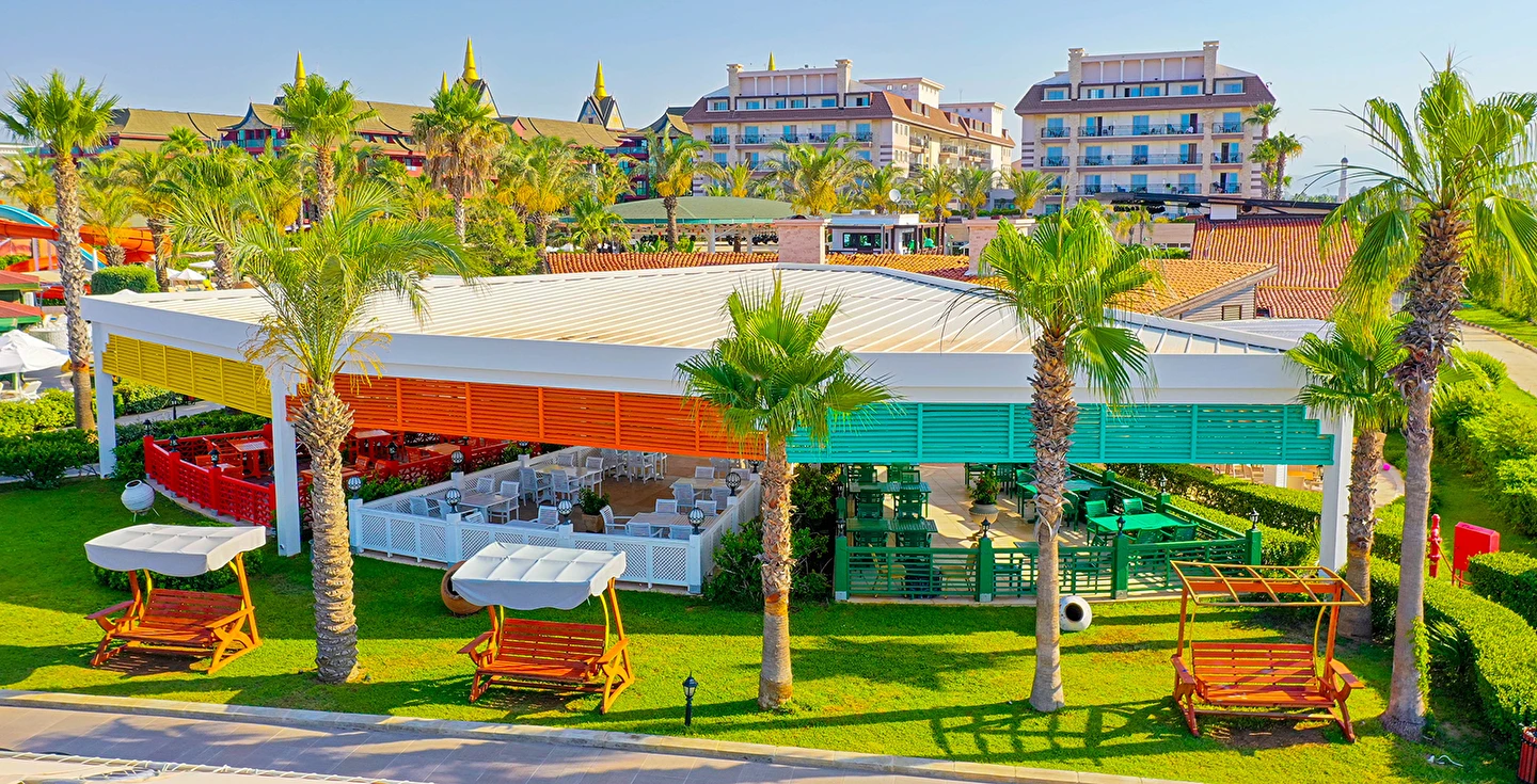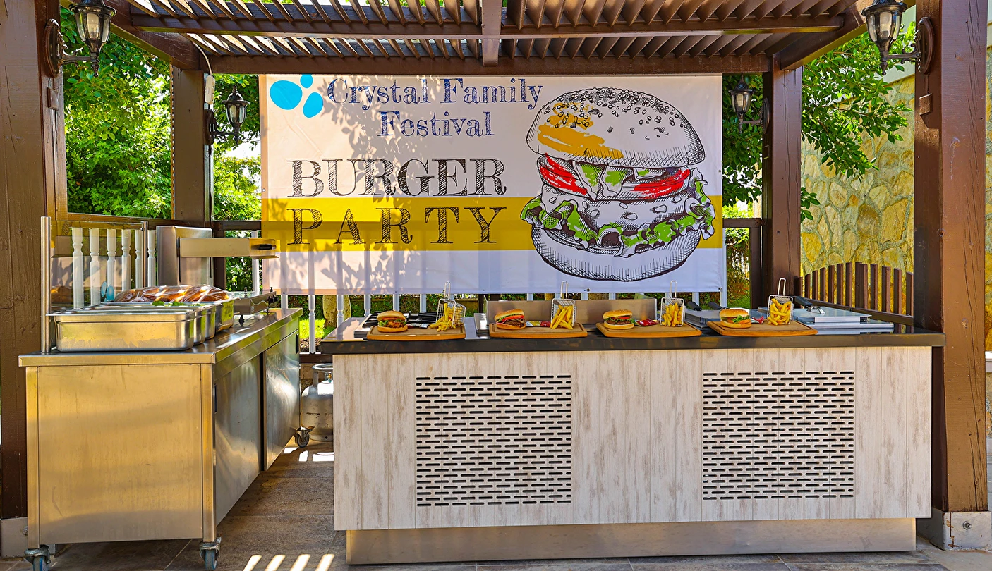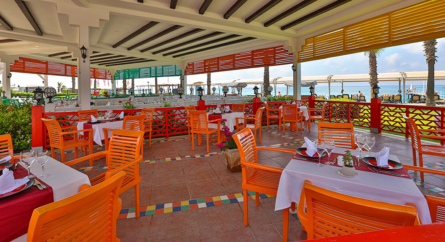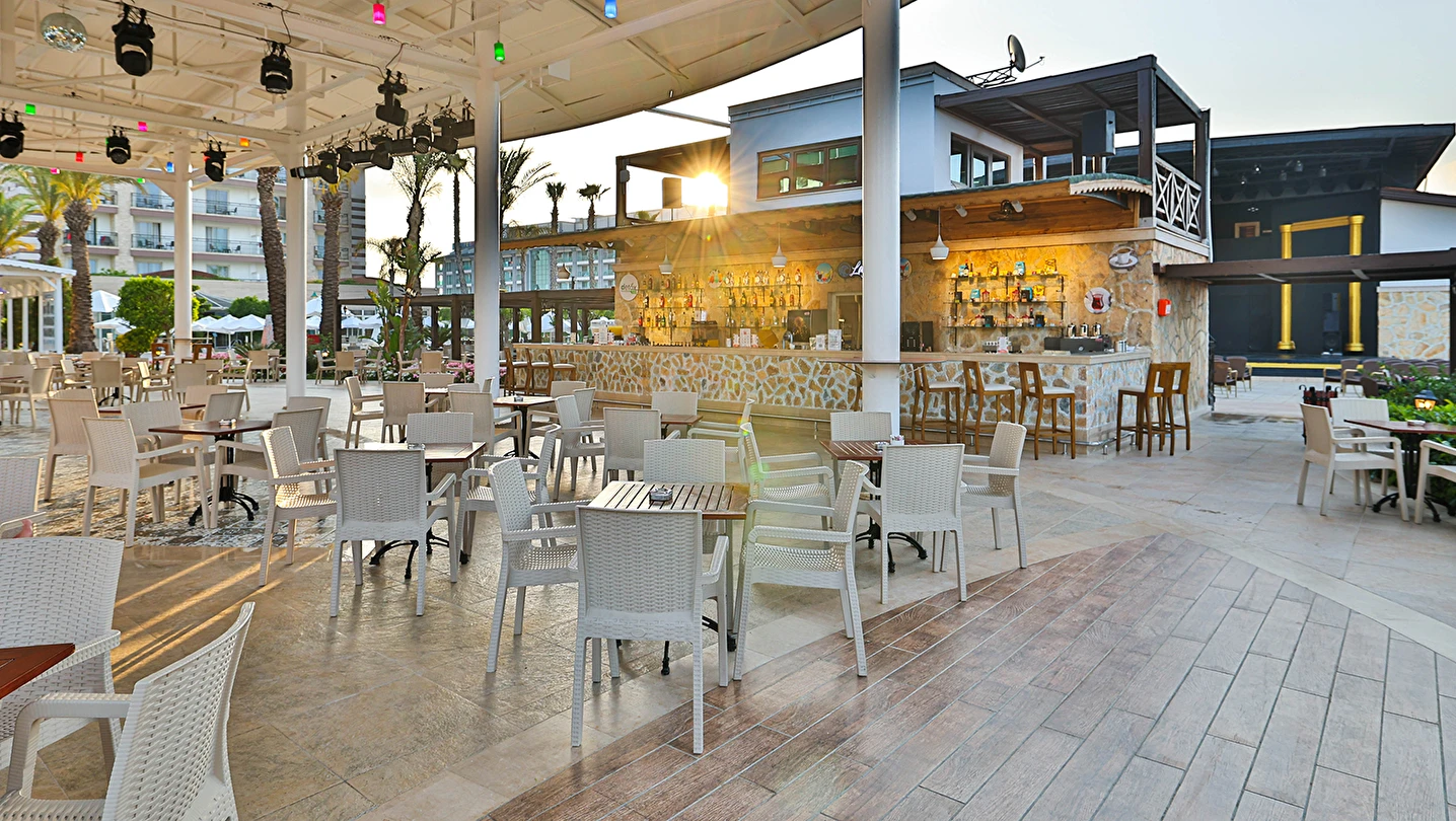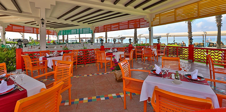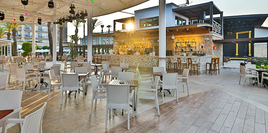 Sabah kahvaltısı, öğle ve akşam yemekleri açık büfe olup tesisin belirlediği markalar dahilinde yerli alkollü ve alkolsüz içecekler 24 saat ücretsizdir. Uluslararası yöresel kahveler ücretsizdir. Taze sıkılmış Sebze, Meyve Suları ve Enerji içecekleri, Tüm şişeli alkollü ürünler, tüm özel yerli-yabancı şaraplar ve şampanyalar, alkollü Premium içkiler (10 ve 12 yıllık ve üstü VSOP, XO Konyaklar), Alakart Restoranlarda tüm şarap, şampanya ve özel yemek siparişleri ekstra ücret ile servis edilmektedir. (Sofra Şarabı Hariç)