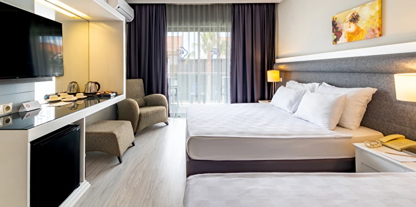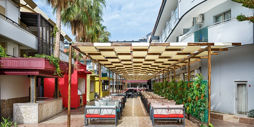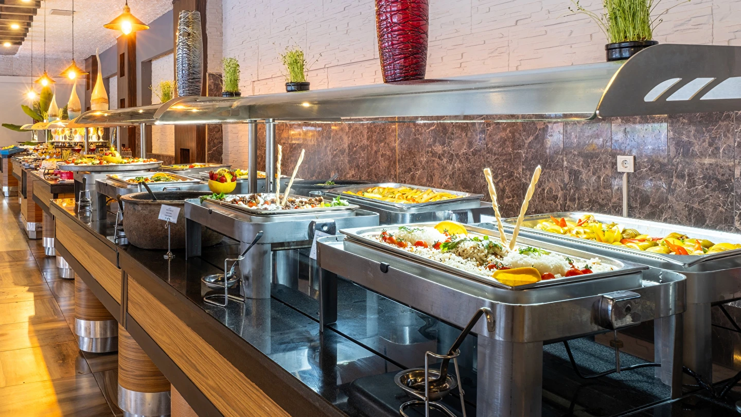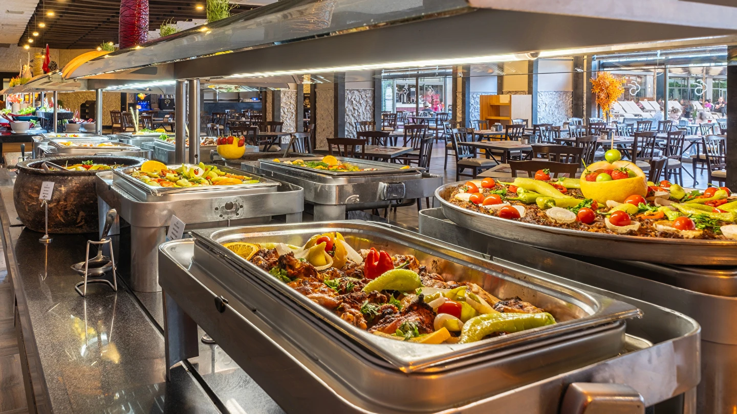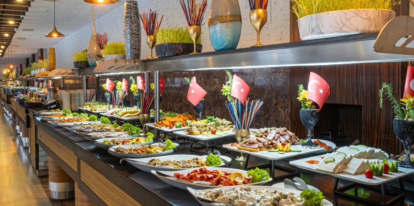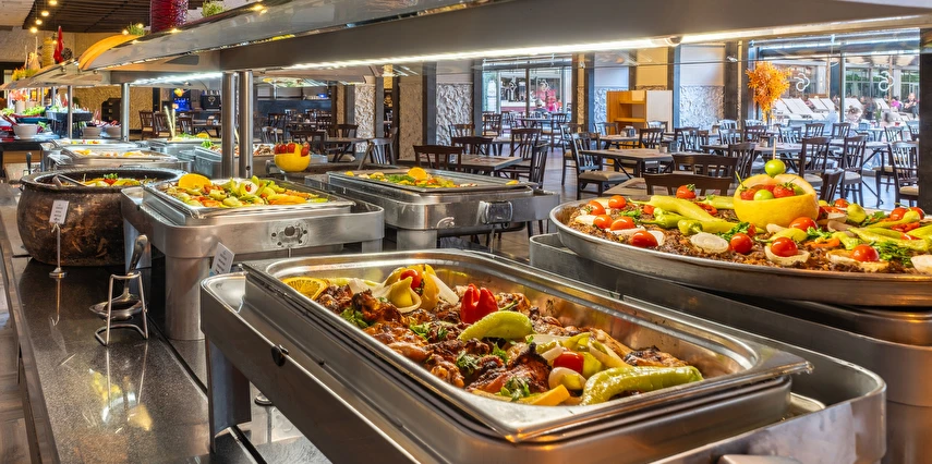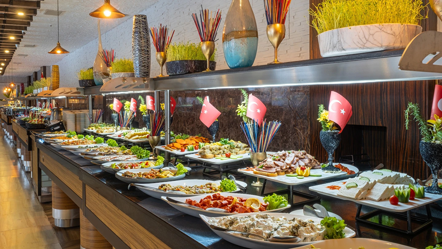 Sabah kahvaltısı, öğle ve akşam yemeği açık büfe olup, tesisin belirlemiş olduğu bazı import içecekler, yerli alkollü içecekler , sıcak ve soğuk alkolsüz içecekler 09:00 ile 00:00 saatleri arasında ücretsizdir. Saat 00:00 ile 10:00 saatleri arası çay, kahve ve su dışında tüm içecekler ücretlidir. Barlarda şişe ile içecek servisi yapılmamaktadır. Türk Kahvesi ücretsiz olarak sunulmaktadır. Tüm şişelenmiş yerli ve yabancı içecekler, yerli ve yabancı PREMIUM ve Özel içecekler, Taze sıkılmış meyve suları ücretlidir.