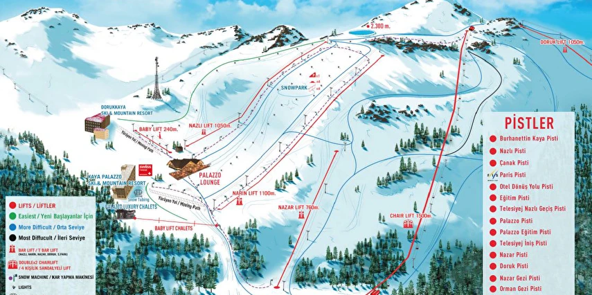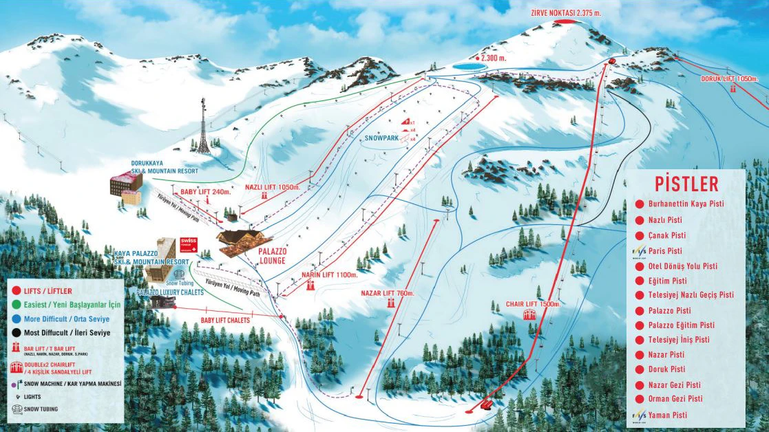 Kayak ve Snowboard ekipmanları, kıyafet kiralama ve ders hizmetleri ücretlidir.