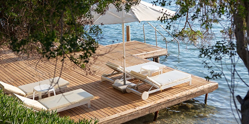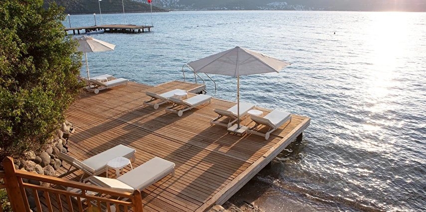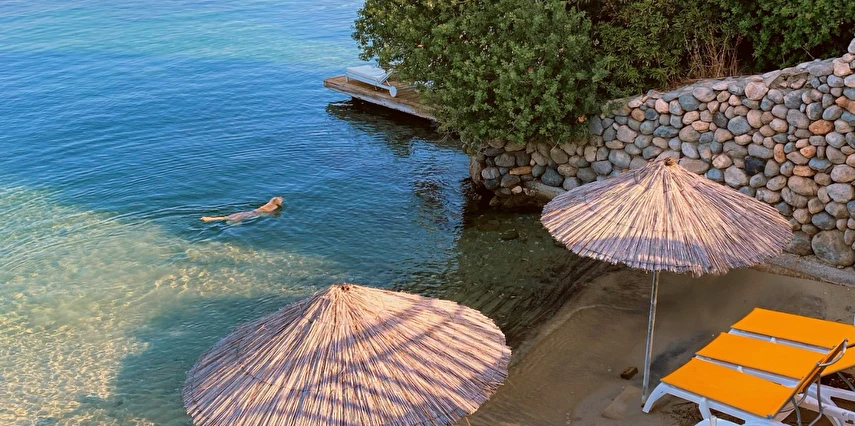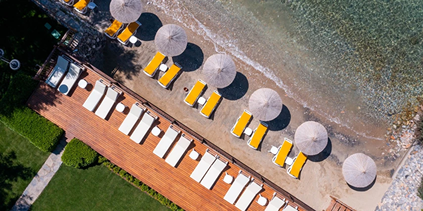 Denize sıfır konuma sahip tesisin, 150 m uzunluğunda kum ve çakıl plajı, platformu ve iskelesi bulunuyor. Şezlong, şemsiye, minder ve havlu ücretsiz.
