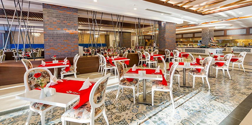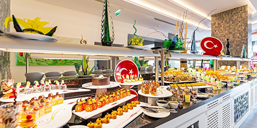 Sabah kahvaltısı, öğle yemeği ve akşam yemeği açık büfe olup, tesisin belirlemiş olduğu markalar dahilinde yerli alkollü ve alkolsüz içecekler 10:00 ile 24:00 saatleri arasında ücretsizdir. Taze sıkılmış meyve suları, yabancı içkiler, markalı lüks alkollü & alkolsüz içecekler, şişe içecekler ücretlidir. Türk Kahvesi ücretsizdir.