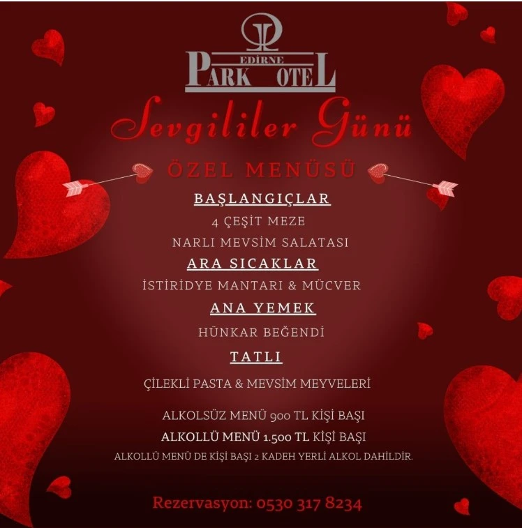 - Sevgililer Gününü, Sevdiğinizle Birlikte Geçirebileceğiniz,Unutulmaz bir Akşam Yemeği-Müzik Eşliğinde,En Güzel Şekilde Geçireceğiniz ,Günün Anlamını Taşıyan EDİRNE PARK OTEL RESTAURANT'ta Sizde Yerinizi Ayırtmak İçin Geç Kalmayın