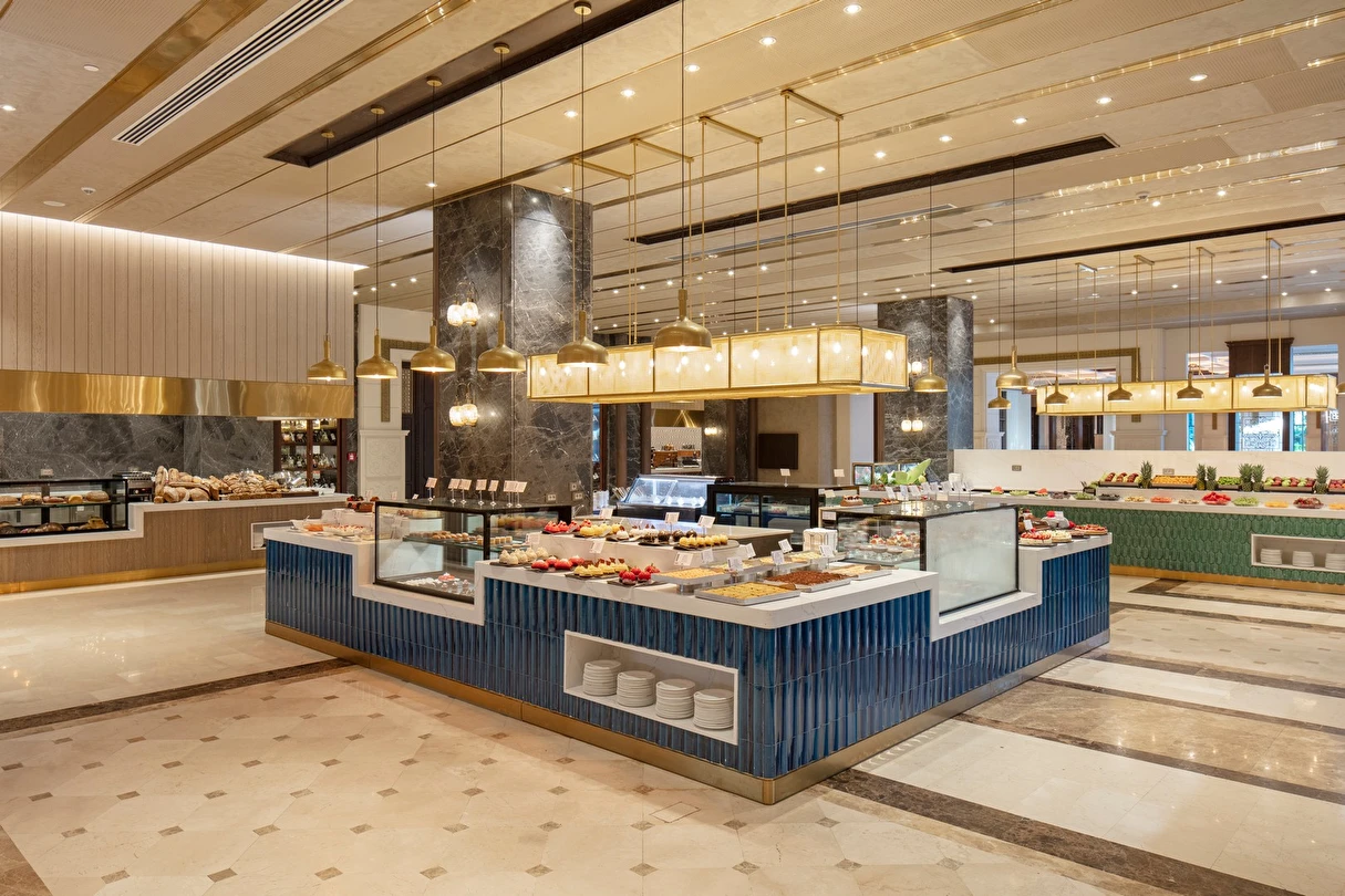 Sabah kahvaltısı, öğle yemeği ve akşam yemeği açık büfe olup, tesisin belirlemiş olduğu markalar dahilinde yerli alkollü ve alkolsüz içecekler 24 saat ücretsizdir.