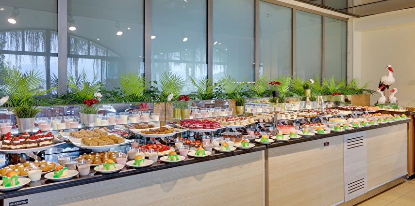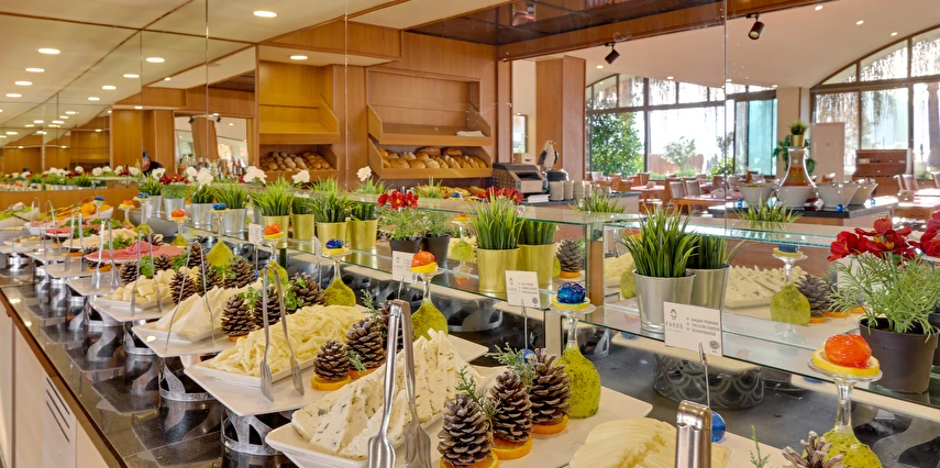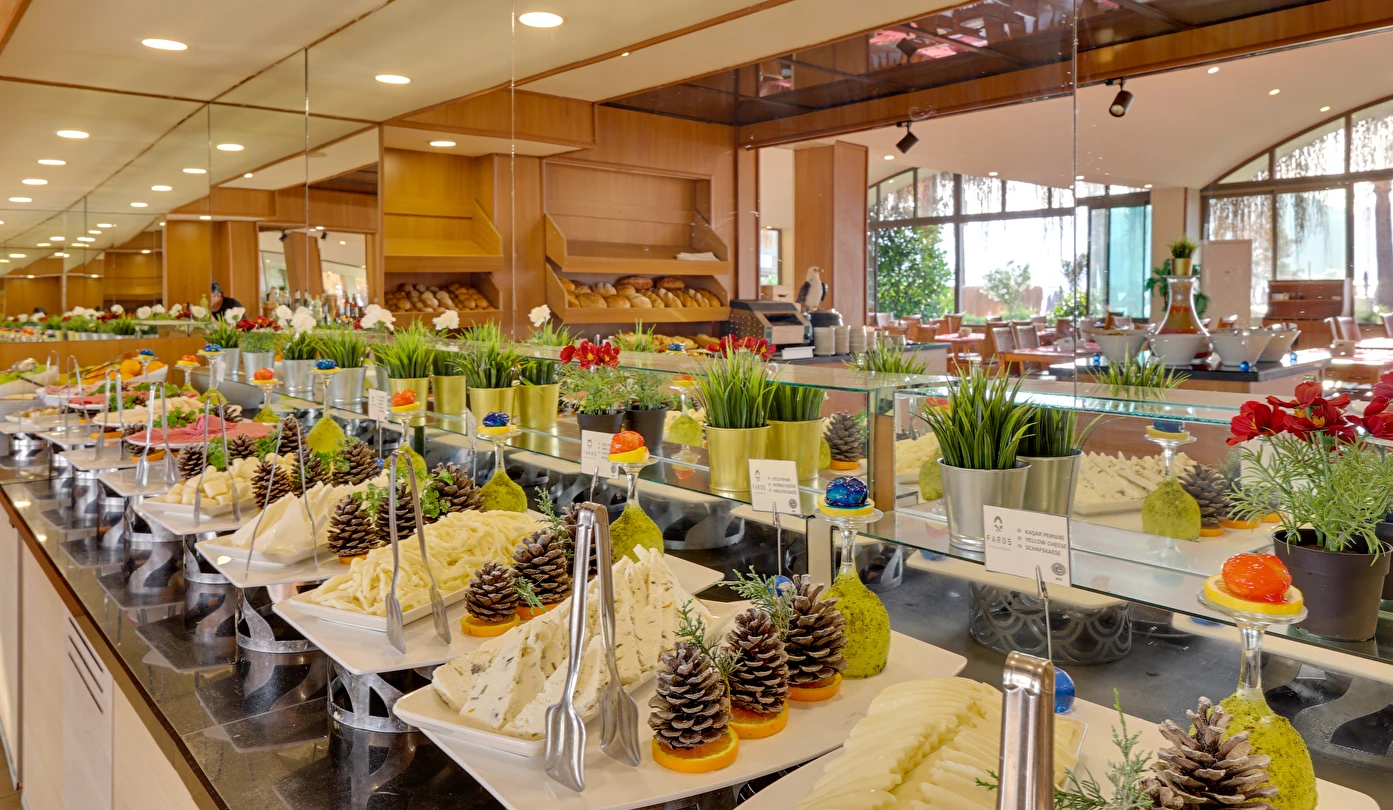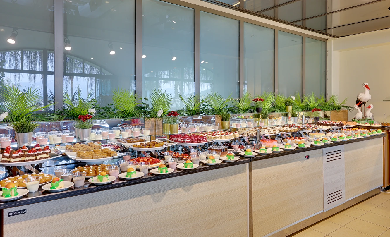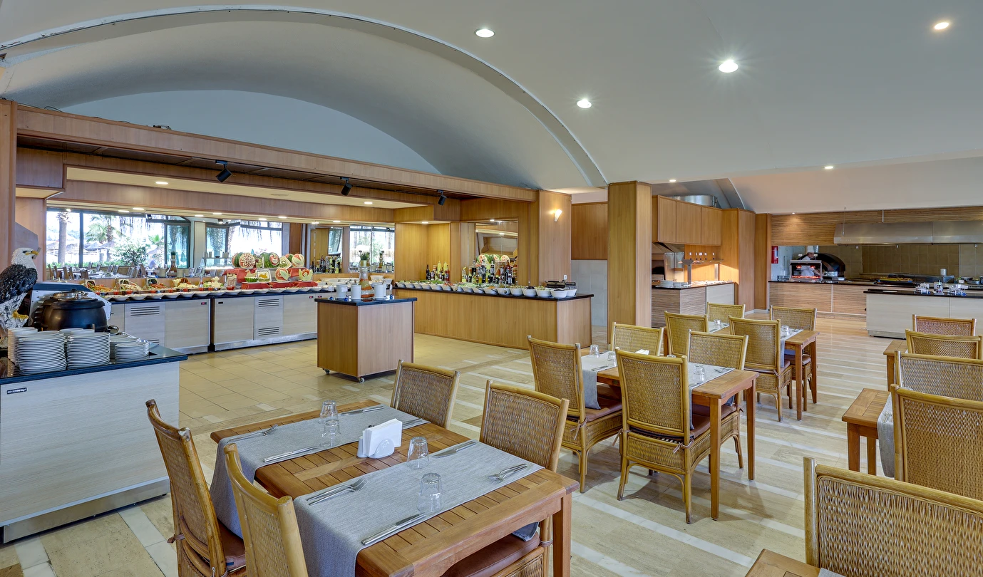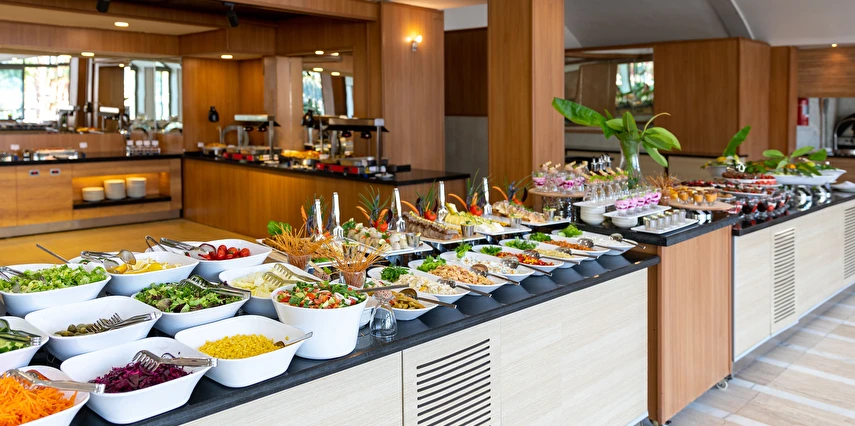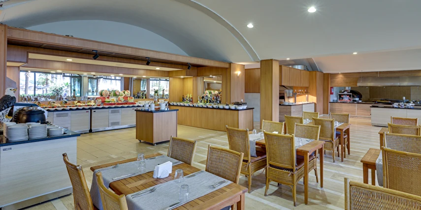 Her şey Dahil Konsepti 10:00-00:00 saatleri arasında geçerlidir. Her şey Dahil Konsepti otele giriş günü öğle yemeği ile başlar ve çıkış günü kahvaltı ile son bulur. 18 yaş altındaki misafirlere alkol servis edilmez. Konsept dahili içkiler ücretsiz servis edilir. Yerli içkiler, sofra şarabı, fıçı bira, meşrubatlar ve sıcak içecekler her şey dahil sistemi kapsamındadır. Her türlü ithal içki, kokteyller, özel şaraplar, taze sıkılmış meyve suları ve şişe içecekler ücretlidir. Tesiste 350 kişilik deniz manzaralı restoran bulunmaktadır. Ana restoranımızda kahvaltı, öğle ve akşam yemekleri, açık büfe olarak servis edilmektedir. Snack servis ve gece çorbası ana restoranda servis edilmektedir.
