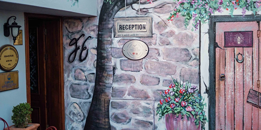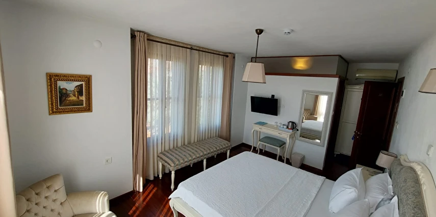 Ayvalık mimari özellikleri göz önününe alınarak eski ve yeni mimari öğelerin birbiriyle uyumu içerisinde inşa edilmiştir. Otelimizin duvarları sarımsak taşından yapılmış taş duvardır.