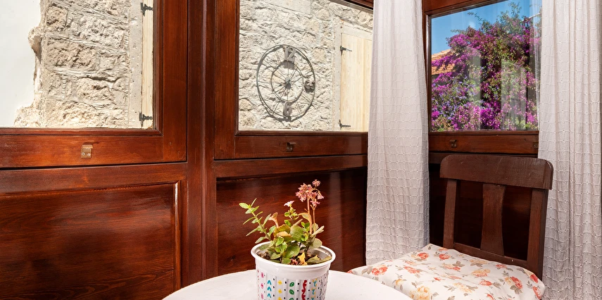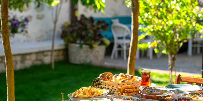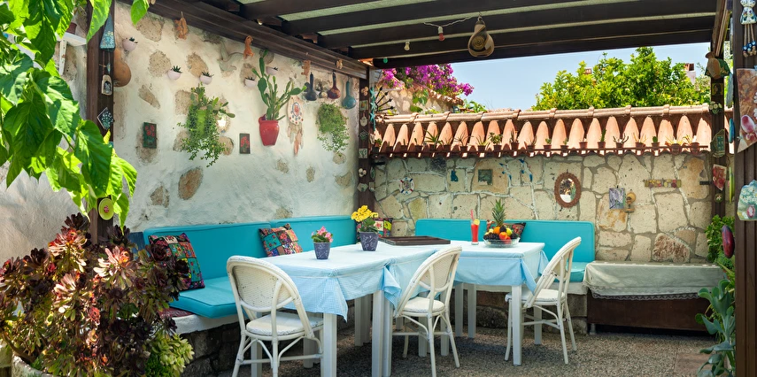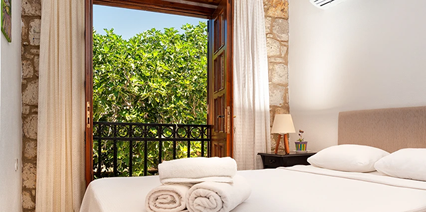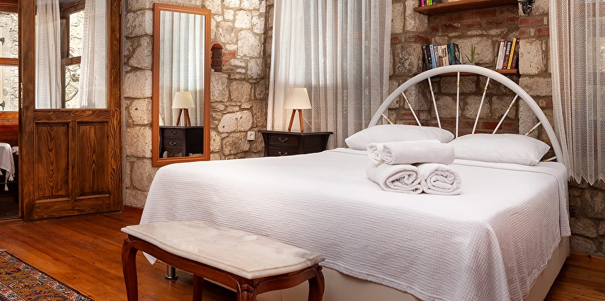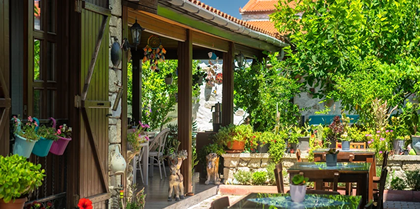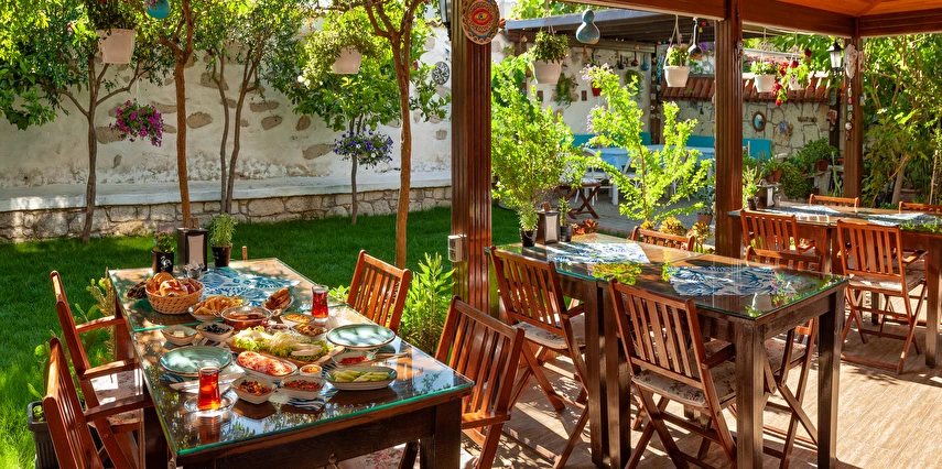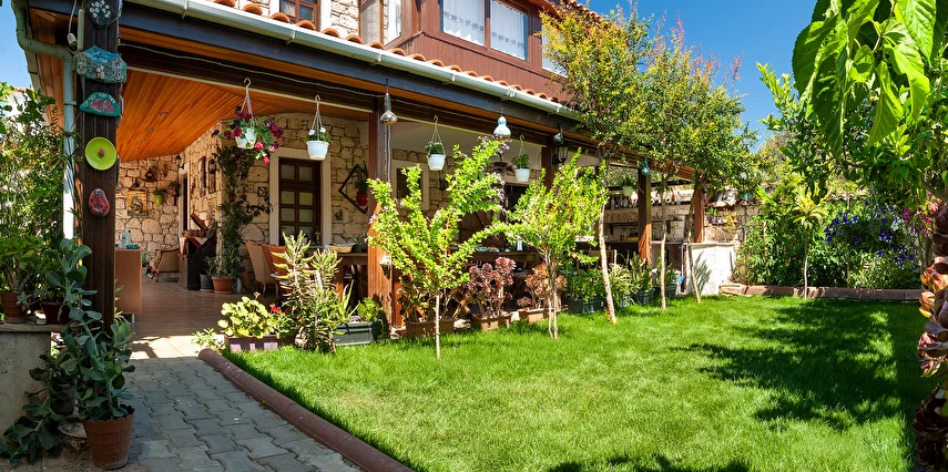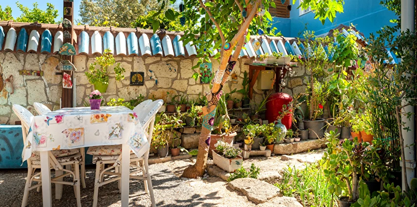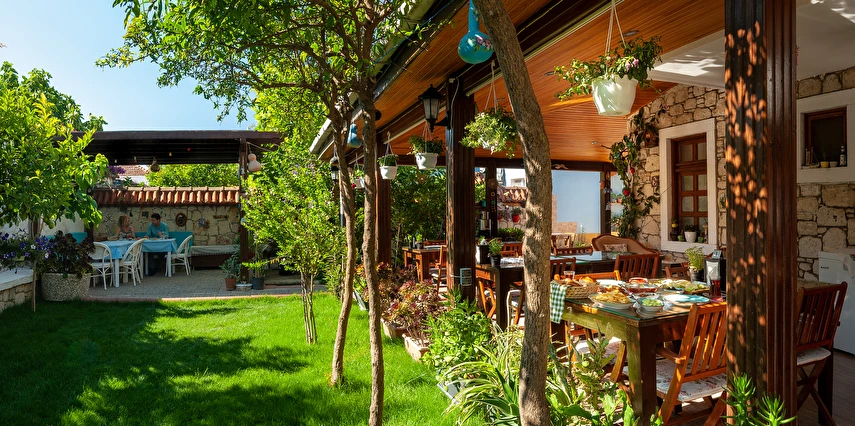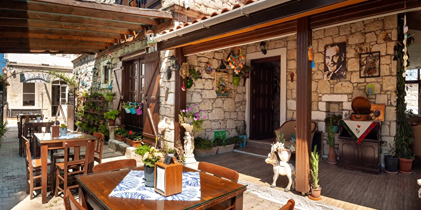 Yaklaşık 150 m2 büyüklüğünde olan bahçemizde ise nar, limon, zeytin, muz, dut ağaçları başta olmak üzere birçok meyve ağacı ile kendimiz yetiştirdiğimiz onlarca çeşidi bulunan yüzlerce kaktüs ve çiçek türü de bulunmaktadır. Misafirlerimiz bir yandan yemyeşil bahçemizde huzur bulurken bir yandan da otelimizin onlara sunduğu imkanlar eşliğinde bahçede hoş vakit geçirebiliyorlar. Bununla birlikte hem otel müşterilerimize hem de dışarıdan gelen misafirlerimize hizmet vermek için açtığımız cafe ve bistro bölümümüzde, Birgül’ün Mutfağından çıkan ve tamamen doğal ve ev yapımı olan çeşitli yemeklere, tatlılara, mezelere, aperatiflere, yerel tatlara ve içeceklere ulaşabiliyorsunuz. Böylece pikabımızda çalan günün ahengine uygun müziklerimizin de katkısıyla, kendinizle veya sevdiklerinizle Alaçatı’nın keyifli gecelerini tatmış oluyorsunuz. Alaçatı’nın benzersiz atmosferini bir taş yapıda yaşamaya ne dersin? Otantik dekorasyonu, cumbalı oda seçenekleri ve konforlu konaklama deneyimi sunan güler yüzlü personeli ile hizmet veriyor.