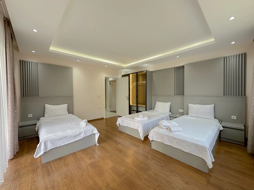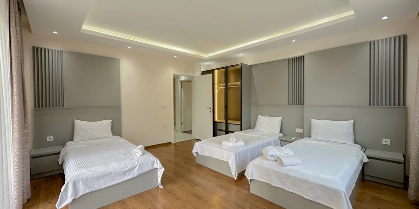 Tesisimiz; Delüks 2+1, Royal 3+1 ve King 3+1 Teraslı Dubleks Suit seçeneklerinden oluşur. Tüm suitlerimiz minimum 100 m² olup; Amerikan mutfaklı, oturma odalı ve iki katlı yapılarıyla aileler için geniş ve ferah yaşam alanları sunar. Odaların bir bölümü deniz manzaralı, bir bölümü ise doğa ve havuz manzaralıdır. Her iki katta klima ve WC bulunur; tüm odalar tam donanımlı mutfak ve yemek alanına sahiptir.