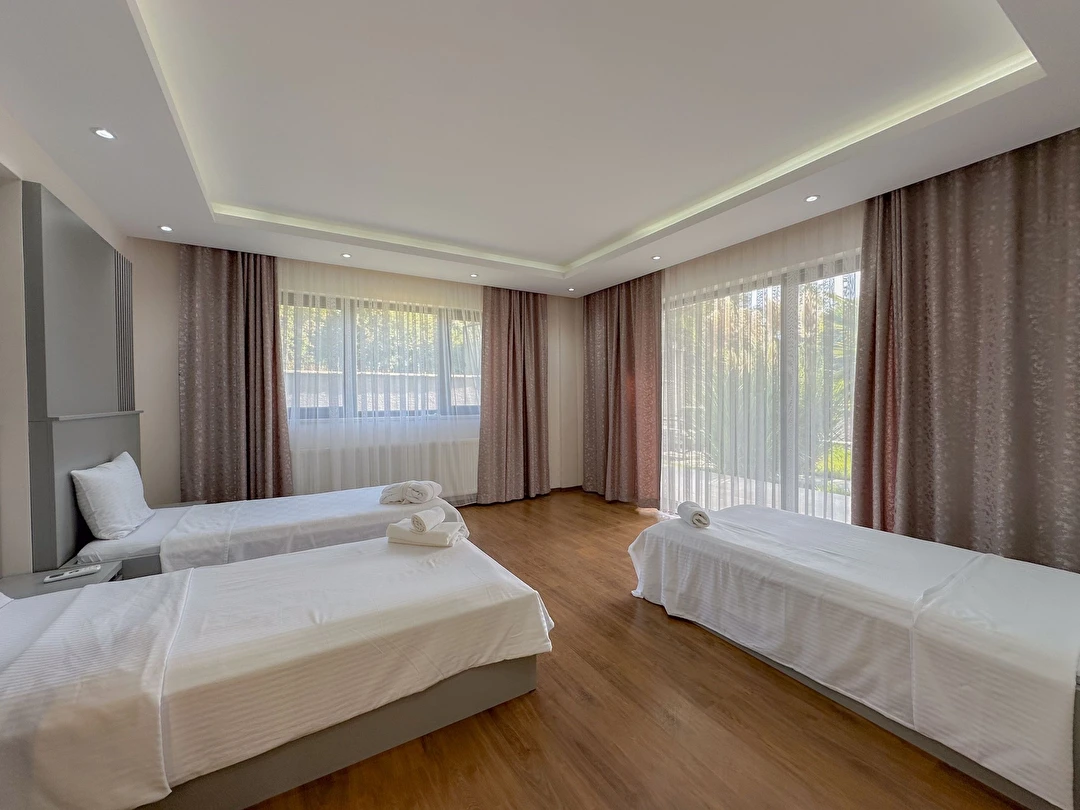 Tesisimiz sadece oda konsepti ile hizmet vermektedir. Bu yaklaşım, misafirlerimize günlerini kendi ritimlerinde planlama özgürlüğü sunar. Sabahları dilediğiniz saatte uyanabilir, kahvaltınızı hazırlayıp manzaralı balkonunuzda ailenizle keyifli anlar yaşayabilirsiniz.
