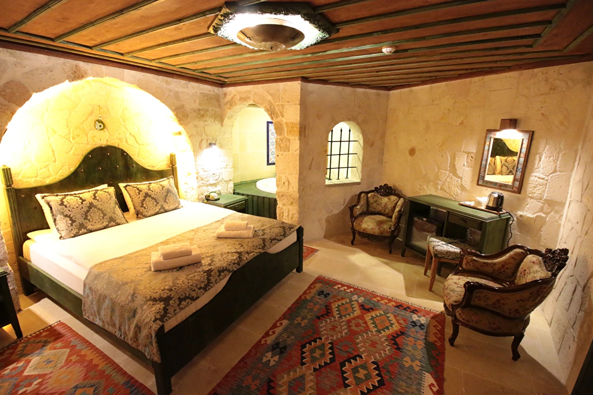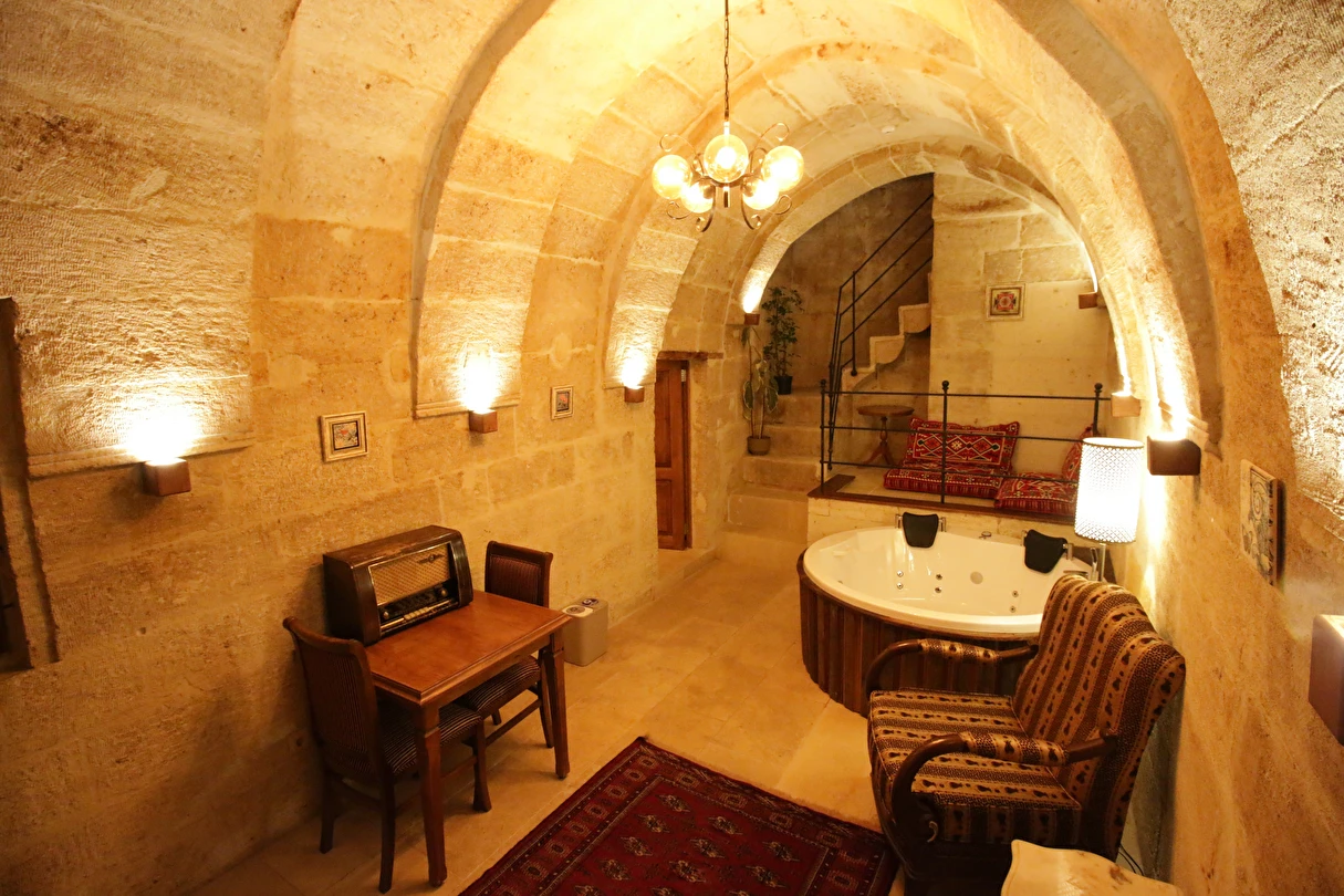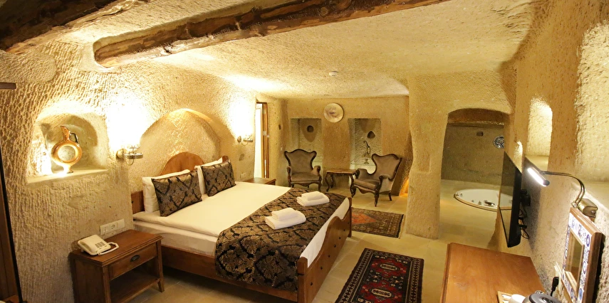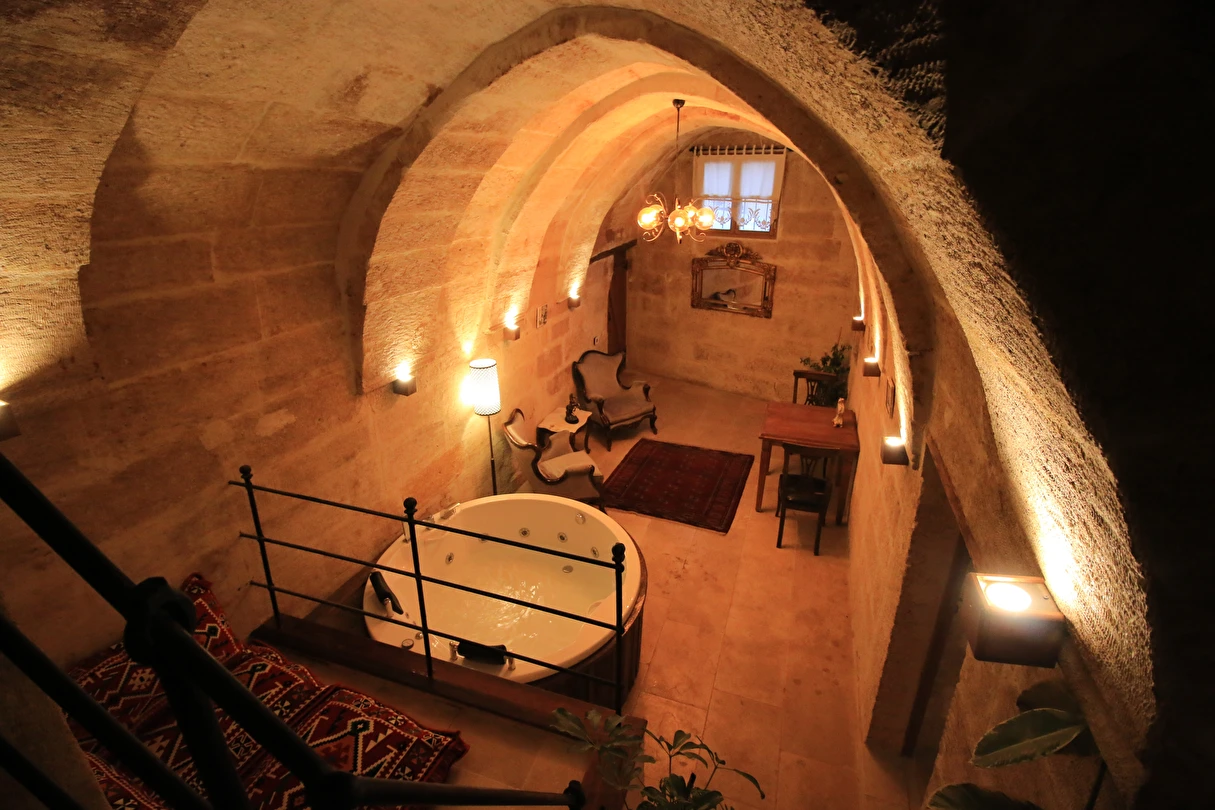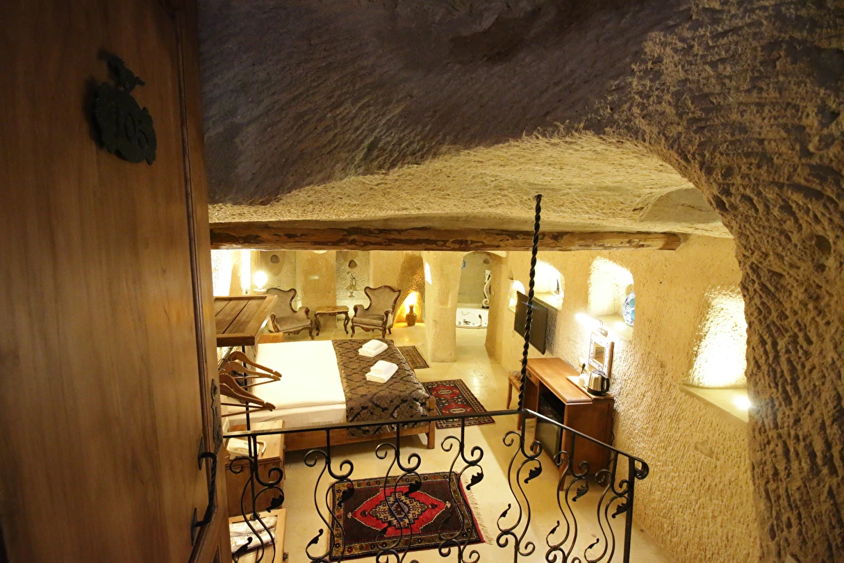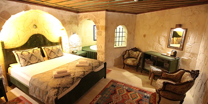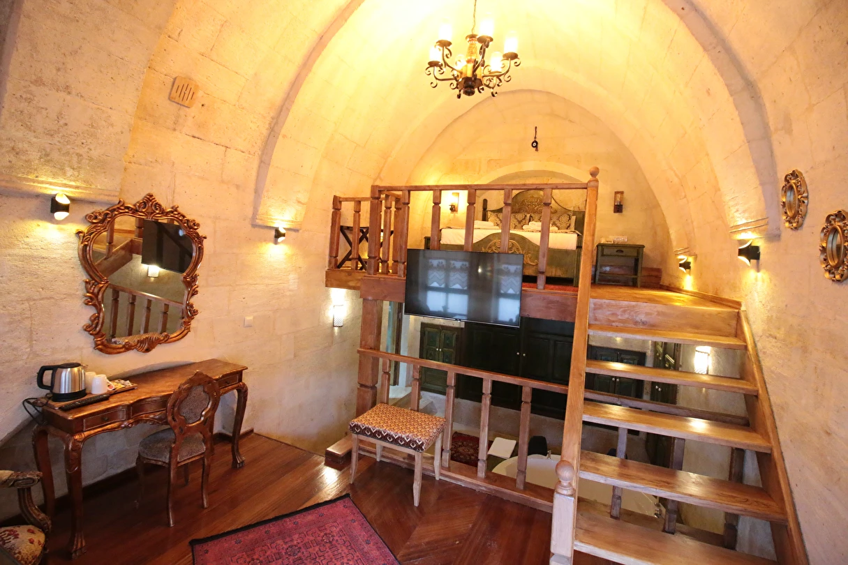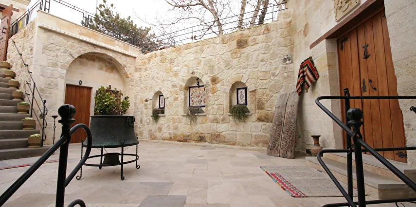 Adını Romalı bir asker olan Aziz Georgios'tan alan Georgios Cave Hotel, misafirlerimize Ürgüp'ün tarihi ve kültürel zenginlikleriyle iç içe bir konaklama deneyimi sunuyor. Kapadokya'nın benzersiz kaya oyma yapılarıyla çevrili olan otelimiz, Aziz Georgios Kilisesi'ne yakın konumu ve mistik atmosferiyle hizmetinizde. Geleneksel taş yapılar ve modern olanakların mükemmel bir uyum içinde sunulduğu Georgios Cave Hotel, siz konuklarımıza tarihi bir dokuda lüks ve rahatlık sağlıyor. Hem şehri keşfetmek isteyen gezginler hem de huzur arayanlar için ideal bir seçenek olan otelimiz, unutulmaz bir tatil için Kapadokya'nın kalbinde mükemmel bir başlangıç noktasıdır.